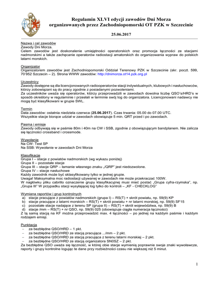 Regulamin XLVI edycji zawodów Dni Morza organizowanych przez Zachodniopomorski OT PZK w Szczecinie 25.06.2017 Nazwa i cel zawodów Zawody Dni Morza. Celem zawodów jest doskonalenie umiejętności operatorskich oraz promocja łączności ze stacjami nadmorskimi a także zachęcanie operatorów radiostacji amatorskich do organizowania wypraw do polskich latarni morskich. Organizator Organizatorem zawodów jest Zachodniopomorski Oddział Terenowy PZK w Szczecinie (skr. poczt. 599, 70-952 Szczecin – 2). Strona WWW zawodów: http://dnimorza.ot14.pzk.org.pl Uczestnicy Zawody dostępne są dla licencjonowanych radiooperatorów stacji indywidualnych, klubowych i nasłuchowców, którzy zobowiązani są do pracy zgodnie z posiadanymi pozwoleniami. Za uczestników uważa się operatorów, którzy przeprowadzili w zawodach dowolna liczbę QSO’s/HRD’s w sposób określony w regulaminie i przesłali w terminie swój log do organizatora. Licencjonowani nadawcy nie mogą być klasyfikowani w grupie SWL. Termin Data zawodów: ostatnia niedziela czerwca (25.06.2017). Czas trwania: 05.00 do 07.00 UTC. Wszystkie stacje biorące udział w zawodach obowiązuje 5 min. QRT przed i po zawodach. Pasma i emisje Zawody odbywają się w paśmie 80m i 40m na CW i SSB, zgodnie z obowiązującym bandplanem. Nie zalicza się łączności crossband i crossmode. Wywołanie Na CW: Test SP Na SSB: Wywołanie w zawodach Dni Morza Klasyfikacje Grupa I – stacje z powiatów nadmorskich (wg wykazu poniżej) Grupa II – pozostałe stacje Grupa III – stacje QRP – łamanie własnego znaku „/QRP” jest niedozwolone. Grupa IV – stacje nasłuchowe Każdy zawodnik może być sklasyfikowany tylko w jednej grupie. Uwaga! Maksymalna moc radiostacji używanej w zawodach nie może przekraczać 100W. W nagłówku pliku cabrillo oznaczenie grupy klasyfikacyjnej musi mieć postać „Grupa cyfra-rzymska”, np. „Grupa III” W przypadku stacji wysyłającej log tylko do kontroli – „KF - CHECKLOG” Wymiana raportów i grup kontrolnych a) stacje pracujące z powiatów nadmorskich (grupa I) – RS(T) + skrót powiatu, np. 59(9) KP b) stacje pracujące z latarni morskich – RS(T) + skrót powiatu + nr latarni morskiej, np. 59(9) SF15 c) pozostałe stacje nadające z terenu SP (grupa II) – RS(T) + skrót województwa, np. 59(9) B d) stacje /mm – RS(T) + nr QSO, np. 59(9) 025 (obowiązuje ciągła numeracja łączności) Z tą samą stacją na KF można przeprowadzić max. 4 łączności – po jednej na każdym paśmie i każdym rodzajem emisji. Punktacja za bezbłędne QSO/HRD – 1 pkt. za bezbłędne QSO/HRD ze stacją pracująca .../mm – 2 pkt. za bezbłędne QSO/HRD ze stacją pracująca z terenu latarni morskiej – 2 pkt. za bezbłędne QSO/HRD ze stacją organizatora SN0SZ – 2 pkt. Za bezbłędne QSO uważa się łączność, w której obie stacje wymienią poprawnie swoje znaki wywoławcze, raporty i grupy kontrolne logując te dane przy rozbieżności czasu nie większej niż 5 minut. 1 Regulamin XLVI edycji zawodów Dni Morza organizowanych przez Zachodniopomorski OT PZK w Szczecinie 25.06.2017 Stacje nasłuchowe obowiązuje poprawne odebranie znaków obu stacji oraz nadawanych przez nie grup kontrolnych punkty i mnożniki przyznawane są za obie wykazane w nasłuchu stacje ta sama stacja może być wykazana w dzienniku (będzie zaliczona) jeden raz danym rodzajem emisji i na danym paśmie (maksymalnie 4 razy = 2 pasma x 2 emisje) W kategorii SWL nie mogą być klasyfikowani licencjonowani nadawcy nawet jeśli nadal posiadają licencję SWL. Mnożniki Mnożnikami są powiaty nadmorskie wymienione poniżej. Mnożnik na danym paśmie liczy się jeden raz, niezależnie od emisji. Praca z powiatu nadmorskiego automatycznie zalicza się jako własny mnożnik dla pasma, na którym dana stacja pracowała. Wynik końcowy Suma punktów z obu pasm x suma mnożników z obu pasm. Nie ma potrzeby samodzielnego obliczania wyniku, ponieważ uczyni to program rozliczający zawody opracowany przez Marka SP7DQR. Dzienniki zawodów Organizator zaleca sporządzanie dzienników elektronicznych (darmowy program DQR_Log autorstwa SP7DQR dostępny jest na stronie autora [http://www.sp7dqr.pl]). Dzienniki elektroniczne należy przesłać na adres: [email protected] podając w temacie wiadomości znak wywoławczy stosowany w zawodach. Wymagany format Cabrillo; ewentualnie txt, fil. Dzienniki w formatach nie dających się przekonwertować do Cabrillo oraz z podanym czasem lokalnym (zamiast UTC) będą użyte tylko do kontroli. Uczestnik może przysyłać log zawodów dowolną ilość razy – komisja weźmie pod uwagę ostatni przysłany w terminie dziennik (poprzednie będą automatycznie nadpisywane). Dzienniki papierowe należy przesłać na adres: Polski Związek Krótkofalowców - Zachodniopomorski Oddział Terenowy w Szczecinie skr. poczt.599; 70-952 Szczecin w terminie do 31 lipca (decyduje data stempla pocztowego). Dzienniki przysłane po tym terminie będą użyte tylko do kontroli. Nagrody Dyplomy uczestnictwa dla wszystkich stacji. Statuetki dla stacji, które zajęły 1 miejsce w poszczególnych grupach. Zawody zostaną rozliczone do 30 września, a wyniki zostaną opublikowane w periodykach krótkofalarskich oraz na stronie WWW zawodów. Dyplomy będą rozesłane do uczestników poprzez oddziały terenowe PZK. Krótkofalowcy niebędący członkami PZK (w tym stacje zagraniczne) proszeni są o przesłanie odpowiedniej ilości znaczków pocztowych na przesłanie dyplomu kopertą formatu A4 (o nominale 5zł lub 2IRC). Zawody rozliczane są za pomocą programu sprawdzającego autorstwa Marka SP7DQR. Wykaz powiatów leżących na terenie województw nadmorskich: AG, AW, BG, CE, CJ, CS, CU, DP, DY, EA, EB, EL, GD, GF, GL, GN, IY, KC, KG, KP, KZ, LA, LL, MB, MY, NR, OV, PK, RU, SF, SG, SL, SZ, TC, UG, UK, WC, WJ, WN, YA, YW, YR, ZE. Wykaz latarni morskich: 01 – Gdańsk Port Północny, 02 – Krynica Morska, 03 – Hel