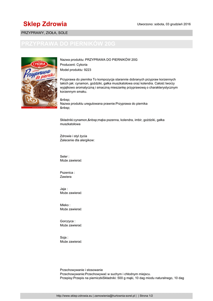 Sklep Zdrowia Utworzono: sobota, 03 grudzień 2016 PRZYPRAWY, ZIOŁA, SOLE PRZYPRAWA DO PIERNIKÓW 20G Nazwa produktu: PRZYPRAWA DO PIERNIKÓW 20G Producent: Cykoria Model produktu: 9223 Przyprawa do piernika To kompozycja starannie dobranych przypraw korzennych takich jak: cynamon, goździki, gałka muszkatołowa oraz kolendra. Całość tworzy wyjątkowo aromatyczną i smaczną mieszankę przyprawową o charakterystycznym korzennym smaku. Nazwa produktu uregulowana prawnie:Przyprawa do piernika Składniki:cynamon, mąka pszenna, kolendra, imbir, goździki, gałka muszkatołowa Zdrowie i styl życia Zalecenie dla alergikow: Seler : Może zawierać Pszenica : Zawiera Jaja : Może zawierać Mleko : Może zawierać Gorczyca : Może zawierać Soja : Może zawierać Przechowywanie i stosowanie Przechowywanie:Przechowywać w suchym i chłodnym miejscu. Przepisy:Przepis na pierniczkiSkładniki: 500 g mąki, 10 dag miodu naturalnego, 10 dag http://www.sklep-zdrowia.eu | [email protected] | | Strona 1/2 Sklep Zdrowia Utworzono: sobota, 03 grudzień 2016 PRZYPRAWY, ZIOŁA, SOLE PRZYPRAWA DO PIERNIKÓW 20G miodu sztucznego, 20 dag cukru pudru, 12 dag margaryny, 1 jajko, 1 łyżeczka sody Cykoria, 1 opakowanie przyprawy do piernika Cykoria.Wykonanie: Nad stolnicą przesiać mąkę wymieszaną razem z sodą, uformować gorkę. W przesianej mące zrobić wgłębienie i wlać w nie rozpuszczony miod, następnie dodać przyprawę do piernika, cukier puder, tłuszcz oraz jajko. Wszystkie składniki razem zagnieść i wyrabiać aż ciasto będzie lśniące. Z tak wyrobionego ciasta odkroić część i rozwałkować do grubości 5 mm. Wykroić pierniczki. Blachę smarujemy tłuszczem lub wykładamy papierem do pieczenia, następnie układamy surowe pierniczki i wkładamy do nagrzanego piekarnika. Pierniczki pieczemy w temp. ok. 180°C przez ok. 10 minut. Gotowe ciastka możemy polukrować i ozdobić. Adres producenta:CYKORIA S.A.Wierzchosławice 1588-140 Gniewkowo Cena: 1.00zł Dostępność: Ten produkt został dodany do sklepu w dniu czwartek, 01 grudzień 2016 http://www.sklep-zdrowia.eu | [email protected] | | Strona 2/2