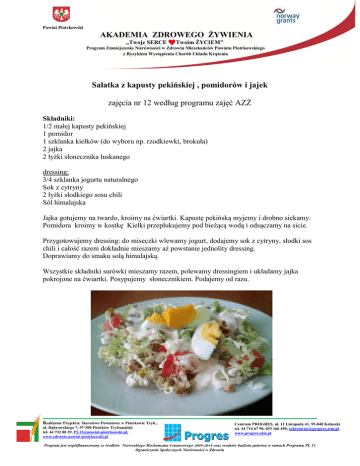 Powiat Piotrkowski AKADEMIA ZDROWEGO ŻYWIENIA „Twoje SERCE Twoim ŻYCIEM” Program Zmniejszenia Nierówności w Zdrowiu Mieszkańców Powiatu Piotrkowskiego z Ryzykiem Wystąpienia Chorób Układu Krążenia Sałatka z kapusty pekińskiej , pomidorów i jajek zajęcia nr 12 według programu zajęć AZŻ Składniki: 1/2 małej kapusty pekińskiej 1 pomidor 1 szklanka kiełków (do wyboru np. rzodkiewki, brokuła) 2 jajka 2 łyżki słonecznika łuskanego dressing: 3/4 szklanka jogurtu naturalnego Sok z cytryny 2 łyżki słodkiego sosu chili Sól himalajska Jajka gotujemy na twardo, kroimy na ćwiartki. Kapustę pekińską myjemy i drobno siekamy. Pomidora kroimy w kostkę Kiełki przepłukujemy pod bieżącą wodą i odsączamy na sicie. Przygotowujemy dressing: do miseczki wlewamy jogurt, dodajemy sok z cytryny, słodki sos chili i całość razem dokładnie mieszamy aż powstanie jednolity dressing. Doprawiamy do smaku solą himalajską. Wszystkie składniki surówki mieszamy razem, polewamy dressingiem i układamy jajka pokrojone na ćwiartki. Posypujemy słonecznikiem. Podajemy od razu. Realizator Projektu: Starostwo Powiatowe w Piotrkowie Tryb., ul. Dąbrowskiego 7, 97-300 Piotrków Trybunalski tel. 44 732 88 29, [email protected], www.zdrowie.powiat-piotrkowski.pl Centrum PROGRES, ul. 11 Listopada 41, 95-040 Koluszki tel. 44 714 67 90, 693 166 450, [email protected], www.progres.atm.pl Program jest współfinansowany ze środków Norweskiego Mechanizmu Finansowego 2009-2014 oraz środków budżetu państwa w ramach Programu PL 13 Ograniczanie Społecznych Nierówności w Zdrowiu Powiat Piotrkowski AKADEMIA ZDROWEGO ŻYWIENIA „Twoje SERCE Twoim ŻYCIEM” Program Zmniejszenia Nierówności w Zdrowiu Mieszkańców Powiatu Piotrkowskiego z Ryzykiem Wystąpienia Chorób Układu Krążenia Źródło: Izabela Dziedzińska – instruktor Akademii Zdrowego Żywienia Świeże kiełki obfitują w wartościowe białka i kwasy tłuszczowe omega-3, są także bogate w błonnik. Regularne ich spożywanie przeciwdziała wielu poważnym schorzeniom, wzmacnia system odpornościowy, uzupełnia niedobory witamin i składników mineralnych, a także działa przeciwnowotworowo. Kiełki brokuła zawierają likwidujące wolne rodniki sulforafany stosowane w profilaktyce nowotworów. Zawartość tej cennej substancji w kiełkujących nasionach jest nawet 20-30 razy większa niż w dojrzałej roślinie. Z kolei o lucernie powinni pamiętać wegetarianie. Roślinę tę Arabowie nazwali Alf-al-fa (ojciec wszelkiego pożywienia). Jej kiełki są fantastycznym źródłem żelaza i łatwo przyswajalnego białka. Ciekawostką jest, że starożytni arabscy wojownicy nie tylko karmili swoje konie lucerną, lecz jedli ją sami, co pozwalało im sprostać trudom morderczych wypraw. Realizator Projektu: Starostwo Powiatowe w Piotrkowie Tryb., ul. Dąbrowskiego 7, 97-300 Piotrków Trybunalski tel. 44 732 88 29, [email protected], www.zdrowie.powiat-piotrkowski.pl Centrum PROGRES, ul. 11 Listopada 41, 95-040 Koluszki tel. 44 714 67 90, 693 166 450, [email protected], www.progres.atm.pl Program jest współfinansowany ze środków Norweskiego Mechanizmu Finansowego 2009-2014 oraz środków budżetu państwa w ramach Programu PL 13 Ograniczanie Społecznych Nierówności w Zdrowiu