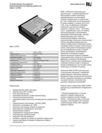 STEROWNIK SILNIKÓW DWUFAZOWYCH BIPOLARNYCH SMC 127RP SMC 127RP Typ Napięcie pracy Maksymalny prąd fazowy Nastawienie prądu Automat. redukcja prądu Rodzaj pracy Częstotliwość choppowania Podział krokowy Częstotliwość kroku Sygnały wejściowe Optoizolacja Prąd sygn. wejściowych Zakres temperatur pracy Wskaźnik zasilania Połączenie silnika Połączenie sygnałów Wymiary Sposób mocowania SMC 127RP DC 24 do 72V 7,8 A DIP switch Tak, do 65% Bipolarny chopper PWM 20kHz do 1/256 0 do 300 kHz TTL, CMOS Dla wejść 20 mA 0 do 400C Dioda LED Combicon Combicon 120*97*48 mm Śruby M3 Właściwości: • • • • • • • • • • • • • • • • zaawansowany układ sterujący, stopnie mocy FET lowRon, druk wielowarstwowy, zamknięta obudowa z profilu aluminiowego, ochrona przeciwzwarciowa, ustawianie prądu za pomocą miniaturowych przełączników DIP, zaawansowana technologia, montażu SMD, mikrokrok z podziałem do 1/256, stworzony dla obsługi silników 2-fazowych, automatyczne kształtowanie sinusoidy, optoizolowane wejścia, częstotliwość choppowania 20kHz, automatyczna redukcja prądu, wskaźnik LED dla zasilania, zasilanie i sygnały do silnika na listwach rozłącznych, sygnały sterujące na listwach rozłącznych (złącza w komplecie). SMC 127RP jest mikrokrokowym, dynamicznym, wysokonapięciowym* sterownikiem silnika krokowego, zaprojektowanym do sterowania silników dwufazowych o prądzie fazy do 7.8A. Użytkownik ma do dyspozycji 8 nastaw prądów z zakresu od 2.8 do 7.8A, oraz 14 głębokości podziałów krokowych przy jednym napięciu zasilania z zakresu +24V.. +72V (80V max.), częstotliwość kroku do 300kHz. Korzyścią płynącą z zastosowania sterownika mikrokrokowego, zamiast pełnokrokowego, jest znaczna minimalizacja efektów rezonansu mechanicznego. Rezonans mechaniczny silnika najczęściej pojawia się przy małych prędkościach obrotowych silnika i skutkuje utratą momentu i synchronizmu silnika. Sterowanie mikrokrokowe opiera się na kształtowaniu prądu w fazach silnika przebiegiem sinusoidalnym. Sterownik w przedziale między dwoma fizycznymi krokami wystawia odpowiednią ilość (zależną od ustawionej głębokości podziału) mikrokroków, dzięki którym możliwe jest kształtowanie przebiegu wartości prądu w kolejnych krokach składających się na jeden okres zbliżonego do kształtu sinusoidy. Sterownik SMC127RP wykonany jest w aluminiowej obudowie z radiatorem zapewniającym chłodzenie pasywne. Rozłączne listwy zaciskowe dla zasilania, silnika i sygnałów sterujących pozwalają na szybki montaż i demontaż bez potrzeby odkręcania przewodów. Stopnie mocy w sterowniku SMC127RP pracują przy częstotliwości choppowania 20kHz. * „Wysokonapięciowym” w sensie stosunku napięcia zasilania do wartości napięcia znamionowego silnika – forsowanie prądu za pomocą choppera. Na przykład 2,5V napięcia znamionowego silnika, 60V napięcia zasilania napędu. Producent zastrzega sobie możliwość zmiany parametrów technicznych bez powiadomienia i ograniczonej dostępności produktów z magazynu.