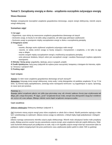 Temat 5: Zarządzamy energią w domu - urządzenia oszczędnie zużywające energię Słowa kluczowe Wydajne energetycznie (oszczędne) urządzenia gospodarstwa domowego, zużycie energii elektrycznej, miernik zużycia energii elektrycznej. Scenariusz zajęć 1) Cel zajęć: – Wyjaśnienie, czym różnią się nowoczesne urządzenia gospodarstwa domowego od starych – Zwrócenie uwagi, że koszty to nie tylko zakup urządzenia, ale także jego późniejsze użytkowanie – Zwrócenie uwagi na powiązanie między oszczędzaniem energii w domu a oszczędnością pieniędzy 2) Osiągnięcia ucznia Uczeń: - rozumie, dlaczego warto użytkować urządzenia zużywające mało energii - rozumie, że należy zwrócić uwagę na koszty związane z korzystaniem z urządzenia, a nie tylko na jego cenę w sklepie - rozumie związek między oszczędzaniem energii a możliwością oszczędzania pieniędzy. - umie planować działania, których celem jest oszczędność energii i zasobów finansowych (wybiera optymalne rozwiązanie). 3) Metody i formy pracy: pogadanka, dyskusja, praca w grupach, projekt. 4) Środki dydaktyczne: karty pracy (załączniki do wyboru przez nauczyciela), komputery z dostępem do Internetu, etykiety i broszury o sprzętach AGD. 5) Przebieg zajęć: Część wstępna Pytanie: Co różni nowe urządzenia gospodarstwa domowego od tych starszych? Komentarz: Zużywają mniej energii elektrycznej, mniej wody i mniej detergentów niż podobne urządzenia 10 czy 15 lat temu. Są również lepiej zaprojektowane, zawierają nowe rozwiązania techniczne i są wygodniejsze w użyciu. Sprawiają, że nasze życie jest prostsze. Pamietaj, że… Kupując jakieś urządzenie płacisz nie tylko jego pierwotną cenę, ale również opłacasz koszty jego użytkowania tak długo, jak z niego korzystasz. W ciągu „życia“ urządzenia koszty wody, energii oraz detergentów mogą być wielokrot− nie wyższe niż cena zakupu. Dlatego właśnie warto kupić urządzenie energooszczędne. Część zasadnicza Zabawa edukacyjna: Elektryczny detektyw (załącznik 1). Cel: Uczniowie mierzą zużycie energii przez różne urządzenia w szkole (lub w domu). Wyniki pomiarów zapisują w tabelach i przedstawiają na wykresach. Zabawa zwraca uwagę na zależności, o których będą mogli podyskutować z kolegami z grupy. Zabawa wymaga zastosowania miernika zużycia prądu elektrycznego. Miernik może odczytywać bardzo małe przepływy prądu, dlatego powinno uważać się przy sprawdzaniu zużycia energii, przez urządzenia takie jak czajnik elektryczny. Większość kuchenek elektrycznych jest podłączona na stałe, więc w ich wypadku zużycie energii może być oszacowane tylko na podstawie etykiet energetycznych lub przez przeliczenie czasu użytkowania (jeden palnik to około 1kW na godzinę). 15 Przebieg zabawy: 1) Nauczyciel dzieli klasę na grupy „detektywów“ i przydziela im różne urządzenia do zbadania (ew. różne miejsca na terenie szkoły, np. pracownia komputerowa, kuchnia, laboratorium, wybrane klasy, pokój nauczycielski, itp.). 2) Objaśnia przebieg zabawy i rozdaje mierniki i pokazuje, jak z nich prawidłowo i bezpiecznie korzystać. 3) Omawia warunki bezpieczeństwa (praca z urządzeniami pod prądem). 4) Określa czas przebiegu zabawy i wysyła grupy do pracy (cały czas nadzoruje jej przebieg). 5) Po zakończeniu, wypełnieniu tabel i wykonaniu obliczeń przedstawiciele poszczególnych grup referują otrzymane wyniki. Ćwiczenie 2: Zaprojektuj własną kuchnię (załącznik 2). Praca indywidualna lub w małych grupach. Cel: Zaprojektowanie własnej kuchni, wybór urządzeń na podstawie etykiet energetycznych i broszur informacyjnych, wykorzystanie Internetowych systemów informacyjnych, obliczanie kosztów utrzymania sprzętów, oszczędności i poziomu emitowanych zanieczyszczeń. Potrzebne materiały: etykiety produktów i broszury ze sklepów. Przebieg ćwiczenia: zgodnie z wytycznymi zawartymi w załączniku. Część końcowa Podsumowanie ćwiczeń i wnioski. 6) Propozycje pracy domowej Ochrona środowiska = oszczędność pieniędzy. Uzupełnij tabelę: Wyszczególnienie Żarówka kompaktowa (energooszczędna) Żarówka tradycyjna 1 sztuka o mocy 20W 10 sztuk o mocy 100W 47,40 237,00 Koszt zakupu Koszt zużytej energii Koszt całkowity Oszczędność X 16