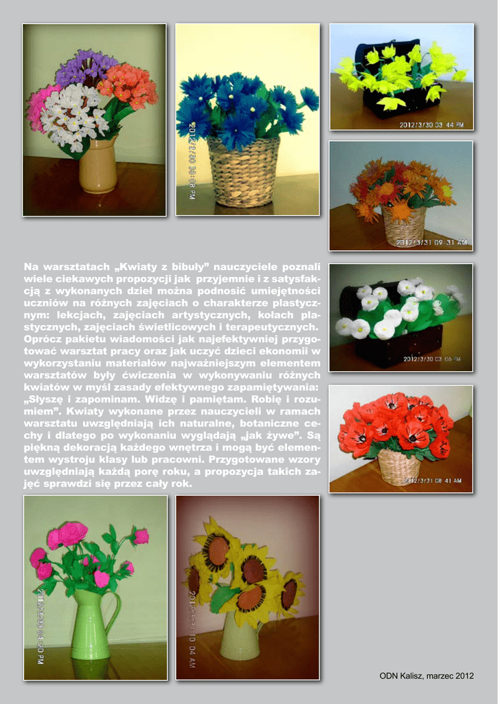 Na warsztatach „Kwiaty z bibuły” nauczyciele poznali wiele ciekawych propozycji jak przyjemnie i z satysfakcją z wykonanych dzieł można podnosić umiejętności uczniów na różnych zajęciach o charakterze plastycznym: lekcjach, zajęciach artystycznych, kołach plastycznych, zajęciach świetlicowych i terapeutycznych. Oprócz pakietu wiadomości jak najefektywniej przygotować warsztat pracy oraz jak uczyć dzieci ekonomii w wykorzystaniu materiałów najważniejszym elementem warsztatów były ćwiczenia w wykonywaniu różnych kwiatów w myśl zasady efektywnego zapamiętywania: „Słyszę i zapominam. Widzę i pamiętam. Robię i rozumiem”. Kwiaty wykonane przez nauczycieli w ramach warsztatu uwzględniają ich naturalne, botaniczne cechy i dlatego po wykonaniu wyglądają „jak żywe”. Są piękną dekoracją każdego wnętrza i mogą być elementem wystroju klasy lub pracowni. Przygotowane wzory uwzględniają każdą porę roku, a propozycja takich zajęć sprawdzi się przez cały rok. ODN Kalisz, marzec 2012