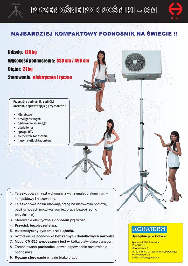 UdŸwig: 120 kg Wysokoœæ podnoszenia: 330 cm / 490 cm Ciê¿ar: 21 kg Sterowanie: elektryczne i rêczne