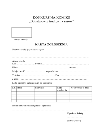 KONKURS NA KOMIKS „Bohaterowie trudnych czasów” pieczątka szkoły KARTA ZGŁOSZENIA Nazwa szkoły: (wypełnić drukowanymi) …………………………………………………………………………………... ………………………………………………………………………………….. Adres szkoły Kod …………………. Poczta …………………………………………………. Ulica ……………………………………………………… numer ……………. Miejscowość …………………… województwo ……………………………… Telefon ……………………………………. Fax ……………………………… e-mail: ………………………………………………………………………… Lista uczniów zgłoszonych do konkursu: Lp. imię nazwisko Data urodzenia Nr telefonu/ e-mail Imię i nazwisko nauczyciela - opiekuna …………………………………………………………………………………. Dyrektor Szkoły ……………….. (podpis i pieczęć)