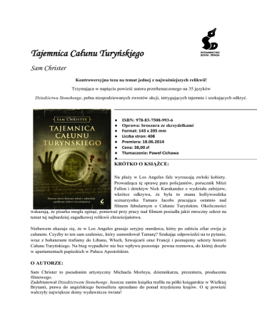Tajemnica Całunu Turyńskiego Sam Christer Kontrowersyjna teza na temat jednej z najważniejszych relikwii! Trzymająca w napięciu powieść autora przetłumaczonego na 35 języków Dziedzictwa Stonehenge, pełna niespodziewanych zwrotów akcji, intrygujących tajemnic i szokujących odkryć. ISBN: 978-83-7508-993-6 Oprawa: broszura ze skrzydełkami Format: 143 x 205 mm Liczba stron: 408 Premiera: 18.06.2014 Cena: 38,00 zł Tłumaczenie: Paweł Cichawa KRÓTKO O KSIĄŻCE: Na plaży w Los Angeles fale wyrzucają zwłoki kobiety. Prowadząca tę sprawę para policjantów, porucznik Mitzi Fallon i detektyw Nick Karakandez z wydziału zabójstw, wkrótce odkrywa, że była to znana hollywoodzka scenarzystka Tamara Jacobs pracująca ostatnio nad filmem fabularnym o Całunie Turyńskim. Okoliczności wskazują, że pisarka mogła zginąć, ponieważ przy pracy nad filmem posiadła jakiś mroczny sekret na temat tej najbardziej zagadkowej relikwii chrześcijaństwa. Niebawem okazuje się, że w Los Angeles grasuje seryjny morderca, który po zabiciu ofiar owija je całunem. Czyżby to ten sam szaleniec, który zamordował Tamarę? Szukając odpowiedzi na to pytanie, wraz z bohaterami trafiamy do Libanu, Włoch, Szwajcarii oraz Francji i poznajemy sekrety historii Całunu Turyńskiego. Na bieg wypadków nie bez wpływu pozostaje pewna rozmowa, do której doszło w apartamentach papieskich w Pałacu Apostolskim. O AUTORZE: Sam Christer to pseudonim artystyczny Michaela Morleya, dziennikarza, prezentera, producenta filmowego. Zadebiutował Dziedzictwem Stonehenge. Jeszcze zanim książka trafiła na półki księgarskie w Wielkiej Brytanii, prawa do angielskiego bestsellera sprzedano do ponad trzydziestu krajów. O tę powieść walczyły największe domy wydawnicze świata! Jego thrillery są znane już na sześciu kontynentach, od Stanów Zjednoczonych, poprzez Brazylię, Słowację, Japonię. W Polsce nakładem Wydawnictwa Sonia Draga ukazały się: Dziedzictwo Stonehenge i Tajemnica Całunu Turyńskiego, a w przygotowaniu jest kolejna książka Christera, Bractwo Camelotu. Autor jest żonaty, ma trójkę synów i mieszka w Derbyshire. PRASA O KSIĄŻKACH Sama Christera: „Napięcie towarzyszące odliczaniu czasu, który dzieli bohaterów od katastrofy, i przyprawiający o gęsią skórkę finał tylko potwierdzają, że na spekulacje na temat ekranizacji być może wcale nie jest za wcześnie”. Longridge News „Tę pełną sekretów, historycznych szczegółów, spisków i przygód powieść czyta się wprost doskonale. Christer co rusz podsuwa czytelnikowi fałszywe tropy, trzymając go w napięciu od pierwszej do ostatniej strony. Ciekawa i błyskotliwie napisana. Gorąco zachęcam, by wybrać się z autorem w tę fascynującą, pełną niebezpieczeństw podróż”. Steve Berry, bestsellerowy pisarz amerykański Sonia Draga Sp. z o.o., Pl. Grunwaldzki 8−10, 40-127 Katowice, Tel.: 327826477, 7826037, Fax: 032/ 2537728 Dział handlowy: Danuta Czarnowska, 693420384, [email protected] Promocja: Agnieszka Jedlińska, 695672067, [email protected] Redakcja: Magdalena Bargłowska, 697800066, [email protected]