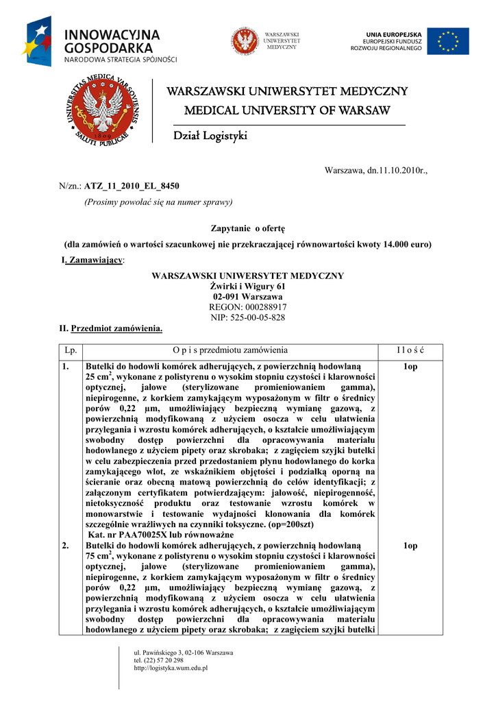 Warszawa, dn.11.10.2010r., N/zn.: ATZ_11_2010_EL_8450 (Prosimy powołać się na numer sprawy) Zapytanie o ofertę (dla zamówień o wartości szacunkowej nie przekraczającej równowartości kwoty 14.000 euro) I. Zamawiający: WARSZAWSKI UNIWERSYTET MEDYCZNY Żwirki i Wigury 61 02-091 Warszawa REGON: 000288917 NIP: 525-00-05-828 II. Przedmiot zamówienia. Lp. 1. 2. O p i s przedmiotu zamówienia Ilość Butelki do hodowli komórek adherujących, z powierzchnią hodowlaną 25 cm2, wykonane z polistyrenu o wysokim stopniu czystości i klarowności optycznej, jałowe (sterylizowane promieniowaniem gamma), niepirogenne, z korkiem zamykającym wyposażonym w filtr o średnicy porów 0,22 µm, umożliwiający bezpieczną wymianę gazową, z powierzchnią modyfikowaną z użyciem osocza w celu ułatwienia przylegania i wzrostu komórek adherujących, o kształcie umożliwiającym swobodny dostęp powierzchni dla opracowywania materiału hodowlanego z użyciem pipety oraz skrobaka; z zagięciem szyjki butelki w celu zabezpieczenia przed przedostaniem płynu hodowlanego do korka zamykającego wlot, ze wskaźnikiem objętości i podziałką oporną na ścieranie oraz obecną matową powierzchnią do celów identyfikacji; z załączonym certyfikatem potwierdzającym: jałowość, niepirogenność, nietoksyczność produktu oraz testowanie wzrostu komórek w monowarstwie i testowanie wydajności klonowania dla komórek szczególnie wrażliwych na czynniki toksyczne. (op=200szt) Kat. nr PAA70025X lub równoważne Butelki do hodowli komórek adherujących, z powierzchnią hodowlaną 75 cm2, wykonane z polistyrenu o wysokim stopniu czystości i klarowności optycznej, jałowe (sterylizowane promieniowaniem gamma), niepirogenne, z korkiem zamykającym wyposażonym w filtr o średnicy porów 0,22 µm, umożliwiający bezpieczną wymianę gazową, z powierzchnią modyfikowaną z użyciem osocza w celu ułatwienia przylegania i wzrostu komórek adherujących, o kształcie umożliwiającym swobodny dostęp powierzchni dla opracowywania materiału hodowlanego z użyciem pipety oraz skrobaka; z zagięciem szyjki butelki 1op ul. Pawińskiego 3, 02-106 Warszawa tel. (22) 57 20 298 http://logistyka.wum.edu.pl 1op w celu zabezpieczenia przed przedostaniem płynu hodowlanego do korka zamykającego wlot, ze wskaźnikiem objętości i podziałką oporną na ścieranie oraz obecną matową powierzchnią do celów identyfikacji; z załączonym certyfikatem potwierdzającym: jałowość, niepirogenność, nietoksyczność produktu oraz testowanie wzrostu komórek w monowarstwie i testowanie wydajności klonowania dla komórek szczególnie wrażliwych na czynniki toksyczne. (op=100szt) Kat. nr PAA70075X lub równoważne III. Forma złożenia oferty 1. 2. 3. 4. 5. 6. 7. Każdy Wykonawca może złożyć tylko jedną ofertę. Oferta powinna być sporządzona w języku polskim. Zamawiający oczekuje, że w ofercie będą użyte nazwy produktów takie jak na ewentualnej fakturze. Oferta powinna być napisana na maszynie do pisania/komputerze lub ręcznie atramentem nieścieralnym wg wzoru stanowiącego Załącznik nr 1 oraz Załącznik nr 2 do Zapytania ofertowego Oferta powinna być podpisana przez osoby upoważnione do podpisania oferty. Wymagane jest, aby wszystkie strony oferty oraz załączników były parafowane przez osoby podpisujące ofertę. Wszystkie miejsca, w których Wykonawca naniósł zmiany, winny być parafowane przez osoby upoważnione do podpisania oferty. Zamawiający nie dopuszcza składania ofert częściowych IV. Miejsce i termin złożenia ofert Miejsce: Dział Logistyki WUM, ul. Pawińskiego 3, 02-106 Warszawa; nr faxu: (22) 57 20 298; e-mail: [email protected] Termin składania ofert: do 18.10.2010 do godz. 12:00 Oferty złożone po terminie nie będą brane pod uwagę. V. Kryterium oceny ofert, znaczenie oraz sposób oceny oferty * 1. Kryteria oceny ofert i ich znaczenie: Cena 100% 2. Za najkorzystniejszą ofertę zostanie wybrana oferta z najniższą łączną ceną brutto. 3. Oferta najkorzystniejsza (z najniższą ceną) otrzyma 100 pkt, każda następna oferta otrzyma liczbę punktów proporcjonalnie mniejszą, obliczoną według wzoru: Liczba punktów oferty badanej = X A = cena min ×100pkt cena badana 4. Jeżeli nie można dokonać wyboru oferty najkorzystniejszej ze względu na to, że zostały złożone oferty o takiej samej cenie, Zamawiający wezwie Wykonawców, którzy złożyli te oferty, do złożenia w terminie określonym przez niego ofert dodatkowych. Wykonawcy składający oferty dodatkowe nie mogą zaoferować cen wyższych niż zaoferowane w złożonych ofertach. ul. Pawińskiego 3, 02-106 Warszawa tel/fax: .(22) 57 20 298 http//logistyka.wum.edu.pl VI. Wykaz oświadczeń i dokumentów, jakie należy dostarczyć w celu potwierdzenia spełniania warunków udziału w zapytaniu ofertowym. 1. Oferowane butelki z uwagi na specjalistyczne ich przeznaczenie, musza być oryginalnymi, katalogowymi produktami fabrycznymi, fabrycznie pakowanymi i spełniającymi wszystkie wymagania szczegółowe Zamawiającego określone w Załączniku nr 2 do zapytania ofertowego. 2. Zamawiający dopuszcza zaoferowanie butelki w opakowaniach o mniejszej zawartości w opakowaniu, ale tylko wówczas, gdy bez naruszenia oryginalnych opakowań fabrycznych, łączna ilość towaru (wyrażona w liczbie sztuk) będzie tożsama z wymaganą przez Zamawiającego. 3. Wykonawca oferujący butelki równoważne jest zobowiązany do załączenia do oferty: katalogu i/lub innych materiałów informacyjnych wydanych przez producenta w polskiej lub angielskiej wersji językowej, potwierdzających zgodność oferowanych pipet z wymaganiami szczegółowymi określonymi przez Zamawiającego w Załączniku nr 2 do Zapytania ofertowego. VII. Wybór wykonawcy Zamawiający wybierze ofertę najkorzystniejszą na podstawie kryteriów oceny ofert określonych w niniejszej Zapytaniu ofertowym. VIII. Odrzucenie oferty Zamawiający o