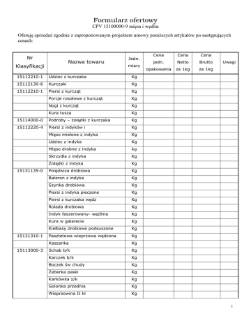 Formularz ofertowy CPV 15100000-9 mięsa i wędlin Oferuję sprzedaż zgodnie z zaproponowanym projektem umowy poniższych artykułów po następujących cenach: Nr Nazwa towaru Klasyfikacji Jedn. miary 15112210-1 Udziec z kurczaka Kg 15112130-6 Kurczaki Kg 15112210-1 Piersi z kurcząt Kg Porcje rosołowe z kurcząt Kg Nogi z kurcząt Kg Kura tusza Kg 15114000-0 Podroby – Ŝołądki z kurczaka Kg 15112220-4 Piersi z indyków i Kg Mięso mielone z indyka Kg Udziec z indyka Kg Mięso drobne z indyka kg Skrzydła z indyka Kg śołądki z indyka Kg Polędwica drobiowa Kg Baleron z indyka Kg Szynka drobiowa Kg Piersi z indyka pieczone Kg Piersi z kurczaka wędz Kg Rolada drobiowa Kg Indyk faszerowany- wędlina Kg Kura w galarecie Kg Kiełbasy drobiowe podsuszone Kg Pasztetowa wieprzowa wędzona Kg Kaszanka Kg Schab b/k Kg Karczek b/k Kg Boczek św chudy Kg śeberka paski Kg Karkówka z/k Kg Golonka przednia Kg Wieprzowina II kl Kg 15131135-0 15131310-1 15113000-3 Cena Cena Cena jedn. Netto Brutto opakowania za 1kg za 1kg Uwagi 1 Nr Nazwa towaru Klasyfikacji Jedn. miary Wątroba wieprz Kg Łopatka wieprzowa z/k kg Wieprzowina zrazowa Kg Szynka wieprz z/k Kg Łopatka wieprzowa b/k Kg Mięso mielone wieprzowo-wołowe Kg Szynka wieprz b/k Kg Smalec kg Wołowina pieczeń EXTRA Kg Wołowina II kl kg Wołowina gulaszowa kg Ogony wołowe Kg Flaki wołowe Kg Wołowina szponder Kg Ozory wieprzowe Kg Wątroba wieprzowa Kg Kości z karkówki Kg 15131210-0 Szynka wędzona Kg 15131410-2 Szynka z łopatki konserwowa Kg Szynka Bochuna Kg Szynka smakowita Kg Szynka mozaikowa Kg Szynka gotowana Kg Szynka konserwowa Kg Szynka got siatka Kg Szynka Kasztelańska kg Szynka wiśniowa kg Szynka wiejska Kg Polędwica sopocka Kg Wędzonka krotoszyńska Kg Ogonówka wiejska parzona kg Łopatka prasowana Kg Baleron Kg Baleron odtłuszczony (równorzędny Kg 15111100-0 15114000-0 15131400-9 Cena Cena Cena jedn. Netto Brutto opakowania za 1kg za 1kg Uwagi szynce) Boczek wędzony Kg 2 Nr Nazwa towaru Klasyfikacji Kiełbasa podsuszana (równorzędna Jedn. miary Cena Cena Cena jedn. Netto Brutto opakowania za 1kg za 1kg Uwagi Kg kiełbasie Ŝywieckiej) Mielonka (równorzędna szynce Kg konserwowej) Metka łososiowa Kg Kiełbasa salami Kg (równorzędna kiełbasie suchej) Polska pieczona Kg Cytrynowa Kg Jałowcowa kg Luncheon meat kg Serdelki kg Parówki cieniki kg Kiełbasa zwyczajna kg Kiełbasa polska kg Kiełbasa toruńska kg Kiełbasa parzona (równorzędna kg kiełbasie krakowskiej lub szynkowej) Kiełbasa śląska kg Parówki prosiaczek kg Parówki Berlinki tucholskie kg Parówki delikatesowe kg Parówki wieprzowe - grube kg Rolada z warzywami kg Polędwica z warzywami kg Łopatka z warzywami kg Mortadela kg Z róŜnymi dodatkami warzywami Pasztetowa kg Pasztet kg Pasztet ze śliwką Kaszanka kg 3 Nr Nazwa towaru Klasyfikacji Jedn. miary Cena Cena Cena jedn. Netto Brutto opakowania za 1kg za 1kg Uwagi Salceson Włoski Salceson ozorowy Rolada ozorowa Ozory w galarecie RAZEM 4