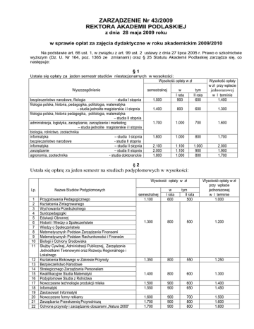 ZARZĄDZENIE Nr 43/2009 REKTORA AKADEMII PODLASKIEJ