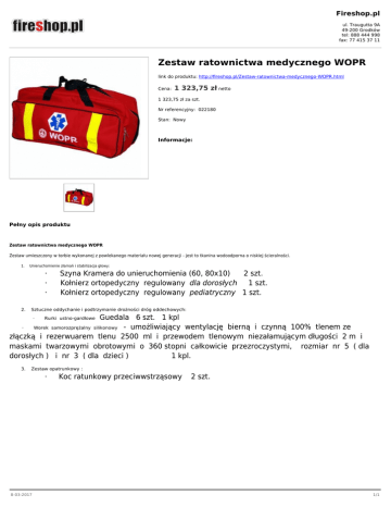 Fireshop.pl ul. Traugutta 9A 49-200 Grodków tel: 888 444 998 fax: 77 415 37 11 Zestaw ratownictwa medycznego WOPR link do produktu: http://fireshop.pl/Zestaw-ratownictwa-medycznego-WOPR.html Cena: 1 323,75 zł netto 1 323,75 zł za szt. Nr referencyjny: 022180 Stan: Nowy Informacje: Pełny opis produktu Zestaw ratownictwa medycznego WOPR Zestaw umieszczony w torbie wykonanej z powlekanego materiału nowej generacji - jest to tkanina wodoodporna o niskiej ścieralności. 1. Unieruchomienie złamań i stabilizacja głowy: · · · 2. Szyna Kramera do unieruchomienia (60, 80x10) 2 szt. Kołnierz ortopedyczny regulowany dla dorosłych 1 szt. Kołnierz ortopedyczny regulowany pediatryczny 1 szt. Sztuczne oddychanie i podtrzymanie drożności dróg oddechowych: Guedala 6 szt. 1 kpl · Worek samorozprężalny silikonowy - umożliwiający wentylację bierną i czynną 100% tlenem ze złączką i rezerwuarem tlenu 2500 ml i przewodem tlenowym niezałamującym długości 2 m i maskami twarzowymi obrotowymi o 360 stopni całkowicie przezroczystymi, rozmiar nr 5 ( dla dorosłych ) i nr 3 ( dla dzieci ) 1 kpl. · 3. Rurki ustno-gardłowe Zestaw opatrunkowy : · 8-03-2017 Koc ratunkowy przeciwwstrząsowy 2 szt. 1/1