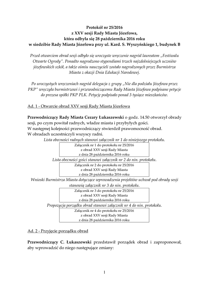Protokół nr 25/2016 z XXV sesji Rady Miasta Józefowa, która odbyła się 28 października 2016 roku w siedzibie Rady Miasta Józefowa przy ul. Kard. S. Wyszyńskiego 1, budynek B Przed otwarciem obrad sesji odbyło się uroczyste wręczenie nagród laureatom „Festiwalu Otwarte Ogrody”. Ponadto nagrodzono stypendiami trzech najzdolniejszych uczniów józefowskich szkół, a także ośmiu nauczycieli zostało nagrodzonych przez Burmistrza Miasta z okazji Dnia Edukacji Narodowej. Po uroczystych wręczeniach nagród delegacja z grupy „Nie dla podziału Józefowa przez PKP” wręczyła burmistrzowi i przewodniczącemu Rady Miasta Józefowa podpisane petycje do prezesa spółki PKP PLK. Petycję podpisało ponad 3 tysiące mieszkańców. Ad. 1 - Otwarcie obrad XXV sesji Rady Miasta Józefowa Przewodniczący Rady Miasta Cezary Łukaszewski o godz. 14.50 otworzył obrady sesji, po czym powitał radnych, władze miasta i przybyłych gości. W następnej kolejności przewodniczący stwierdził prawomocność obrad. W obradach uczestniczyli wszyscy radni. Lista obecności radnych stanowi załącznik nr 1 do niniejszego protokołu. Załącznik nr 1 do protokołu nr 25/2016 z obrad XXV sesji Rady Miasta z dnia 28 października 2016 roku Lista obecności gości stanowi załącznik nr 2 do nin. protokołu. Załącznik nr 2 do protokołu nr 25/2016 z obrad XXV sesji Rady Miasta z dnia 28 października 2016 roku Wnioski Burmistrza Miasta dotyczące wprowadzenia projektów uchwał pod obrady sesji stanowią załącznik nr 3 do nin. protokołu. Załącznik nr 3 do protokołu nr 25/2016 z obrad XXV sesji Rady Miasta z dnia 28 października 2016 roku Propozycja porządku obrad stanowi załącznik nr 4 do nin. protokołu. Załącznik nr 4 do protokołu nr 25/2016 z obrad XXV sesji Rady Miasta z dnia 28 października 2016 roku Ad. 2 - Przyjęcie porządku obrad Przewodniczący C. Łukaszewski przedstawił porządek obrad i zaproponował, aby wprowadzić do niego następujące zmiany: 1 - uchwała zmieniająca uchwałę Nr 127/VII/2015 Rady Miasta Józefowa z dnia 18 grudnia 2015 roku w sprawie Wieloletniej Prognozy Finansowej Miasta Józefowa na lata 2016 – 2024, - protokół Komisji Rewizyjnej z przeprowadzonej kontroli w zakresie inwestycji drogowych, - protokół Komisji Rewizyjnej z kontroli inwestycji w zakresie oświetlenia ulicznego, - protokół Komisji Rewizyjnej z przeprowadzonej kontroli umów zawartych z pracownikami Urzędu Miasta Józefowa na ryczałt paliwowy w latach 2015/2016, - protokół Komisji Rewizyjnej z przeprowadzonej kontroli: Procedura i zasady wyboru nieruchomości do wykupu przez Miasto Józefów. W związku z brakiem uwag przewodniczący Rady poddał pod głosowanie porządek obrad wraz z zaproponowanymi zmianami. Rada Miasta w pełnym składzie – 14 głosami „za”, przy 1 głosie „wstrzymującym się” zaakceptowała porządek obrad ze zmianami. Porządek obrad: 1. 2. 3. 4. Otwarcie obrad XXV sesji Rady Miasta Józefowa. Przyjęcie porządku obrad. Przyjęcie protokołu z obrad XXIII i XXIV sesji. Uchwała zmieniająca uchwałę Nr 127/VII/2015 Rady Miasta Józefowa z dnia 18 grudnia 2015 roku w sprawie Wieloletniej Prognozy Finansowej Miasta Józefowa na lata 2016 – 2024. 5. Uchwała w sprawie wprowadzenia zmian w uchwale budżetowej na 2016 rok. 6. Uchwała w sprawie wyrażenia zgody na odstąpienie od obowiązku przetargowego zawarcia umów najmu na częściach nieruchomości gruntowych położonych w Józefowie. 7. Uchwała w sprawie sprzedaży prawa własności nieruchomości gruntowych, położonych przy ul. Piaskowej 9/11 i ul. Kard. Wyszyńskiego 51, stanowiących własność Gminy Miasta Józefowa na rzecz użytkownika wieczystego. 8. Uchwała w sprawie określenia wysokości stawek podatku od nieruchomości na 2017 rok. 9. Uchwała w sprawie określenia wysokości stawek podatku od środków transportowych na rok 2017. 10. Uchwała w sprawie opłaty targowej. 11. Uchwała w sprawie wprowadzenia opłaty od posiadania psów i określenia wysokości opłaty od posiadania psów na rok 2017. 12. Protokół Komisji Rewizyjnej z przeprowadzonej kontroli w zakresie inwestycji drogowych. 2 13. Protokół Komisji Rewizyjnej z kontroli inwestycji w zakresie oświetlenia ulicznego. 14. Protokół Komisji Rewizyjnej z przeprowadzonej kontroli umów zawartych z pracownikami Urzędu Miasta Józefowa na ryczałt paliwowy w latach 2015/2016. 15. Protokół Komisji Rewizyjnej z przeprowadzonej kontroli: Procedura i zasady wyboru nieruchomości do wykupu przez Miasto Józefów. 16. Informacja Przewodniczącego Rady Miasta Józefowa. 17. Informacja Burmistrza Miasta Józefowa o podejmowaniu działań w ostatnim okresie. 18. Wnioski i interpelacje radnych. 19. Wolne wnioski. 20. Zakończenie obrad XXV sesji Rady Miasta Józefowa. Ad. 3 Przyjęcie protokołu z obrad XXIII i XXIV sesji. Przewodniczący C. Łukaszewski przedstawił, a następnie w związku z brakiem uwag poddał pod głosowanie protokoły z obrad dwóch poprzednich sesji. Protokół nr 23/2016 w obecności wszystkich radnych został przyjęty 14 głosami „za”, przy 1 głosie „przeciwnym”. Protokół nr 24/2016 został przyjęty jednogłośnie w obecności całej Rady Miasta. W następnej kolejności do udziału w pracach Komisji Skrutacyjnej zgłosiły się radne: Anna Masik (przewodnicząca) i Maria Walkiewicz (członek komisji). Ad. 4 Uchwała zmieniająca uchwałę Nr 127/VII/2015 Rady Miasta Józefowa z dnia 18 grudnia 2015 roku w sprawie Wieloletniej Prognozy Finansowej Miasta Józefowa na lata 2016 – 2024. Przewodniczący C. Łukaszewski przedstawił projekt uchwały w powyższej sprawie i zwrócił się z prośbą do Skarbnika Miasta o jego omówienie. Skarbnik Miasta H. Siwek powiedziała, że projekt uchwały dotyczy dodania do Wieloletniej Prognozy Finansowej przedsięwzięcia pn. zakup usługi udostępniania mieszkańcom Józefowa sztucznego lodowiska. Koszt przedsięwzięcia wynosi 