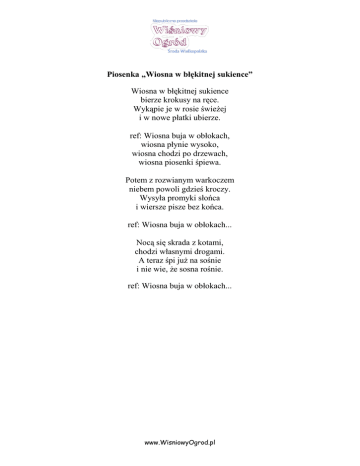 Piosenka „Wiosna w błękitnej sukience” Wiosna w błękitnej sukience bierze krokusy na ręce. Wykąpie je w rosie świeżej i w nowe płatki ubierze. ref: Wiosna buja w obłokach, wiosna płynie wysoko, wiosna chodzi po drzewach, wiosna piosenki śpiewa. Potem z rozwianym warkoczem niebem powoli gdzieś kroczy. Wysyła promyki słońca i wiersze pisze bez końca. ref: Wiosna buja w obłokach... Nocą się skrada z kotami, chodzi własnymi drogami. A teraz śpi już na sośnie i nie wie, że sosna rośnie. ref: Wiosna buja w obłokach... www.WisniowyOgrod.pl Piosenka ,,Wiosna” Promyk słońca wyjrzał zza chmury I zobaczył świat szarobury. Pomyślał: "Kto tu pomoże? Świat taki szary być nie może!" Ref. Kto obudzi pąki kwiatów? (WIOSNA!) Kto pokaże gniazda ptakom? (WIOSNA!) Kto wygoni misia z nory? Zazieleni pola, bory? Promyk słońca spotkał wiosenkę I zaśpiewał krótką piosenkę. Daj wiosenko kwiatków troszeczkę I obudź misia, obudź rzeczkę. Ref. Kto obudzi pąki kwiatów? (WIOSNA!) Kto pokaże gniazda ptakom? (WIOSNA!) Kto wygoni misia nory? Zazieleni pola, bory? I wiosenka go posłuchała, Kolorowe kwiaty nam dała. Zabłysnęła w krąg kolorami I już zostanie teraz z nami. Ref. Obudziła pąki kwiatów! (WIOSNA!) Pokazała gniazda ptakom! (WIOSNA!) Wygoniła misia nory! Ożywiła pola, bory! www.WisniowyOgrod.pl Piosenka „Szaraczek zając” Nasz szaraczek zając przykicał w Wielkanoc. Długie uszka, uszka miał koszyczek pełen jaj. Spytał: gdzie jest kurka, co ma złote piórka? I poprosił: - Kurko ma, daj mi jajka, jajka dwa. Kurka pomyślała i tak powiedziała: „ Nie dam jajek, nie dam ci, bo kurczaków braknie mi." www.WisniowyOgrod.pl Piosenka „Pisanki” Pójdę do kurnika, poproszę kokoszkę, może podaruje białych jajek troszkę. Ref. Ko ko ko, dam ci dam, białych jajek dużo mam. ko ko ko, weź je, weź, tylko je ostrożnie nieś. Na wielkanoc wiosną zwyczaje są znane, że się z jajek robi jajka malowane. Ref. Ko ko...... A z tych jajek zrobię przepiękne pisanki: na jednej stokrotki, na drugiej sasanki. ref. Czerwień tu, błękit tam, z pisankami koszyk mam. Pytasz mnie czy ci dam? Lepiej je pomaluj sam. Na trzeciej kropeczki, na czwartej różyczka, teraz wszystkie razem włożę do koszyczka www.WisniowyOgrod.pl