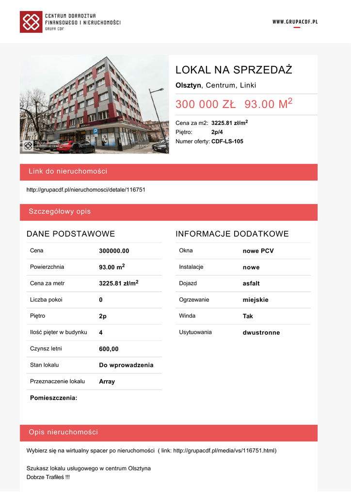 LOKAL NA SPRZEDAŻ Olsztyn, Centrum, Linki 300 000 ZŁ 93.00 M2 Cena za m2: 3225.81 zł/m2 Piętro: 2p/4 Numer oferty: CDF-LS-105 Link do nieruchomości http://grupacdf.pl/nieruchomosci/detale/116751 Szczegółowy opis DANE PODSTAWOWE INFORMACJE DODATKOWE Cena 300000.00 Okna nowe PCV Powierzchnia 93.00 m2 Instalacje nowe Cena za metr 3225.81 zł/m2 Dojazd asfalt Liczba pokoi 0 Ogrzewanie miejskie Piętro 2p Winda Tak Ilość pięter w budynku 4 Usytuowania dwustronne Czynsz letni 600,00 Stan lokalu Do wprowadzenia Przeznaczenie lokalu Array Pomieszczenia: Opis nieruchomości Wybierz się na wirtualny spacer po nieruchomości ( link: http://grupacdf.pl/media/vs/116751.html) Szukasz lokalu usługowego w centrum Olsztyna Dobrze Trafiłeś !!! Oferuję do sprzedaży lokal biurowy o powierzchni 93 m2 położony przy ul. Linki 3. Lokal znajduje się na 2 piętrze czteropiętrowego budynku. Budynek w 2015 r. przeszedł remont w postaci wymiany poszycia dachu oraz docieplenia i nowej elewacji. Dzięki rewelacyjnej lokalizacji (ścisłe centrum Olsztyna), dużej liczby lokali usługowych, oraz dużej liczby przechodniów świetnie sprawdzi się jako lokal pod wszelkiego rodzaje usługi "biurowe" Lokal składa się z 2 dużych gabinetów, części recepcyjnej oraz zaplecza. Z uwagi na wewnętrzny podział lokalu przez ścianki działowe istnieje możliwość dowolnej aranżacji wnętrza. Do lokalu przynależy wewnętrzne miejsce postojowe oraz piwnica o powierzchni 20 m2 Nie czekaj i umów się na prezentację Więcej szczegółów na: http://grupacdf.pl/nieruchomosci/detale/116751 FINANSOWANIE Zapraszamy do bezpłatnego skorzystania z usług naszych doradców finansowych GrupaCDF, którzy pomogą uzyskać najlepszy kredyt na rynku! Dysponujemy ofertami kredytów wszystkich rzetelnych banków na rynku. W prosty i jasny sposób doradzamy – porównujemy i wyjaśniamy propozycje. Nasze wsparcie jest bezpłatne i kompleksowe – od momentu złożenia wniosku, po wypłatę środków. DORADCA GrupyCDF POMOŻE PAŃSTWU W: - Porównaniu ofert z 23 banków i uzyskaniu wstępnej decyzji kredytowej - już podczas pierwszego spotkania, - Wyborze najlepszej oferty - najdogodniejszego systemu rat, okresu kredytowania, - Sporządzeniu i złożeniu wniosków w wybranych bankach, - Skompletowaniu niezbędnych dokumentów, dotyczących nabywanej nieruchomości. - Omówieniu warunków umowy kredytowej - Pomocy na każdym etapie procesu transakcyjnego Z nami realizacja marzenia o własnym mieszkaniu jest PROSTA! OSOBA ODPOWIEDZIALNA ZA OFERTĘ W BIURZE SPRZEDAŻY: Sławomir Jabłonowski GrupaCDF Sp. z o.o. ul. Mazurska 12/18 10-520 Olsztyn tel.: +48 669 707 062 tel./fax: +48 89 527 78 13 [email protected] Zapraszamy również do naszego olsztyńskiego oddziału Centrum Doradztwa Finansowego i Nieruchomości GrupaCDF Ul. Mazurska 12/18 10-520 Olsztyn tel. +48 89 527 78 13 Odwiedź naszą stronę: www.grupacdf.pl Niniejsza oferta nie stanowi oferty w rozumieniu kodeksu cywilnego. Dane w niej zawarte mają charakter informacyjny i mogą ulegać zmianie. Numer oferty w biurze: CDF-LS-105 Korzyści DLACZEGO WARTO SKORZYSTAĆ Z NASZYCH USŁUG? Chcemy, abyś nie musiał tracić czasu i pieniędzy na bieganie po wielu bankach, notariuszach, prawnikach, towarzystwach ubezpieczeń, rzeczoznawcach majątkowych, urzędach, biurach nieruchomości… Dzięki nam kupno nieruchomości opiera się na kontakcie z JEDNYM PARTNEREM, a skomplikowany proces JEST PROSTY. 1. GWARANCJA SUKCESU Nasi doświadczeni doradcy finansowi, z wieloletnim stażem zapewnią Ci transakcję, jak najbardziej korzystną dla Ciebie. Gwarantujemy Ci atrakcyjną cenę nieruchomości, zniżki przy opłatach notarialnych oraz najkorzystniejszą ofertę kredytu. Nasze usługi doradztwa finansowego nic Cię nie kosztują, a doradca finansowy pomoże uzyskać najlepszy kredyt na rynku. 2. KOMPLEKSOWOŚĆ Zajmiemy się procesem kupna Twojej nieruchomości od początku do końca transakcji. Zadbamy o poprawność całej dokumentacji, sprawdzenie stanu prawnego nieruchomości oraz jej finansowanie. W innowacyjny sposób łączymy zawód pośrednika nieruchomości i doradcy finansowego poprzez kompleksowe usługi. Z nami zakup nieruchomości JEST PROSTY. Sławomir Jabłonowski [email protected] +48 669 707 062 GrupaCDF Sp. z o.o. 10-520 Olsztyn, ul. Mazurska 12/18 tel./fax: +48 89 527 78 13