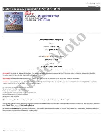 Informacje o produkcie Utworzono 08-03-2017 Zestaw napędowy Suzuki GSX-F 750 GSXF 89-98 Cena : 505,00 zł ! ot o Nr katalogowy : ZNSGSX8998DIDVXGJT Stan magazynowy : wysoki Średnia ocena : brak recenzji Oferujemy zestaw napędowy: Zębatki: (przednia) (tylna) JTF513.15 JTR829.47 M Łańcuch : DID X-RING ZŁOTY SUPER WZMOCNIONY DID50VXG&B-118 Pasuje do: c Suzuki GSX 750 F 1989-1998 r. Warunkiem gwarancji ze strony producenta DID jest założenie łańcucha w serwisie motocykli!! xi Dlaczego JT? Ponieważ to odpowiednia jakość - bardzo dobry materiał za bardzo rozsądną cenę! Ponieważ dopiero złożenie odpowiedniej jakości łańcucha i zębatek gwarantuje odpowiednio długie użytkowanie. Dlaczego DID? Ponieważ skoro najlepsi mu zaufali (m. in. Valentino Rossi) to uważamy, że i Ty powinieneś czuć się wystarczająco bezpiecznie na motocyklu. To Odradzamy kupowanie zestawów, których składniki nie mają jednorodnej jakości: np. zębatki wyprodukowane z nieodpowiedniej stali (co często ma miejsce w przypadku mało znanych chińskich producentów). DID oraz JT należą do największych producentów podzespołów, które proponujemy Państwu na naszych aukcjach. Dopiero odpowiednia jakość wszystkich elementów (wyjątkowa trwałość zarówno zębatek jak również i samego łańcucha) oraz właściwe ich założenie, jak również konserwacja będą gwarancją Twojej satysfakcji. Błyskawiczna wysyłka - towar dostępny od ręki w wiekszości w ciagu 24 godzin (przy wysyłce kurierskiej)!! Proponujemy w ramach serwisu m.inn. pomiar mocy motocykli na profesjonalnej hamowni Dyna Pro oraz dokładną ich diagnostykę wraz z możliwością ich regulacji pod kątem optymalizacji parametrów tuning Rapid Bike, Power Commander, Bazzaz. Jako partener firmy ECUnleashed USA wykonujemy usługi związane z chip tuningiem, odblokowaniem mocy silników ( np. pojazdy z Francji ). Efekty pracy gwarantowane i poświadczone najwyższymi autorytetami w tej branży. Pracujemy na oryginalnym produktach Piasini. Wygenerowano w programie www.oscGold.com