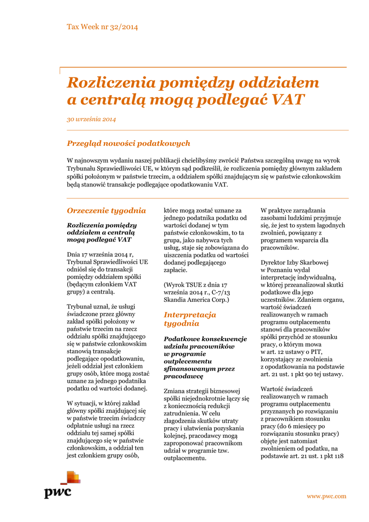 Tax Week nr 32/2014 Rozliczenia pomiędzy oddziałem a centralą mogą podlegać VAT 30 września 2014 Przegląd nowości podatkowych W najnowszym wydaniu naszej publikacji chcielibyśmy zwrócić Państwa szczególną uwagę na wyrok Trybunału Sprawiedliwości UE, w którym sąd podkreślił, że rozliczenia pomiędzy głównym zakładem spółki położonym w państwie trzecim, a oddziałem spółki znajdującym się w państwie członkowskim będą stanowić transakcje podlegające opodatkowaniu VAT. Orzeczenie tygodnia Rozliczenia pomiędzy oddziałem a centralą mogą podlegać VAT Dnia 17 września 2014 r, Trybunał Sprawiedliwości UE odniósł się do transakcji pomiędzy oddziałem spółki (będącym członkiem VAT grupy) a centralą. Trybunał uznał, że usługi świadczone przez główny zakład spółki położony w państwie trzecim na rzecz oddziału spółki znajdującego się w państwie członkowskim stanowią transakcje podlegające opodatkowaniu, jeżeli oddział jest członkiem grupy osób, które mogą zostać uznane za jednego podatnika podatku od wartości dodanej. W sytuacji, w której zakład główny spółki znajdującej się w państwie trzecim świadczy odpłatnie usługi na rzecz oddziału tej samej spółki znajdującego się w państwie członkowskim, a oddział ten jest członkiem grupy osób, które mogą zostać uznane za jednego podatnika podatku od wartości dodanej w tym państwie członkowskim, to ta grupa, jako nabywca tych usług, staje się zobowiązana do uiszczenia podatku od wartości dodanej podlegającego zapłacie. W praktyce zarządzania zasobami ludzkimi przyjmuje się, że jest to system łagodnych zwolnień, powiązany z programem wsparcia dla pracowników. Podatkowe konsekwencje udziału pracowników w programie outplecementu sfinansowanym przez pracodawcę Dyrektor Izby Skarbowej w Poznaniu wydał interpretację indywidualną, w której przeanalizował skutki podatkowe dla jego uczestników. Zdaniem organu, wartość świadczeń realizowanych w ramach programu outplacementu stanowi dla pracowników spółki przychód ze stosunku pracy, o którym mowa w art. 12 ustawy o PIT, korzystający ze zwolnienia z opodatkowania na podstawie art. 21 ust. 1 pkt 90 tej ustawy. Zmiana strategii biznesowej spółki niejednokrotnie łączy się z koniecznością redukcji zatrudnienia. W celu złagodzenia skutków utraty pracy i ułatwienia pozyskania kolejnej, pracodawcy mogą zaproponować pracownikom udział w programie tzw. outplacementu. Wartość świadczeń realizowanych w ramach programu outplacementu przyznanych po rozwiązaniu z pracownikiem stosunku pracy (do 6 miesięcy po rozwiązaniu stosunku pracy) objęte jest natomiast zwolnieniem od podatku, na podstawie art. 21 ust. 1 pkt 118 (Wyrok TSUE z dnia 17 września 2014 r., C-7/13 Skandia America Corp.) Interpretacja tygodnia www.pwc.com TaxWeek nr 32/2014 ustawy o PIT. (Interpretacja indywidualna Dyrektora Izby Skarbowej w Poznaniu z dnia 14 sierpnia 2014 r.) Express sądowy Odszkodowanie z tytułu rozwiązania umowy o pracę w sposób niezgodny z prawem stanowi koszt uzyskania przychodu Odszkodowanie zapłacone przez zakład pracy na mocy ugody sądowej byłemu pracownikowi, z którym rozwiązano umowę o pracę w sposób niezgodny z prawem, należy zaliczyć do kosztów uzyskania przychodu spółki. (Ustne uzasadnienie wyroku NSA z dnia 19 września 2014 r.) Udostępnienie kwater noclegowych pracownikom oddelegowanym – skutki w PIT Wartość świadczenia polegającego na udostępnieniu pracownikom kwater w przypadku wykonywania pracy poza siedzibą pracodawcy nie stanowi przychodu po stronie pracownika, jeśli nie ma możliwości przypisania pracownikowi zindywidualizowanej wartości przysporzenia, które otrzymał. (Ustne uzasadnienie wyroku NSA z dnia 19 września 2014 r.) Wydatki związane z przeprowadzeniem przymusowego wykupu akcji jako koszty podatkowe Wydatki związane z przeprowadzeniem przymusowego wykupu akcji jako wydatki obowiązkowe związane z funkcjonowaniem spółki powinny być potrącane przez spółkę w kosztach podatkowych. (Ustne uzasadnienie wyroku WSA w Warszawie z dnia 19 września 2014 r.) Express skarbowy Poczęstunek serwowany podczas szkolenia a prawo do odliczenia VAT Podatnik będzie miał prawo do obniżenia kwoty podatku należnego o kwotę podatku naliczonego wynikającego z faktur VAT dokumentujących nabycie artykułów spożywczych i usług cateringowych wykorzystywanych jako poczęstunek dla uczestników organizowanych przez niego szkoleń, ponieważ zakupy te mają związek z działalnością opodatkowaną w kraju, ponadto wnioskodawca jest czynnym zarejestrowanym podatnikiem VAT. (Interpretacja indywidualna Dyrektora Izby Skarbowej w Łodzi z dnia 19 sierpnia 2014 r.) Moment powstania obowiązku podatkowego w VAT w przypadku towarów wysyłanych za pośrednictwem firmy spedycyjnej Spółka, dostarczając towar kupującemu za pośrednictwem firmy kurierskiej, jest zobowiązana jako datę dokonania dostawy na fakturze przyjąć datę wydania towaru kurierowi. W tym samym momencie powstanie też obowiązek podatkowy w świetle ustawy o VAT. (Interpretacja indywidualna Dyrektora Izby Skarbowej w Bydgoszczy z dnia 5 września 2014 r.) Opłacenie przez spółkę składek na ubezpieczenia OC bez przychodu dla pracowników Objęcie ubezpieczeniem OC nieograniczonego kręgu osób nie spowoduje u nich powstania przychodu i nie będzie zobowiązywało pracodawcy do pobrania zaliczek na podatek dochodowy PIT. (Interpretacja indywidualna Dyrektora Izby Skarbowej w Bydgoszczy z dnia 26 sierpnia 2014 r.) Porozmawiajmy W przypadku pytań, prosimy o kontakt: Aleksandra Bembnista Senior Consultant tel. +48 58 552 9008 [email protected] Zastrzeżenie prawne: Publikacja ma jedynie charakter informacyjny i nie stanowi porady podatkowej w rozumieniu polskich przepisów, w szczególności Ustawy z dnia 5 lipca 1996 r. o doradztwie podatkowym. Nie powinni Państwo opi