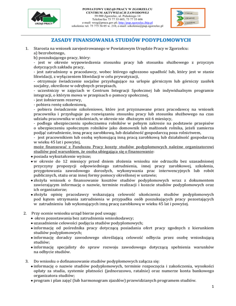 POWIATOWY URZĄD PRACY W ZGORZELCU CENTRUM AKTYWIZACJI ZAWODOWEJ 59-900 Zgorzelec, ul. Pułaskiego 14 Telefon/fax 75 77 55 605; 75 77 55 606 e-mail: [email protected]; http://pup.zgorzelec.ibip.pl szkolenia: tel. 75 775 56 05 w. 210, e-mail: [email protected] ZASADY FINANSOWANIA STUDIÓW PODYPLOMOWYCH 1. 2. 3. Starosta na wniosek zarejestrowanego w Powiatowym Urzędzie Pracy w Zgorzelcu: a) bezrobotnego, b) poszukującego pracy, który: - jest w okresie wypowiedzenia stosunku pracy lub stosunku służbowego z przyczyn dotyczących zakładu pracy, - jest zatrudniony u pracodawcy, wobec którego ogłoszono upadłość lub, który jest w stanie likwidacji, z wyłączeniem likwidacji w celu prywatyzacji, - otrzymuje świadczenie socjalne przysługujące na urlopie górniczym lub górniczy zasiłek socjalny, określone w odrębnych przepisach, - uczestniczy w zajęciach w Centrum Integracji Społecznej lub indywidualnym programie integracji, o którym mowa w przepisach o pomocy społecznej, - jest żołnierzem rezerwy, - pobiera rentę szkoleniową, - pobiera świadczenie szkoleniowe, które jest przyznawane przez pracodawcę na wniosek pracownika i przysługuje po rozwiązaniu stosunku pracy lub stosunku służbowego na czas udziału pracownika w szkoleniach, w okresie nie dłuższym niż 6 miesięcy, - podlega ubezpieczeniu społecznemu rolników w pełnym zakresie na podstawie przepisów o ubezpieczeniu społecznym rolników jako domownik lub małżonek rolnika, jeżeli zamierza podjąć zatrudnienie, inną pracę zarobkową, lub działalność gospodarczą poza rolnictwem, - jest pracownikiem lub osobą wykonującą inną pracą zarobkową lub działalność gospodarczą w wieku 45 lat i powyżej, może finansować z Funduszu Pracy koszty studiów podyplomowych należne organizatorowi studiów pod warunkiem, że osoba ubiegająca się o finansowanie: posiada wykształcenie wyższe; w okresie do 12 miesięcy przed dniem złożenia wniosku nie odrzuciła bez uzasadnionej przyczyny propozycji odpowiedniego zatrudnienia, innej pracy zarobkowej, szkolenia, przygotowania zawodowego dorosłych, wykonywania prac interwencyjnych lub robót publicznych, stażu oraz innej formy pomocy określonej w ustawie; złożyła wniosek o finansowanie kosztów studiów podyplomowych wraz z dokumentem zawierającym informację o nazwie, terminie realizacji i koszcie studiów podyplomowych oraz ich organizatorze; złożyła opinię pracodawcy wskazującą celowość ukończenia studiów podyplomowych pod kątem utrzymania zatrudnienia w przypadku osób poszukujących pracy pozostających w zatrudnieniu lub wykonujących inną pracę zarobkową w wieku 45 lat i powyżej. Przy ocenie wniosku urząd bierze pod uwagę: okres pozostawania bez zatrudnienia wnioskodawcy; uzasadnienie celowości podjęcia studiów podyplomowych; informację od pośrednika pracy dotyczącą posiadania ofert pracy zgodnych z kierunkiem studiów podyplomowych; informację doradcy zawodowego określającą celowość odbycia przez osobę wnioskującą studiów; informację specjalisty do spraw rozwoju zawodowego dotyczącą spełnienia warunków na odbycie studiów. Do wniosku o dofinansowanie studiów podyplomowych załącza się: informację o nazwie studiów podyplomowych, terminie rozpoczęcia i zakończenia, wysokości opłaty za studia, systemie płatności (jednorazowo, ratalnie) oraz numerze konta bankowego organizatora studiów; program i plan zajęć (lub harmonogram zjazdów) przewidzianych programem studiów. 1 4. Starosta może sfinansować z Funduszu Pracy koszty studiów podyplomowych na wniosek osoby uprawnionej do wysokości 100% kwoty opłaty za studia, jednak nie więcej niż 300 % przeciętnego wynagrodzenia. W przypadku osoby bezrobotnej, będącej słuchaczem studiów podyplomowych istnieje możliwość dofinansowania kosztów tych studiów za okres od złożenia wniosku do ukończenia studiów. 5. Warunkiem rozpatrzenia wniosku jest jego kompletność. O sposobie jego rozpatrzenia osoba uprawniona zostaje poinformowana w formie pisemnej w terminie do 30 dni od dnia złożenia prawidłowo sporządzonego wniosku i innych dokumentów niezbędnych do jego oceny. 6. Starosta zawiera z osobami wymienionymi w pkt. 1 umowę o dofinansowanie studiów podyplomowych, która określa w szczególności prawa i obowiązki stron, wysokość i tryb przekazywania środków na pokrycie kosztów studiów podyplomowych w formie bezpośrednich wpłat na konto organizatora studiów podyplomowych. 7. Bezrobotnemu w trakcie odbywania studiów podyplomowych, za okres uczestnictwa w zajęciach przewidzianych programem studiów przysługuje stypendium, w wysokości 20% zasiłku. Stypendium to nie przysługuje osobom wymienionym w pkt 1b. 8. W przypadku podjęcia przez uczestnika studiów podyplomowych zatrudnienia, innej pracy zarobkowej lub działalności gospodarczej w trakcie ich odbywania, nie zawiesza się dofinansowania kosztów tych studiów do planowanego terminu ich ukończenia. 9. Bezrobotnemu, który w trakcie trwania studiów podyplomowych podjął zatrudnienie, inną pracę zarobkową lub działalność gospodarczą, nie zawiesza się wypłaty stypendium do planowanego terminu ukończenia studiów. 10. Uczestnikowi studiów podyplomowych, który w trakcie ich odbywania podjął zatrudnienie, inną pracę zarobkową lub działalność gospodarczą przysługuje odszkodowanie z tytułu ubezpieczenia od następstw nieszczęśliwych wypadków powstałych w związku ze studiami podyplomowymi oraz w drodze do miejsc studiów i z powrotem, wypłacane przez instytucję ubezpieczeniową, w której uczestnik ten został ubezpieczony. Ubezpieczenie to nie przysługuje w przypadku , gdy uczestnik ten posiada już takie ubezpieczenie. 11. Uczestnik studiów podyplomowych zobowiązany jest do przekazywania tut. Urzędowi dokumentu o kontynuowaniu i następnie o ukończeniu studiów podyplomowych. 12. W przypadku nieukończenia lub przerwania stud