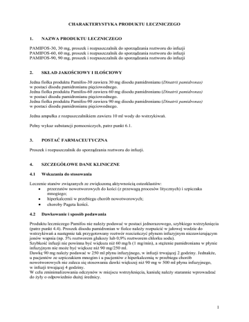 CHARAKTERYSTYKA PRODUKTU LECZNICZEGO 1. NAZWA PRODUKTU LECZNICZEGO PAMIFOS-30, 30 mg, proszek i rozpuszczalnik do sporządzania roztworu do infuzji PAMIFOS-60, 60 mg, proszek i rozpuszczalnik do sporządzania roztworu do infuzji PAMIFOS-90, 90 mg, proszek i rozpuszczalnik do sporządzania roztworu do infuzji 2. SKŁAD JAKOŚCIOWY I ILOŚCIOWY Jedna fiolka produktu Pamifos-30 zawiera 30 mg disodu pamidronianu (Dinatrii pamidronas) w postaci disodu pamidronianu pięciowodnego. Jedna fiolka produktu Pamifos-60 zawiera 60 mg disodu pamidronianu (Dinatrii pamidronas) w postaci disodu pamidronianu pięciowodnego. Jedna fiolka produktu Pamifos-90 zawiera 90 mg disodu pamidronianu (Dinatrii pamidronas) w postaci disodu pamidronianu pięciowodnego. Jedna ampułka z rozpuszczalnikiem zawiera 10 ml wody do wstrzykiwań. Pełny wykaz substancji pomocniczych, patrz punkt 6.1. 3. POSTAĆ FARMACEUTYCZNA Proszek i rozpuszczalnik do sporządzania roztworu do infuzji. 4. SZCZEGÓŁOWE DANE KLINICZNE 4.1 Wskazania do stosowania Leczenie stanów związanych ze zwiększoną aktywnością osteoklastów: przerzutów nowotworowych do kości (z przewagą procesów litycznych) i szpiczaka mnogiego; hiperkalcemii w przebiegu chorób nowotworowych; choroby Pageta kości. 4.2 Dawkowanie i sposób podawania Produktu leczniczego Pamifos nie należy podawać w postaci jednorazowego, szybkiego wstrzyknięcia (patrz punkt 4.4). Proszek disodu pamidronian w fiolce należy rozpuścić w jałowej wodzie do wstrzykiwań a następnie tak przygotowany roztwór rozcieńczyć płynem infuzyjnym niezawierającym jonów wapnia (np. 5% roztworem glukozy lub 0,9% roztworem chlorku sodu). Szybkość infuzji nie powinna być większa niż 60 mg/h (1 mg/min), a stężenie pamidronianu w płynie infuzyjnym nie może być większe niż 90 mg/250 ml. Dawkę 90 mg należy podawać w 250 ml płynu infuzyjnego, w infuzji trwającej 2 godziny. Jednakże, u pacjentów ze szpiczakiem mnogim i u pacjentów z hiperkalcemią w przebiegu chorób nowotworowych nie zaleca się stosowania dawki większej niż 90 mg w 500 ml płynu infuzyjnego, w infuzji trwającej 4 godziny. W celu zminimalizowania odczynów w miejscu wstrzyknięcia, kaniulę należy starannie wprowadzać do żyły o odpowiednio dużej średnicy. 1 Dorośli oraz osoby w podeszłym wieku Przerzuty nowotworowe do kości (z przewagą procesów litycznych) i szpiczak mnogi Zalecana dawka disodu pamidronian w leczeniu przerzutów nowotworowych do kości z przewagą procesów litycznych oraz szpiczaka mnogiego wynosi 90 mg w pojedynczej infuzji podawanej co 4 tygodnie. U pacjentów z przerzutami do kości, poddawanych chemioterapii w odstępach 3-tygodniowych, Pamifos-90 można również stosować co 3 tygodnie. Hiperkalcemia w przebiegu chorób nowotworowych Pacjentów należy odpowiednio nawodnić roztworem fizjologicznym soli przed podaniem produktu leczniczego i (lub) podczas jego stosowania. Całkowita dawka, którą należy podać w czasie jednej kuracji, zależy od początkowego stężenia wapnia w surowicy krwi pacjenta. Podane poniżej zasady dawkowania pochodzą z danych klinicznych i odnoszą się do wartości nieskorygowanego stężenia wapnia w surowicy. Jednak u prawidłowo nawodnionych pacjentów, dawki w podanych niżej przedziałach odnoszą się również do stężenia wapnia związanego z białkami lub albuminami. Stężenie wapnia w surowicy przed leczeniem (mmol/l) (mg/100 ml) < 3,0 < 12,0 3,0-3,5 12,0-14,0 3,5-4,0 14,0-16,0 > 4,0 > 16 Zalecana dawka całkowita pamidronianu (mg) 15-30 30-60 60-90 90 Całkowitą dawkę produktu leczniczego Pamifos można podać zarówno w jednej infuzji, jak i w kilku wlewach w ciągu 2 do 4 kolejnych dni. Maksymalna dawka produktu na pełną kurację wynosi 90 mg. Dotyczy to zarówno pierwszego kursu leczenia jak i następnych kursów podawania produktu. Istotne zmniejszenie stężenia wapnia w surowicy krwi występuje zazwyczaj w ciągu 24 do 48 godzin po podaniu pamidronianu. Natomiast normalizacja stężenia wapnia występuje zazwyczaj w ciągu 3 do 7 dni od podania produktu. Jeżeli nie osiągnie się normalizacji stężenia wapnia w krwi w tym czasie, można podać kolejne dawki. Okres trwania odpowiedzi na leczenie może różnić się u poszczególnych pacjentów, a leczenie można powtarzać w każdym przypadku nawrotu hiperkalcemii. Z doświadczeń klinicznych wynika, że pamidronian może stać się mniej skuteczny w miarę zwiększania się liczby stosowanych kursów leczniczych. Choroba Pageta kości Zalecana dawka całkowita pamidronianu na jeden cykl leczenia wynosi 180 mg do 210 mg. Produkt leczniczy można podać zarówno w postaci 6 pojedynczych dawek po 30 mg raz na tydzień (dawka całkowita 180 mg) jak i w 3 pojedynczych dawkach po 60 mg co drugi tydzień. W przypadku stosowania pojedynczej dawki 60 mg, zaleca się rozpoczęcie leczenia od dawki początkowej 30 mg (całkowita dawka 210 mg). Sposób podawania, w którym pomija się dawkę początkową, można powtórzyć po 6 miesiącach, aż do uzyskania remisji choroby, oraz w przypadku, gdy wystąpi nawrót choroby. Zaburzenia czynności nerek Produktu leczniczego Pamifos nie należy podawać pacjentom z ciężkimi zaburzeniami czynności nerek (klirens kreatyniny < 30 ml/min), poza przypadkami zagrażającej życiu hiperkalcemii w przebiegu choroby nowotworowej, kiedy korzyści przewyższają potencjalne ryzyko. Podobnie jak w przypadku dożylnych postaci innych bisfosfonianów, zaleca się monitorowanie czynności nerek, np. kontrolę stężenia kreatyniny w surowicy krwi przed podaniem każdej dawki produktu leczniczego. U pacjentów z przerzutami nowotworowymi do kości lub szpiczakiem mnogim, otrzymujących Pamifos, u których wykazano pogorszenie czynności nerek, leczenie tym produktem należy przerwać do czasu powrotu czynności nerek, aż wartość stężenia kreatyniny w surowicy nie 2 będzie przekraczała 10% wartości wyjściowej. To zalecenie jest op