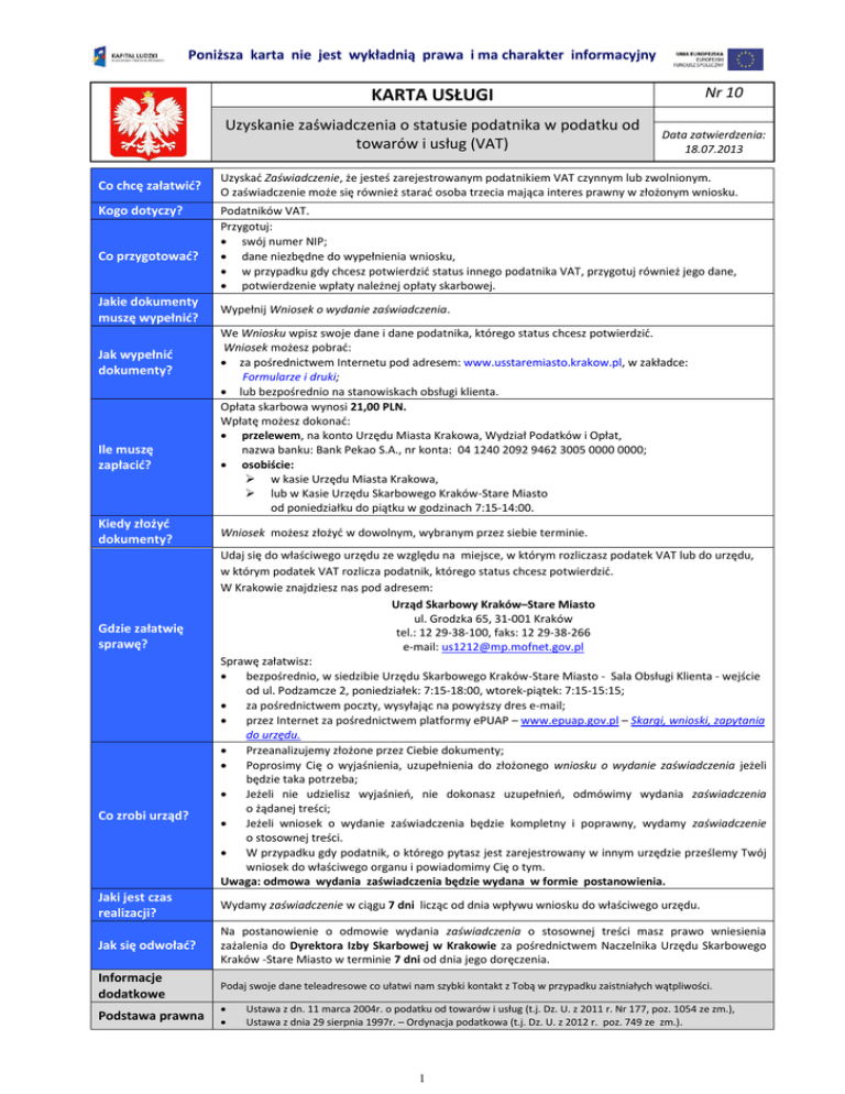Poniższa karta nie jest wykładnią prawa i ma charakter informacyjny Nr 10 KARTA USŁUGI Uzyskanie zaświadczenia o statusie podatnika w podatku od towarów i usług (VAT) Co chcę załatwić? Kogo dotyczy? Co przygotować? Jakie dokumenty muszę wypełnić? Jak wypełnić dokumenty? Ile muszę zapłacić? Kiedy złożyć dokumenty? Gdzie załatwię sprawę? Co zrobi urząd? Data zatwierdzenia: 18.07.2013 Uzyskać Zaświadczenie, że jesteś zarejestrowanym podatnikiem VAT czynnym lub zwolnionym. O zaświadczenie może się również starać osoba trzecia mająca interes prawny w złożonym wniosku. Podatników VAT. Przygotuj: swój numer NIP; dane niezbędne do wypełnienia wniosku, w przypadku gdy chcesz potwierdzić status innego podatnika VAT, przygotuj również jego dane, potwierdzenie wpłaty należnej opłaty skarbowej. Wypełnij Wniosek o wydanie zaświadczenia. We Wniosku wpisz swoje dane i dane podatnika, którego status chcesz potwierdzić. Wniosek możesz pobrać: za pośrednictwem Internetu pod adresem: www.usstaremiasto.krakow.pl, w zakładce: Formularze i druki; lub bezpośrednio na stanowiskach obsługi klienta. Opłata skarbowa wynosi 21,00 PLN. Wpłatę możesz dokonać: przelewem, na konto Urzędu Miasta Krakowa, Wydział Podatków i Opłat, nazwa banku: Bank Pekao S.A., nr konta: 04 1240 2092 9462 3005 0000 0000; osobiście: w kasie Urzędu Miasta Krakowa, lub w Kasie Urzędu Skarbowego Kraków-Stare Miasto od poniedziałku do piątku w godzinach 7:15-14:00. Wniosek możesz złożyć w dowolnym, wybranym przez siebie terminie. Udaj się do właściwego urzędu ze względu na miejsce, w którym rozliczasz podatek VAT lub do urzędu, w którym podatek VAT rozlicza podatnik, którego status chcesz potwierdzić. W Krakowie znajdziesz nas pod adresem: Urząd Skarbowy Kraków–Stare Miasto ul. Grodzka 65, 31-001 Kraków tel.: 12 29-38-100, faks: 12 29-38-266 e-mail: [email protected] Sprawę załatwisz: bezpośrednio, w siedzibie Urzędu Skarbowego Kraków-Stare Miasto - Sala Obsługi Klienta - wejście od ul. Podzamcze 2, poniedziałek: 7:15-18:00, wtorek-piątek: 7:15-15:15; za pośrednictwem poczty, wysyłając na powyższy dres e-mail; przez Internet za pośrednictwem platformy ePUAP – www.epuap.gov.pl – Skargi, wnioski, zapytania do urzędu. Przeanalizujemy złożone przez Ciebie dokumenty; Poprosimy Cię o wyjaśnienia, uzupełnienia do złożonego wniosku o wydanie zaświadczenia jeżeli będzie taka potrzeba; Jeżeli nie udzielisz wyjaśnień, nie dokonasz uzupełnień, odmówimy wydania zaświadczenia o żądanej treści; Jeżeli wniosek o wydanie zaświadczenia będzie kompletny i poprawny, wydamy zaświadczenie o stosownej treści. W przypadku gdy podatnik, o którego pytasz jest zarejestrowany w innym urzędzie prześlemy Twój wniosek do właściwego organu i powiadomimy Cię o tym. Uwaga: odmowa wydania zaświadczenia będzie wydana w formie postanowienia. Jaki jest czas realizacji? Wydamy zaświadczenie w ciągu 7 dni licząc od dnia wpływu wniosku do właściwego urzędu. Jak się odwołać? Na postanowienie o odmowie wydania zaświadczenia o stosownej treści masz prawo wniesienia zażalenia do Dyrektora Izby Skarbowej w Krakowie za pośrednictwem Naczelnika Urzędu Skarbowego Kraków -Stare Miasto w terminie 7 dni od dnia jego doręczenia. Informacje dodatkowe Podaj swoje dane teleadresowe co ułatwi nam szybki kontakt z Tobą w przypadku zaistniałych wątpliwości. Podstawa prawna Ustawa z dn. 11 marca 2004r. o podatku od towarów i usług (t.j. Dz. U. z 2011 r. Nr 177, poz. 1054 ze zm.), Ustawa z dnia 29 sierpnia 1997r. – Ordynacja podatkowa (t.j. Dz. U. z 2012 r. poz. 749 ze zm.). 1 Poniższa karta nie jest wykładnią prawa i ma charakter informacyjny 2