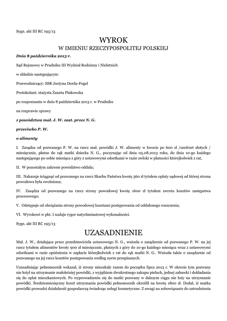 Sygn. akt III RC 193/13 WYROK W IMIENIU RZECZYPOSPOLITEJ POLSKIEJ Dnia 8 października 2013 r. Sąd Rejonowy w Prudniku III Wydział Rodzinny i Nieletnich w składzie następującym: Przewodniczący: SSR Justyna Derda-Fogel Protokolant: stażysta Żaneta Pinkowska po rozpoznaniu w dniu 8 października 2013 r. w Prudniku na rozprawie sprawy z powództwa mał. J. W. zast. przez N. G. przeciwko P. W. o alimenty I. Zasądza od pozwanego P. W. na rzecz mał. powódki J. W. alimenty w kwocie po 600 zł /sześćset złotych / miesięcznie, płatne do rąk matki dziecka N. G., poczynając od dnia 05.08.2013 roku, do dnia 10-go każdego następującego po sobie miesiąca z góry z ustawowymi odsetkami w razie zwłoki w płatności którejkolwiek z rat, II. W pozostałym zakresie powództwo oddala; III. Nakazuje ściągnąć od pozwanego na rzecz Skarbu Państwa kwotę 360 zł tytułem opłaty sądowej od której strona powodowa była zwolniona; IV. Zasądza od pozwanego na rzecz strony powodowej kwotę 1600 zł tytułem zwrotu kosztów zastępstwa procesowego; V. Odstępuje od obciążania strony powodowej kosztami postępowania od oddalonego roszczenia; VI. Wyrokowi w pkt. I nadaje rygor natychmiastowej wykonalności. Sygn. akt III RC 193/13 UZASADNIENIE Mał. J. W., działająca przez przedstawiciela ustawowego N. G., wniosła o zasądzenie od pozwanego P. W. na jej rzecz tytułem alimentów kwoty 900 zł miesięcznie, płatnych z góry do 10-go każdego miesiąca wraz z ustawowymi odsetkami w razie opóźnienia w zapłacie którejkolwiek z rat do rąk matki N. G.. Wniosła także o zasądzenie od pozwanego na jej rzecz kosztów postępowania według norm przepisanych. Uzasadniając pełnomocnik wskazał, iż strony mieszkały razem do początku lipca 2013 r. W okresie tym pozwany nie łożył na utrzymanie małoletniej powódki, z wyjątkiem dwukrotnego zakupu pieluch, jednej zabawki i dokładania się do opłat mieszkaniowych. Po wyprowadzeniu się do matki pozwany w dalszym ciągu nie łoży na utrzymanie powódki. Średniomiesięczny koszt utrzymania powódki pełnomocnik określił na kwotę 1800 zł. Dodał, iż matka powódki prowadzi działalność gospodarczą świadcząc usługi kosmetyczne. Z uwagi na zobowiązanie do zatrudnienia pracownika zamierza zakończyć prowadzenie działalności gospodarczej i podjąć zatrudnienie na podstawie umowy o pracę. Odnośnie zatrudnienia pozwanego pełnomocnik podniósł, iż pracuje on w S. i zarabia prawdopodobnie 2500 zł netto. We wcześniejszym okresie pozwany pracował w charakterze przedstawiciela handlowego i uzyskiwał relatywnie wysokie wynagrodzenie. Przed trzema laty zarobkował też w Holandii za miesięcznym wynagrodzeniem wynoszącym około 1000 euro. Obecnie prowadzi działalność gospodarczą w sektorze kamieniarstwa i szeroko reklamuje swoją działalność w internecie. Pełnomocnik pozwanego uznał żądanie do kwoty 450 zł miesięcznie. Podniósł , iż pozwany od listopada 2012 r. nie prowadzi działalności gospodarczej i że nie ma możliwości dorobienia z uwagi na trzyzmianowy system pracy. Dodał, iż pozwany ma jeszcze jedno dziecko w wieku 7 lat , na które płaci alimenty w kwocie 400 zł. Sąd ustalił następujący stan faktyczny: Mał. powódka J. W. ma 10 miesięcy i uczęszcza do żłobka, za który opłata wynosi ok. 300 zł miesięcznie . Opłata za komitet rodzicielski wynosi 50 zł, a za ubezpieczenie 44 zł. Małoletnia zaopatrywana jest przez matkę w żywność za kwotę ok. 500 zł miesięcznie. Matka kupuje jej obiady w słoiczkach, desery, mleko, kaszki soczki, owoce, warzywa, ciasteczka. Kupuje też środki czystości za 350 zł miesięcznie- pampersy, suche i wilgotne chusteczki, płyn do kąpieli, krem do skóry, płyn do płukania tkanin, proszek do prania. Kupuje zabawki za 50 zł miesięcznie, książeczki edukacyjne, witaminy i lekarstwa w przypadku zachorowania. W bieżącym miesiącu na leki córki wydała 100 zł. N. G. kupuje córce ubranka i obuwie za średnio 200 zł miesięcznie. Musi kupić kombinezon, czapkę zimową, śpiwór do wózka. W bieżącym miesiącu kupiła fotelik samochodowy za 950 zł, chodzik za 200 zł, fotelik do karmienia za 450 zł. Raz w tygodniu jeździ z córką na basen do Nysy, za który płaci 250 zł za semestr oraz za przejazdy 50 zł miesięcznie. W grudniu chce urządzić córce roczek. W styczniu przeznaczy kwotę 400 zł na szczepienie małoletniej. N. G. mieszka z córką w wynajętym trzypokojowym mieszkaniu, za które opłaty wynoszą 1100 zł miesięcznie. Prowadzi działalność gospodarczą- gabinet kosmetyczny i zatrudnia jedną pracownicę. Zatrudnia też nianię na 2,3 godziny, której płaci 8 zł za godzinę. (dowód: - zeznania przedstawicielki ustawowej k. 83 - rachunki za zakup żywności, odzieży, art. dziecięcych, opłaty w żłobku, na basenie, w miejscu zamieszkania k. 20 —25, 35 38-41,74-82) Pozwany P. W. do dnia 14.09.2013 r. pracował na stanowisku pomocnika maszynisty w firmie (...) w G. i zarabiał średnio 2300 zł netto miesięcznie. Pracodawca rozwiązał z nim umowę o pracę za dwutygodniowym wypowiedzeniem. Wcześniej od 01.11.2010 r. do 31.10.2012 r. prowadził działalność gospodarczą w branży kamieniarskiej. Na rozpoczęcie działalności otrzymał dotację w wysokości 40 000 zł. Pomimo wykreślenia z ewidencji działalności gospodarczej pozwany nadal reklamuje swoją działalność w internecie i otrzymuje zlecenia na wykonanie nagrobków. Do miesiąca września br. reklamował też swoją firmę na banerze reklamowym przy ul. (...) w G.. Przed rozpoczęciem działalności gospodarczej pozwany był przedstawicielem handlowym firmy działającej w branży alkoholowej. Wyjeżdżał też do pracy do Holandii. Pozwany mieszka u matki i przekazuje jej na utrzymanie 400 zł. Utrzymuje się z oszczędności, które uzyskał po sprzedaży mieszkania. Po urodzeniu mał. powódki kupił rower za ponad 10 tys. zł. Opró
