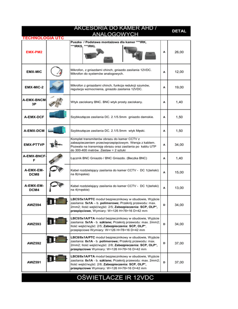 TECHNOLOGIA UTC AKCESORIA DO KAMER AHD / ANALOGOWYCH DETAL Puszka / Podstawa montażowa dla kamer ***IRK, ***IRKS, ***IRKL EMX-PM2 A 26,00 EMX-MIC Mikrofon, z gniazdami chinch, gniazdo zasilania 12VDC. Mikrofon do systemów analogowych. A 12,00 EMX-MIC-2 Mikrofon z gniazdami chinch, funkcja redukcji szumów, regulacja wzmocnienia, gniazdo zasilania 12VDC. A 19,00 Wtyk zaciskany BNC. BNC wtyk prosty zaciskany. A 1,40 A-EMX-DCF Szybkozłącze zasilania DC. 2.1/5.5mm gniazdo damskie. A 1,50 A-EMX-DCM Szybkozłącze zasilania DC. 2.1/5.5mm wtyk Męski. A 1,50 EMX-PTTVP Komplet transmiterów obrazu do kamer CCTV z zabezpieczeniem przeciwprzepięciowym. Wersja z kablem. Pozwala na transmisję obrazu oraz zasilania po kablu UTP do 300-400 metrów. Zestaw = 2 sztuki A 34,00 A-EMX-BNCFF Łącznik BNC Gniazdo / BNC Gniazdo. (Beczka BNC) A 1,40 A-EMX-EMDCM8 Kabel rozdzielający zasilania do kamer CCTV - DC 1(żeński) na 8(męskie) A 15,00 A-EMX-EMDCM4 Kabel rozdzielający zasilania do kamer CCTV - DC 1(żeński) na 4(męskie) A 13,00 AWZ594 LBC5/5x1A/PTC moduł bezpiecznikowy w obudowie, Wyjście zasilania: 5x1A – b. polimerowe; Przekrój przewodu: max. 2mm2; Ilość wejść/wyjść: 2/5; Zabezpieczenia: SCP, OLP*, przepięciowe, Wymiary: W=126 H=78+16 D=42 mm D 34,00 AWZ593 LBC5/5x1A/FTA moduł bezpiecznikowy w obudowie, Wyjście zasilania: 5x1A - b. szklane; Przekrój przewodu: max. 2mm2; Ilość wejść/wyjść: 2/5; Zabezpieczenia: SCP, OLP*, przepięciowe Wymiary: W=126 H=78+16 D=42 mm D 34,00 AWZ592 LBC8/8x1A/PTC moduł bezpiecznikowy w obudowie, Wyjście zasilania: 8x1A - b. polimerowe; Przekrój przewodu: max. 2mm2; Ilość wejść/wyjść: 2/8; Zabezpieczenia: SCP, OLP*, przepięciowe Wymiary: W=126 H=78+16 D=42 mm D 37,00 AWZ591 LBC8/8x1A/FTA moduł bezpiecznikowy w obudowie, Wyjście zasilania: 8x1A - b. szklane; Przekrój przewodu: max. 2mm2; Ilość wejść/wyjść: 2/8; Zabezpieczenia: SCP, OLP*, przepięciowe Wymiary: W=126 H=78+16 D=42 mm D 37,00 A-EMX-BNCM3P OŚWIETLACZE IR 12VDC EMXIRLED150 18 diód IR-LED POWER 10mm, dystans do 150m, zasilanie 12VDC, 15W, do zastosowań zewnętrznych i wewnętrznych (-20ºC do 50ºC). W zestawie uchwyt. 2 lata gwarancji. A 382,00 OBUDOWY DO KAMER GL-606H + GL-210W Obudowa zewnętrzna ogrzewana (ON 15C - OFF 25C), wymiary: zewnętrzne / wewnętrzne s -113 / 76mm, h -106 / 72mm, d -410 / 300mm - (zasilanie do wyboru: 12VDC / 24VAC / 230VAC). W zestawie z uchwytem GL-210W. D 50,00 GL-618H + GL-208 Obudowa zewnętrzna ogrzewana (ON 15C - OFF 25C), otwierana przez uchylenie na bok - wymiary: zewnętrzne / wewnętrzne s -138/ 100mm, h -117 / 75mm, d -375 / 260mm - (zasilanie do wyboru: 12VDC / 24VAC / 230VAC). W zestawie z uchwytem GL-208. A 119,00 A 6,00 A 8,00 A 10,00 A 59,00 A 199,00 A 209,00 D 329,00 A 299,00 A 110,00 A 255,00 A 255,00 A 476,00 UCHWYTY DO KAMER GL-220 GL-201 GL-500L GL-215 Uchwyt kamery ścienny mini, stop AL / tworzywo do 1,0kg obciążenia beżowy 50(W)X67(H)mm, głowica Pan. 360st./ Horyzont.90st. Uchwyt kamery ścienny, tworzywo do 1,5kg obciążenia beżowy 160(H)X90(D)mm. Możliwość wprowadzenia kabla w uchwycie. Uchwyt kamery ścienny przedłużany, tworzywo do 1,5kg obciążenia beżowy 218(H)mm W zestawie z dodatkową przedłużką 65 mm. Uchwyt obudowy sufitowy, metal do 10kg obciążenia beżowy 350(H)X300(W)mm, głowica Pan. 360st./ Horyzont 90st. OBIEKTYWY OBIEKTYWY Z AUTOMATYCZNĄ PRZYSŁONĄ PROD. JAPOŃSKIEJ OBIEKTYWY MEGAPIXEL DZIEN / NOC IR MEGALENS V0308AMIR MEGALENS V02812AMIR M12VD4510IR M13VD615IR M13-VD358ICR M13-VD2812ICR M13VM2812I R M13-VD550ICR Obiektyw 2 Megapikselowy superjasny dzień / noc, korekcja IR, Vari-focal Auto iris 3,0-8 mm, F 1,0 - CS, 1/3"CCD / CMOS. 2 lata gwarancji. Obiektyw 2 Megapikselowy dzień / noc, korekcja IR, Varifocal Auto iris 2,8-12 mm, F 1,4 - CS, 1/2,7"CCD / CMOS. 2 lata gwarancji. Obiektyw 5 Megapikselowy dzień / noc, korekcja IR, Varifocal Auto iris 4,5 - 10mm, F 1,6 - CS, 1/2"CCD / CMOS, Kąt widzenia 80,5 - 37 stopni. 2 lata gwarancji. Obiektyw 3 Megapikselowy dzień / noc, korekcja IR, Varifocal Auto iris 6 - 15mm, F 1,4 - CS, 1/2,5 "CCD / CMOS. 2 lata gwarancji. Obiektyw 2 Megapikselowy dzień / noc, korekcja IR, Varifocal Auto iris 3,5 - 8mm, F 1,4 - CS, 1/3"CCD / CMOS. 2 lata gwarancji. Obiektyw 2 Megapikselowy dzień / noc, korekcja IR, Varifocal Auto iris 2,8 - 12mm, F 1,4 - CS, 1/3"CCD / CMOS Kąt widzenia 94,5 - 25 stopni. 2 lata gwarancji. Obiektyw 2 Megapikselowy dzień / noc, korekcja IR, Varifocal manual iris 2,8 - 12mm, F 1,4 - CS, 1/3"CCD / CMOS Kąt widzenia 94,5 - 25 stopni. 2 lata gwarancji. Obiektyw 2 Megapikselowy dzień / noc, korekcja IR, Varifocal Auto iris 5 - 50mm, F 1,6 - CS, 1/3"CCD / CMOS. 2 lata gwarancji. DYSKI TWARDE CENY DYSKÓW NIE PODLEGAJĄ RABATOM. Dysk Toshiba 1TB Dyski Toshiba 2TB Dyski Toshiba 3TB Dysk twardy Toshiba 1TB, DT01ACA100 1TB 3.5'' SATA3 32MB 7200rpm 3lata gwarancji producenta Dysk twardy Toshiba 2TB, DT01ACA200 2TB 3.5'' SATA3 64MB 7200rpm 3lata gwarancji producenta Dysk twardy Toshiba 3TB, DT01ACA300 3TB 3.5'' SATA3 64MB 7200rpm 3lata gwarancji producenta S 199,00 S 299,00 S 369,00 DYSKI WD Purple WD10PURX Dysk twardy 1Tb WD Purple WD10PURX 64MB S 223,00 WD20PURX Dysk twardy 2Tb WD Purple WD20PURX 64MB S 319,00 WD30PURX Dysk twardy 3Tb WD Purple WD30PURX 64MB S 409,00 WD40PURX Dysk twardy 4Tb WD Purple WD40PURX 64MB S 599,00 WD60PURX Dysk twardy 6Tb WD Purple WD60PURX 64MB S 960,00 A 59,00 A 99,00 A 14,00 A 14,00 A 40,00 A 20,00 TRANSMISJA OBRAZU WIDEO PO SKRĘTCE KONWERTERY PASYWNE AHDMX-SG-KBNC AHDMX-SG-KTXRX EMX-PTT AHDMX-FTXRX AHDMX-F-KTXRX AHDMX-KTXRX Separator galwaniczny obsługujący sygnały HD 720/1080P (AHD/TVI/CVI). Pasywny, wbudowana separacja chroni przed zakłóceniami spowodowanymi zakłóceniami na masie sygnału. 2x BNC (75om) Separator galwaniczny obsługujący sygnały HD 720/1080P (AHD/TVI/CVI). Pasywny transmiter obrazu nadajnik / odniornik. Wbudowana separacja chroni przed zakłóceniami spowod