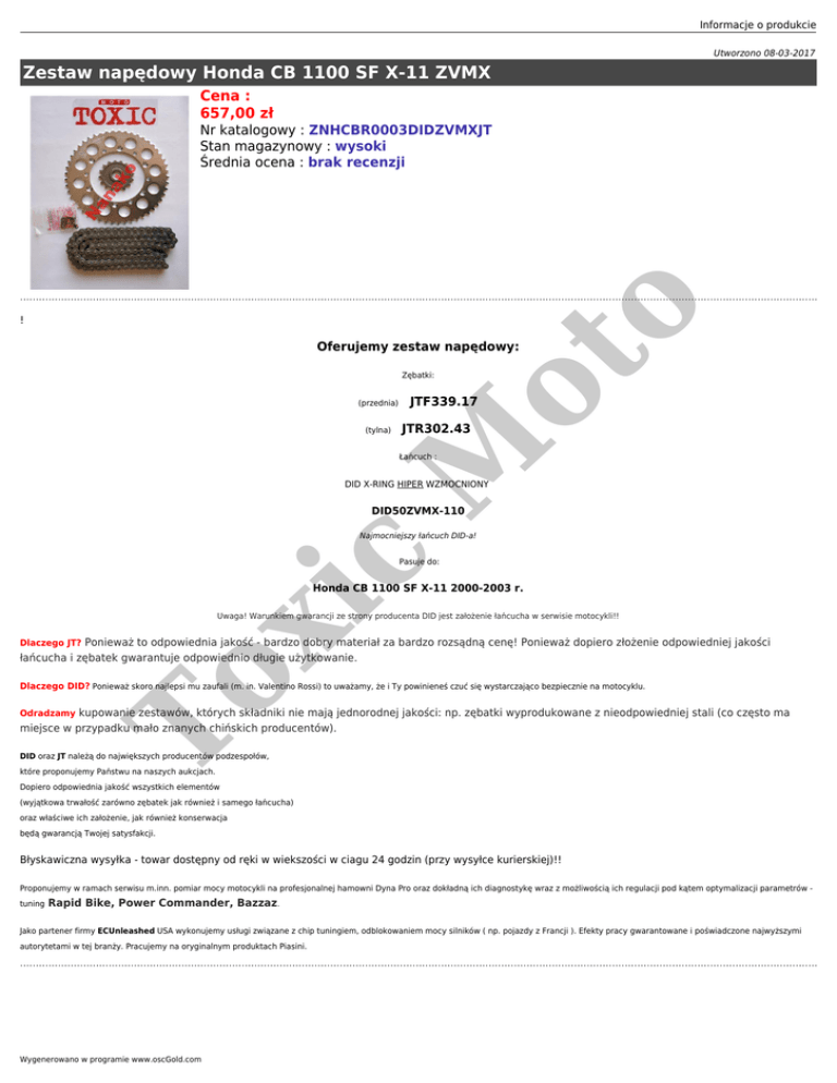 Informacje o produkcie Utworzono 08-03-2017 Zestaw napędowy Honda CB 1100 SF X-11 ZVMX Cena : 657,00 zł ! ot o Nr katalogowy : ZNHCBR0003DIDZVMXJT Stan magazynowy : wysoki Średnia ocena : brak recenzji Oferujemy zestaw napędowy: Zębatki: (przednia) JTR302.43 M (tylna) JTF339.17 Łańcuch : DID X-RING HIPER WZMOCNIONY DID50ZVMX-110 c Najmocniejszy łańcuch DID-a! Pasuje do: xi Honda CB 1100 SF X-11 2000-2003 r. Uwaga! Warunkiem gwarancji ze strony producenta DID jest założenie łańcucha w serwisie motocykli!! Dlaczego JT? Ponieważ to odpowiednia jakość - bardzo dobry materiał za bardzo rozsądną cenę! Ponieważ dopiero złożenie odpowiedniej jakości To łańcucha i zębatek gwarantuje odpowiednio długie użytkowanie. Dlaczego DID? Ponieważ skoro najlepsi mu zaufali (m. in. Valentino Rossi) to uważamy, że i Ty powinieneś czuć się wystarczająco bezpiecznie na motocyklu. Odradzamy kupowanie zestawów, których składniki nie mają jednorodnej jakości: np. zębatki wyprodukowane z nieodpowiedniej stali (co często ma miejsce w przypadku mało znanych chińskich producentów). DID oraz JT należą do największych producentów podzespołów, które proponujemy Państwu na naszych aukcjach. Dopiero odpowiednia jakość wszystkich elementów (wyjątkowa trwałość zarówno zębatek jak również i samego łańcucha) oraz właściwe ich założenie, jak również konserwacja będą gwarancją Twojej satysfakcji. Błyskawiczna wysyłka - towar dostępny od ręki w wiekszości w ciagu 24 godzin (przy wysyłce kurierskiej)!! Proponujemy w ramach serwisu m.inn. pomiar mocy motocykli na profesjonalnej hamowni Dyna Pro oraz dokładną ich diagnostykę wraz z możliwością ich regulacji pod kątem optymalizacji parametrów tuning Rapid Bike, Power Commander, Bazzaz. Jako partener firmy ECUnleashed USA wykonujemy usługi związane z chip tuningiem, odblokowaniem mocy silników ( np. pojazdy z Francji ). Efekty pracy gwarantowane i poświadczone najwyższymi autorytetami w tej branży. Pracujemy na oryginalnym produktach Piasini. Wygenerowano w programie www.oscGold.com