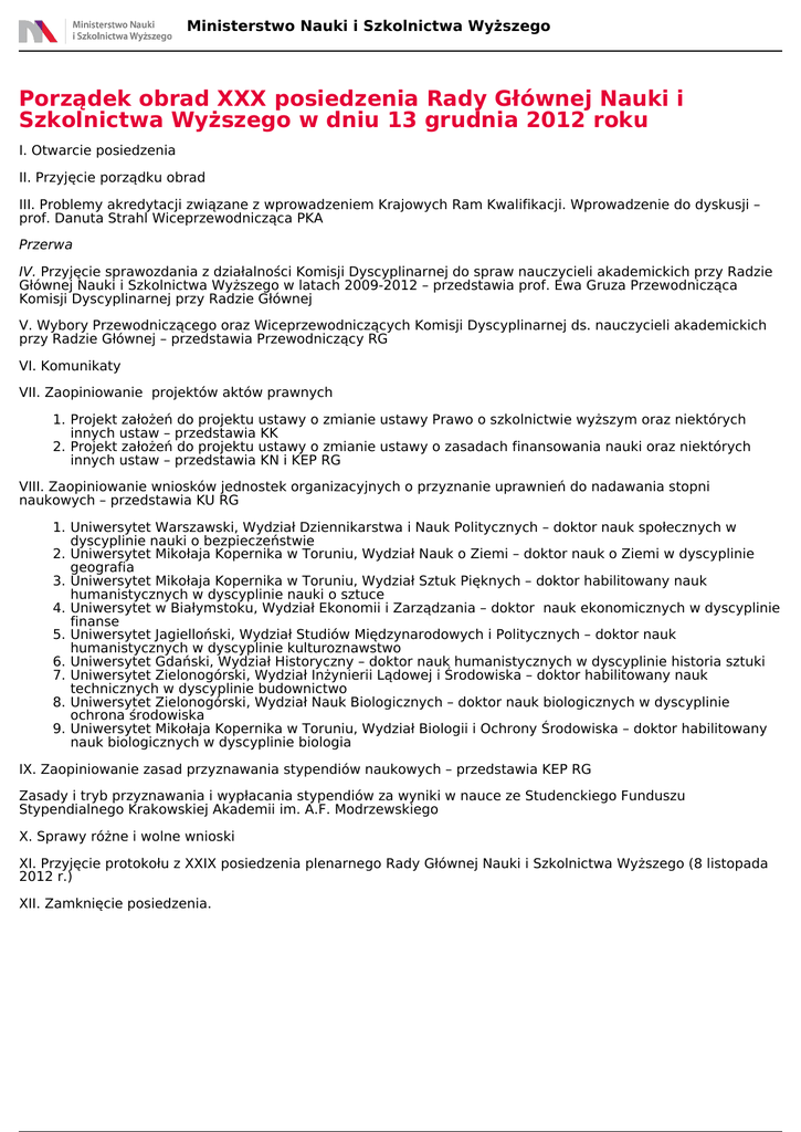Ministerstwo Nauki i Szkolnictwa Wyższego Porządek obrad XXX posiedzenia Rady Głównej Nauki i Szkolnictwa Wyższego w dniu 13 grudnia 2012 roku I. Otwarcie posiedzenia II. Przyjęcie porządku obrad III. Problemy akredytacji związane z wprowadzeniem Krajowych Ram Kwalifikacji. Wprowadzenie do dyskusji – prof. Danuta Strahl Wiceprzewodnicząca PKA Przerwa IV. Przyjęcie sprawozdania z działalności Komisji Dyscyplinarnej do spraw nauczycieli akademickich przy Radzie Głównej Nauki i Szkolnictwa Wyższego w latach 2009-2012 – przedstawia prof. Ewa Gruza Przewodnicząca Komisji Dyscyplinarnej przy Radzie Głównej V. Wybory Przewodniczącego oraz Wiceprzewodniczących Komisji Dyscyplinarnej ds. nauczycieli akademickich przy Radzie Głównej – przedstawia Przewodniczący RG VI. Komunikaty VII. Zaopiniowanie projektów aktów prawnych 1. Projekt założeń do projektu ustawy o zmianie ustawy Prawo o szkolnictwie wyższym oraz niektórych innych ustaw – przedstawia KK 2. Projekt założeń do projektu ustawy o zmianie ustawy o zasadach finansowania nauki oraz niektórych innych ustaw – przedstawia KN i KEP RG VIII. Zaopiniowanie wniosków jednostek organizacyjnych o przyznanie uprawnień do nadawania stopni naukowych – przedstawia KU RG 1. Uniwersytet Warszawski, Wydział Dziennikarstwa i Nauk Politycznych – doktor nauk społecznych w dyscyplinie nauki o bezpieczeństwie 2. Uniwersytet Mikołaja Kopernika w Toruniu, Wydział Nauk o Ziemi – doktor nauk o Ziemi w dyscyplinie geografia 3. Uniwersytet Mikołaja Kopernika w Toruniu, Wydział Sztuk Pięknych – doktor habilitowany nauk humanistycznych w dyscyplinie nauki o sztuce 4. Uniwersytet w Białymstoku, Wydział Ekonomii i Zarządzania – doktor nauk ekonomicznych w dyscyplinie finanse 5. Uniwersytet Jagielloński, Wydział Studiów Międzynarodowych i Politycznych – doktor nauk humanistycznych w dyscyplinie kulturoznawstwo 6. Uniwersytet Gdański, Wydział Historyczny – doktor nauk humanistycznych w dyscyplinie historia sztuki 7. Uniwersytet Zielonogórski, Wydział Inżynierii Lądowej i Środowiska – doktor habilitowany nauk technicznych w dyscyplinie budownictwo 8. Uniwersytet Zielonogórski, Wydział Nauk Biologicznych – doktor nauk biologicznych w dyscyplinie ochrona środowiska 9. Uniwersytet Mikołaja Kopernika w Toruniu, Wydział Biologii i Ochrony Środowiska – doktor habilitowany nauk biologicznych w dyscyplinie biologia IX. Zaopiniowanie zasad przyznawania stypendiów naukowych – przedstawia KEP RG Zasady i tryb przyznawania i wypłacania stypendiów za wyniki w nauce ze Studenckiego Funduszu Stypendialnego Krakowskiej Akademii im. A.F. Modrzewskiego X. Sprawy różne i wolne wnioski XI. Przyjęcie protokołu z XXIX posiedzenia plenarnego Rady Głównej Nauki i Szkolnictwa Wyższego (8 listopada 2012 r.) XII. Zamknięcie posiedzenia. Powered by TCPDF (www.tcpdf.org)