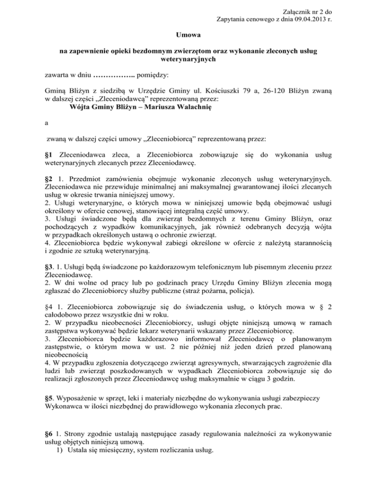 Załącznik nr 2 do Zapytania cenowego z dnia 09.04.2013 r. Umowa na zapewnienie opieki bezdomnym zwierzętom oraz wykonanie zleconych usług weterynaryjnych zawarta w dniu …………….. pomiędzy: Gminą Bliżyn z siedzibą w Urzędzie Gminy ul. Kościuszki 79 a, 26-120 Bliżyn zwaną w dalszej części „Zleceniodawcą” reprezentowaną przez: Wójta Gminy Bliżyn – Mariusza Walachnię a zwaną w dalszej części umowy „Zleceniobiorcą” reprezentowaną przez: §1 Zleceniodawca zleca, a Zleceniobiorca zobowiązuje się do wykonania usług weterynaryjnych zlecanych przez Zleceniodawcę. §2 1. Przedmiot zamówienia obejmuje wykonanie zleconych usług weterynaryjnych. Zleceniodawca nie przewiduje minimalnej ani maksymalnej gwarantowanej ilości zlecanych usług w okresie trwania niniejszej umowy. 2. Usługi weterynaryjne, o których mowa w niniejszej umowie będą obejmować usługi określony w ofercie cenowej, stanowiącej integralną część umowy. 3. Usługi świadczone będą dla zwierząt bezdomnych z terenu Gminy Bliżyn, oraz pochodzących z wypadków komunikacyjnych, jak również odebranych decyzją wójta w przypadkach określonych ustawą o ochronie zwierząt. 4. Zleceniobiorca będzie wykonywał zabiegi określone w ofercie z należytą starannością i zgodnie ze sztuką weterynaryjną. §3. 1. Usługi będą świadczone po każdorazowym telefonicznym lub pisemnym zleceniu przez Zleceniodawcę. 2. W dni wolne od pracy lub po godzinach pracy Urzędu Gminy Bliżyn zlecenia mogą zgłaszać do Zleceniobiorcy służby publiczne (straż pożarna, policja). §4 1. Zleceniobiorca zobowiązuje się do świadczenia usług, o których mowa w § 2 całodobowo przez wszystkie dni w roku. 2. W przypadku nieobecności Zleceniobiorcy, usługi objęte niniejszą umową w ramach zastępstwa wykonywać będzie lekarz weterynarii wskazany przez Zleceniobiorcę. 3. Zleceniobiorca będzie każdorazowo informował Zleceniodawcę o planowanym zastępstwie, o którym mowa w ust. 2 nie później niż jeden dzień przed planowaną nieobecnością 4. W przypadku zgłoszenia dotyczącego zwierząt agresywnych, stwarzających zagrożenie dla ludzi lub zwierząt poszkodowanych w wypadkach Zleceniobiorca zobowiązuje się do realizacji zgłoszonych przez Zleceniodawcę usług maksymalnie w ciągu 3 godzin. §5. Wyposażenie w sprzęt, leki i materiały niezbędne do wykonywania usługi zabezpieczy Wykonawca w ilości niezbędnej do prawidłowego wykonania zleconych prac. §6 1. Strony zgodnie ustalają następujące zasady regulowania należności za wykonywanie usług objętych niniejszą umową. 1) Ustala się miesięczny, system rozliczania usług. 2) Należność za wykonanie usług regulowana będzie w ciągu 14 dni od daty otrzymania przez Zleceniodawcę faktury. 3) Do wystawionej faktury Zleceniobiorca każdorazowo będzie dołączać zestawienie zbiorcze wykonanych usług, obejmujące opis zwierzęcia, adres ostatniego przebywania oraz rodzaj wykonanej usługi. 4) Za prawidłowo wykonany przedmiot umowy Zleceniodawca zapłaci Zleceniobiorcy wynagrodzenie wynikające z zestawienia zbiorczego wykonanych usług zleconych przez Zleceniodawcę w danym okresie rozliczeniowym oraz ich cen określonych w ofercie cenowej stanowiącej integralną część niniejszej umowy. 5) Ceny podane w ofercie cenowej nie będą podlegały rewaloryzacji do końca trwania umowy. 6) W przypadku konieczności wykonania usług nieokreślonych w ofercie cenowej Zleceniobiorca będzie każdorazowo informował o tym Zleceniodawcę uzgadniając cenę i zakres koniecznego zakresu usług. 2. Strony zgodnie ustalają, że w przypadku wykonywania usług weterynaryjnych poza lecznicą Zleceniobiorcy przysługuje zwrot kosztów przejazdu w wysokości stanowiącej iloczyn przejechanych kilometrów i stawki za jeden kilometr wykazanej w ofercie. 3. W celu prawidłowego rozliczenia kosztów przejazdu, o którym mowa w ust. 2 Zleceniobiorca podaje każdorazowo w zestawieniu zbiorczym, określonym w ust. 1 pkt 3 rodzaj pojazdu, który wykorzystywał i ilość przejechanych kilometrów. §7 Strony zgodnie postanawiają, że będą współpracować ze sobą w zakresie gminnego programu opieki nad zwierzętami bezdomnymi oraz zapobiegania bezdomności zwierząt na terenie Gminy Bliżyn, oraz w zakresie przeprowadzania adopcji zwierząt bezpańskich i odebranych decyzją Wójta. §8 Umowa zostaje zawarta na rok, tj. od dnia 01.05.2013 r. do dnia. 30.04.2014 r. §9 Zmiany warunków umowy lub jej zakresu winny być dokonywane na piśmie. §10 W przypadku rażącego naruszenia przez Zleceniobiorcę postanowień umowy Zleceniodawca może wypowiedzieć umowę w każdym czasie, bez okresu wypowiedzenia. §11 W sprawach nie uregulowanych niniejszą umową będą miały zastosowanie przepisy Kodeksu Cywilnego i innych obowiązujących ustaw. §12 Wszelkie spory, jakie mogą wyniknąć z wykonania niniejszej umowy rozstrzygać będzie właściwy miejscowo i rzeczowo Sąd według siedziby Zleceniodawcy. §13 Umowę sporządzono w trzech Zleceniobiorcy, dwa dla Zleceniodawcy. .............................. Zleceniodawca jednobrzmiących egzemplarzach, jeden dla ............................... Zleceniobiorca