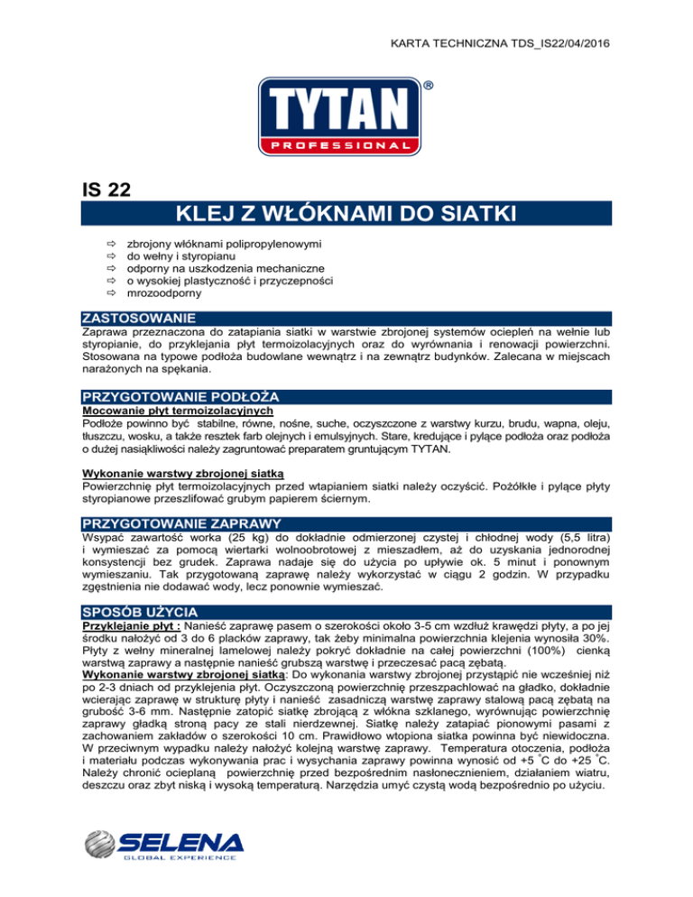 KARTA TECHNICZNA TDS_IS22/04/2016 IS 22 KLEJ Z WŁÓKNAMI DO SIATKI zbrojony włóknami polipropylenowymi do wełny i styropianu odporny na uszkodzenia mechaniczne o wysokiej plastyczność i przyczepności mrozoodporny ZASTOSOWANIE Zaprawa przeznaczona do zatapiania siatki w warstwie zbrojonej systemów ociepleń na wełnie lub styropianie, do przyklejania płyt termoizolacyjnych oraz do wyrównania i renowacji powierzchni. Stosowana na typowe podłoża budowlane wewnątrz i na zewnątrz budynków. Zalecana w miejscach narażonych na spękania. PRZYGOTOWANIE PODŁOŻA Mocowanie płyt termoizolacyjnych Podłoże powinno być stabilne, równe, nośne, suche, oczyszczone z warstwy kurzu, brudu, wapna, oleju, tłuszczu, wosku, a także resztek farb olejnych i emulsyjnych. Stare, kredujące i pylące podłoża oraz podłoża o dużej nasiąkliwości należy zagruntować preparatem gruntującym TYTAN. Wykonanie warstwy zbrojonej siatką Powierzchnię płyt termoizolacyjnych przed wtapianiem siatki należy oczyścić. Pożółkłe i pylące płyty styropianowe przeszlifować grubym papierem ściernym. PRZYGOTOWANIE ZAPRAWY Wsypać zawartość worka (25 kg) do dokładnie odmierzonej czystej i chłodnej wody (5,5 litra) i wymieszać za pomocą wiertarki wolnoobrotowej z mieszadłem, aż do uzyskania jednorodnej konsystencji bez grudek. Zaprawa nadaje się do użycia po upływie ok. 5 minut i ponownym wymieszaniu. Tak przygotowaną zaprawę należy wykorzystać w ciągu 2 godzin. W przypadku zgęstnienia nie dodawać wody, lecz ponownie wymieszać. SPOSÓB UŻYCIA Przyklejanie płyt : Nanieść zaprawę pasem o szerokości około 3-5 cm wzdłuż krawędzi płyty, a po jej środku nałożyć od 3 do 6 placków zaprawy, tak żeby minimalna powierzchnia klejenia wynosiła 30%. Płyty z wełny mineralnej lamelowej należy pokryć dokładnie na całej powierzchni (100%) cienką warstwą zaprawy a następnie nanieść grubszą warstwę i przeczesać pacą zębatą. Wykonanie warstwy zbrojonej siatką: Do wykonania warstwy zbrojonej przystąpić nie wcześniej niż po 2-3 dniach od przyklejenia płyt. Oczyszczoną powierzchnię przeszpachlować na gładko, dokładnie wcierając zaprawę w strukturę płyty i nanieść zasadniczą warstwę zaprawy stalową pacą zębatą na grubość 3-6 mm. Następnie zatopić siatkę zbrojącą z włókna szklanego, wyrównując powierzchnię zaprawy gładką stroną pacy ze stali nierdzewnej. Siatkę należy zatapiać pionowymi pasami z zachowaniem zakładów o szerokości 10 cm. Prawidłowo wtopiona siatka powinna być niewidoczna. W przeciwnym wypadku należy nałożyć kolejną warstwę zaprawy. Temperatura otoczenia, podłoża º º i materiału podczas wykonywania prac i wysychania zaprawy powinna wynosić od +5 C do +25 C. Należy chronić ocieplaną powierzchnię przed bezpośrednim nasłonecznieniem, działaniem wiatru, deszczu oraz zbyt niską i wysoką temperaturą. Narzędzia umyć czystą wodą bezpośrednio po użyciu. KARTA TECHNICZNA TDS_IS22/04/2016 SKŁADOWANIE I TRANSPORT Zaprawę należy przewozić i przechowywać w suchych warunkach na paletach i w oryginalnych, nie uszkodzonych opakowaniach. Tak przechowywany produkt posiada okres przydatności do użycia 12 miesięcy. Chronić przed wilgocią. DANE TECHNICZNE proporcje mieszania temperatura stosowania odporność na temperaturę po związaniu czas dojrzewania czas gotowości zaprawy po wymieszaniu z wodą czas schnięcia Orientacyjne zużycie Zalecana grubość warstwy zbrojącej ok. 5,5 l / 25 kg od + 5ºC do +25ºC mrozoodporna 5 min 2h 1-3 dni 1,45 kg/m2/mm 3-5 mm ZGODNOŚĆ Z NORMAMI I WYMAGANIAMI JAKOŚCIOWYMI Produkt zgodny z Europejską Oceną Techniczną ETA-11/0048, ETA-11/0109, Aprobatą Techniczną ITB AT-15-7286/2013 oraz posiada Deklarację Właściwości Użytkowych. Aktualizacja 01.03.2016 Powyższe dane, zalecenia i wskazówki opierają się na naszej najlepszej wiedzy, badaniach oraz doświadczeniach i zostały udzielone w dobrej wierze zgodnie z zasadami obowiązującymi w naszej firmie i u naszych dostawców. Zaproponowane sposoby postępowania uznane są za powszechne, jednak każdy z użytkowników tego materiału powinien upewnić się na wszelkie możliwe sposoby, włącznie ze sprawdzeniem produktu końcowego w odpowiednich warunkach, o przydatności dostarczanych materiałów dla osiągnięcia celów przez niego zamierzonych. Ani Spółka, ani jej upoważnieni przedstawiciele nie mogą ponosić odpowiedzialności za jakiekolwiek straty poniesione na skutek nieprawidłowego, bądź błędnego użycia jej materiałów.