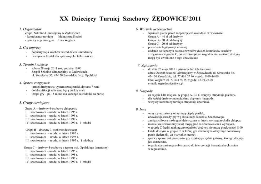 XX Dziecięcy Turniej Szachowy ŻĘDOWICE’2011 1. Organizator Zespół Szkolno-Gimnazjalny w Żędowicach - koordynator turnieju Małgorzata Kozioł - sprawy organizacyjne Ewa Węglarz 2. Cel imprezy - popularyzacja szachów wśród dzieci i młodzieży - nawiązanie kontaktów sportowych i koleżeńskich 3. Termin i miejsce - sobota 28 maja 2011 rok, godzina 10.00 Zespół Szkolno-Gimnazjalny w Żędowicach , ul. Strzelecka 35, 47-120 Zawadzkie /woj. Opolskie/ 6. Warunki uczestnictwa - - 7. Zgłoszenia - 4. System rozgrywek - turniej drużynowy, system szwajcarski, dystans 7 rund do klasyfikacji zaliczane będą punkty małe tempo gry – po 15 minut dla każdego zawodnika na partię 5. Grupy turniejowe Grupa A – drużyny 4-osobowe chłopców; I szachownica – urodz. w latach 1995 r. II szachownica – urodz. w latach 1995 r. III szachownica – urodz. w latach 1997 r. IV szachownica – urodz. w latach 1999 r. i młodsi Grupa B – drużyny 3-osobowe dziewcząt I szachownica – urodz. w latach 1995 r. II szachownica – urodz. w latach 1995 r. III szachownica – urodz. w latach 1997 r. i młodsze Grupa C – drużyny 4-osobowe z terenu woj. Opolskiego (amatorzy) I szachownica – urodz. w latach 1995 r. II szachownica – urodz. w latach 1995 r. III szachownica – urodz. w latach 1997 r. IV szachownica – urodz. w latach 1999 r. i młodsi wpisowe płatne przed rozpoczęciem zawodów, w wysokości: Grupa A – 40 zł od drużyny Grupa B – 30 zł od drużyny Grupa C – 20 zł od drużyny posiadanie legitymacji szkolnej oddanie do depozytu na czas zawodów dwóch kompletów szachów z zegarami (w grupie C, po wcześniejszym uzgodnieniu, niektóre drużyny mogą być zwolnione z tego obowiązku) do dnia 26 maja 2011 r. pisemnie lub telefonicznie adres: Zespół Szkolno-Gimnazjalny w Żędowicach, ul. Strzelecka 35, 47-120 Zawadzkie, tel. 77 461 67 96 w godz. 8.00-14.00, Ewa Węglarz tel. 77 404 85 85 w godz. 18.00-22.00 e-mail: [email protected] 8. Nagrody - za zajęcie I-III miejsca w grupie A, B i C drużyny otrzymują puchary, dla każdej drużyny przewidziano dyplomy i nagrody, wszyscy uczestnicy turnieju otrzymują upominki. 9. Inne - wszyscy uczestnicy otrzymują ciepły posiłek, obowiązują zasady gry wg aktualnego Kodeksu Szachowego, zamiast chłopca może grać dziewczyna w latach wymaganych dla chłopca, młodsi(sze) zawodnicy(czki) mogą grać na szachownicach wyższych, w grupie C średni ranking zawodników drużyny nie może przekraczać 1100 każda drużyna w grupie C, w której gra dziewczyna otrzymuje dodatkowy punkt (jeden pkt. za wszystkie mecze), sprawy sporne dot. przepisów gry rozstrzyga sędzia główny, którego decyzja jest ostateczna, organizator zastrzega sobie prawo do interpretacji i ewentualnych zmian w regulaminie,