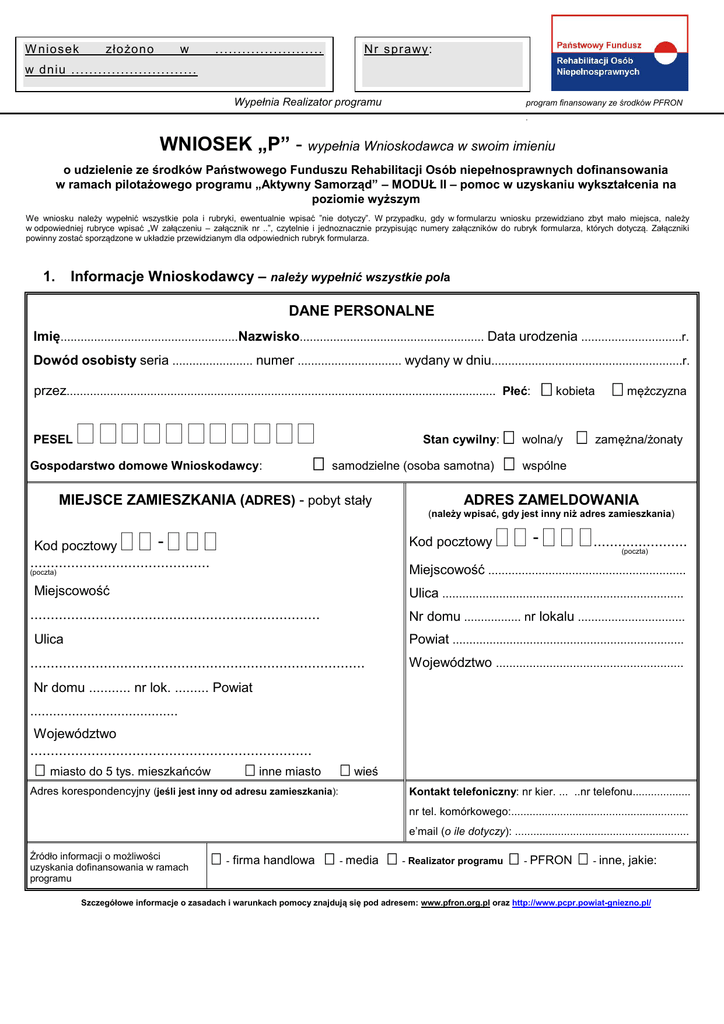 W nios ek złożono w ........................ Nr s prawy: w dniu ............................ Wypełnia Realizator programu program finansowany ze środków PFRON WNIOSEK „P” - wypełnia Wnioskodawca w swoim imieniu o udzielenie ze środków Państwowego Funduszu Rehabilitacji Osób niepełnosprawnych dofinansowania w ramach pilotażowego programu „Aktywny Samorząd” – MODUŁ II – pomoc w uzyskaniu wykształcenia na poziomie wyższym We wniosku należy wypełnić wszystkie pola i rubryki, ewentualnie wpisać ”nie dotyczy”. W przypadku, gdy w formularzu wniosku przewidziano zbyt mało miejsca, należy w odpowiedniej rubryce wpisać „W załączeniu – załącznik nr ..”, czytelnie i jednoznacznie przypisując numery załączników do rubryk formularza, których dotyczą. Załączniki powinny zostać sporządzone w układzie przewidzianym dla odpowiednich rubryk formularza. Informacje Wnioskodawcy – należy wypełnić wszystkie pola 1. DANE PERSONALNE Imię.....................................................Nazwisko....................................................... Data urodzenia ..............................r. Dowód osobisty seria ........................ numer ............................... wydany w dniu.........................................................r. przez................................................................................................................................ Płeć: PESEL Gospodarstwo domowe Wnioskodawcy: Stan cywilny: samodzielne (osoba samotna) MIEJSCE ZAMIESZKANIA (ADRES) - pobyt stały kobieta mężczyzna wolna/y zamężna/żonaty wspólne ADRES ZAMELDOWANIA (należy wpisać, gdy jest inny niż adres zamieszkania) Kod pocztowy - Kod pocztowy ............................................ - ....................... (poczta) Miejscowość ........................................................... (poczta) Miejscowość Ulica ........................................................................ ....................................................................... Nr domu ................. nr lokalu ................................ Ulica Powiat ..................................................................... .................................................................................. Województwo ........................................................ Nr domu ........... nr lok. ......... Powiat ....................................... Województwo ..................................................................... miasto do 5 tys. mieszkańców inne miasto Adres korespondencyjny (jeśli jest inny od adresu zamieszkania): wieś Kontakt telefoniczny: nr kier. ... ..nr telefonu................... nr tel. komórkowego:.......................................................... e’mail (o ile dotyczy): ......................................................... Źródło informacji o możliwości uzyskania dofinansowania w ramach programu - firma handlowa - media - Realizator programu - PFRON - inne, jakie: Szczegółowe informacje o zasadach i warunkach pomocy znajdują się pod adresem: www.pfron.org.pl oraz http://www.pcpr.powiat-gniezno.pl/ W n i o s e k „P ” d o t y c zą c y d o f i n a n s o w a n i a w r a ma c h p i l o t a żo w e g o p r o g r a mu „A k t y w n y s a mo r zą d ” STAN PRAWNY DOT. NIEPEŁNOSPRAWNOŚCI całkowita niezdolność do pracy i do samodzielnej egzystencji znaczny stopień lub całkowita niezdolność do samodzielnej egzystencji całkowita niezdolność do pracy częściowa niezdolność do pracy I grupa inwalidzka umiarkowany stopień lekki stopień Orzeczenie dot. niepełnosprawności ważne jest: II grupa inwalidzka III grupa inwalidzka okresowo do dnia: .............................................. bezterminowo RODZAJ NIEPEŁNOSPRAWNOŚCI NARZĄD RUCHU 05-R, w zakresie: obu kończyn dolnych obu kończyn górnych jednej kończyny dolnej jednej kończyny górnej innym Wnioskodawca nie porusza się przy pomocy wózka inwalidzkiego: Wnioskodawca porusza się samodzielnie przy pomocy wózka inwalidzkiego: Wnioskodawca porusza się niesamodzielnie przy pomocy wózka inwalidzkiego: NARZĄD WZROKU 04-O Lewe oko: Prawe oko: Ostrość wzoru (w korekcji):........................... Ostrość wzoru (w korekcji):........................... osoba niewidoma Zwężenie pola widzenia: ................... stopni Zwężenie pola widzenia: .................... stopni osoba głuchoniewidoma INNE PRZYCZYNY niepełnosprawności wynikające z orzeczenia (proszę zaznaczyć właściwy kod/symbol ): 01-U upośledzenie 03-L zaburzenia głosu, 07-S choroby 09-M choroby 11-I inne umysłowe mowy i choroby słuchu 02-P - OSOBA GŁUCHA 06-E epilepsja choroby psychiczne układu oddechowego i krążenia układu moczowo płciowego 08-T choroby 10-N układu pokarmowego choroby neurologiczne 12-C całościowe zaburzenia rozwojowe wnioskodawca korzysta z pomocy asystenta osoby niepełnosprawnej (należy dołączyć stosowny dokument) wnioskodawca korzysta z pomocy tłumacza migowego (należy dołączyć stosowny dokument) AKTYWNOŚĆ ZAWODOWA niezatrudniona/y: od dnia:........................................ bezrobotna/y poszukująca/y pracy nie dotyczy Nazwa pracodawcy: ................................................. zatrudniona/y: od dnia:...................... do dnia: ................................... Adres miejsca pracy: ............................................... na czas nieokreślony inny, jaki: ............................................ .................................................................................... Telefon kontaktowy do pracodawcy, wymagany do potwierdzenia zatrudnienia: stosunek pracy na podstawie umowy o pracę stosunek pracy na podstawie powołania, wyboru, mianowania oraz spółdzielczej umowy o pracę umowa cywilnoprawna staż zawodowy W n i o s e k „P ” d o t y c zą c y d o f i n a n s o w a n i a w r a ma c h p i l o t a żo w e g o p r o g r a mu 
