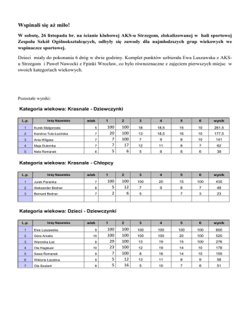 Wspinali się aż miło! W sobotę, 26 listopada br. na ścianie klubowej AKS-u Strzegom, zlokalizowanej w hali sportowej Zespołu Szkół Ogólnokształcących, odbyły się zawody dla najmłodzszych grup wiekowych we wspinaczce sportowej. Dzieci miały do pokonania 6 dróg w dwie godziny. Komplet punktów uzbierała Ewa Luszawska z AKSu Strzegom i Paweł Nawocki z Fpinki Wrocław, co było równoznaczne z zajęciem pierwszych miejsc w swoich kategoriach wiekowych. Pozostałe wyniki: Kategoria wiekowa: Krasnale - Dziewczynki L.p. Imię Nazwisko wiek 1 Kurek Małgorzata 5 2 Karolina Tola Łozińska 7 3 Ania Wilgosz 7 4 Maja Dulemba 7 5 Nela Romanek 6 1 100 20 7 7 5 2 3 4 5 6 wynik 100 100 100 17 6 18 18,5 15 10 261,5 13 18,5 16 10 177,5 7 9 8 10 141 12 11 8 7 62 5 8 8 6 38 2 3 4 5 6 wynik 100 20 15 100 435 7 9 8 7 48 7 3 23 Kategoria wiekowa: Krasnale - Chłopcy L.p. Imię Nazwisko wiek 1 Jurek Panenka 7 2 Aleksander Bodnar 8 3 Bernard Bodnar 7 1 100 5 2 100 12 6 5 Kategoria wiekowa: Dzieci - Dziewczynki L.p. Imię Nazwisko wiek 1 Ewa Luszawska 9 2 Góra Amelia 10 3 Weronika Łoś 8 4 Ola Haglauer 10 5 Sawa Romanek 9 6 Wiktoria Łazebna 9 7 Ola Szubert 8 1 100 100 29 23 7 5 5 2 100 100 100 100 100 12 16 3 4 5 6 wynik 100 100 100 100 600 100 100 20 100 520 13 19 15 100 276 12 19 14 10 178 8 16 14 10 155 13 11 8 9 58 5 10 7 8 51 Kategoria wiekowa: Młodzice - Chłopcy L.p. Imię Nazwisko wiek 1 Paweł Nawocki 12 2 Michał Ostrowski 10 3 Krzysztof Wronowski 11 4 Kamil Zakolski 10 5 Michał Bodnar 10 1 100 100 100 10 10 2 100 100 100 100 100 3 4 5 6 wynik 100 100 100 100 600 100 100 19 100 519 100 100 18 100 518 13 18,5 13 10 164,5 12 18 14 10 164 3 4 5 6 wynik 100 22 20 100 442 15 19 15 9 180 Kategoria wiekowa: Juniorzy młodsi - Dziewczynki L.p. Imię Nazwisko wiek 1 Izabela Nowak 14 2 Karina Borowy 14 1 100 22 2 100 100 W kategorii dzieci - dziewczynki na podium znalazły się same zawodniczki AKS-u Strzegom. Na zdjęciu najmłodsza uczestniczka zawodów i jednocześnie najlepsza w swojej kategorii wiekowej Małgorzata Kurek Alpika, Fpinka Wrocław. Całość została zorganizowana przez instruktorów AKS-u Strzegom i szkoły wspinania Alpika. Sponsorami oraz patronami zawodów był: Dolnośląski Urząd Marszałkowski, Urząd Miejski w Strzegomiu, AKS Strzegom, rodzice i opiekunowie zawodników. Specjalne podziękowania dla prezesa AKS-u Strzegom - Wiesława Witkowskiego logistyczne i pomoc. za wsparcie Robert Grabowicz Szkoła wspinania „Alpika”
