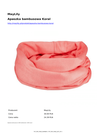 MayLily Apaszka bambusowa Koral http://maylily.pl/produkt/apaszka-bambusowa-koral Producent MayLily Cena 30.00 PLN Cena netto 24.39 PLN Apaszka bambusowa to 100% delikatności i 200% stylu! TXT_PDF_PAGE_NUMBER 1 TXT_PDF_PAGE_OUT_OF 2 Pięknie układa się pod szyjką, chroniąc ją przed wiatrem Została wykonana z najmilszej w dotyku dzianiny bambusowej, która posiada właściwości antybakteryjne Łatwo się ją zakłada, nie posiada zapięć Jest w rozmiarze uniwersalnym - pasuje zarówno na rocznego malucha, jak i na starszaka Cechy produktu Kolor Koralowy Skład 95% bambus, 5% elastan TXT_PDF_PAGE_NUMBER 2 TXT_PDF_PAGE_OUT_OF 2