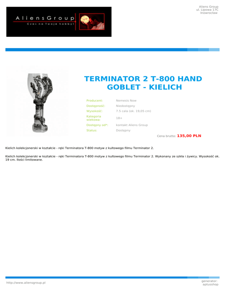 Aliens Group ul. Lipowa 17C Inowrocław TERMINATOR 2 T-800 HAND GOBLET - KIELICH Producent: Nemesis Now Dostępność: Niedostępny Wysokość: 7.5 cala (ok. 19,05 cm) Kategoria wiekowa: 18+ Dostępny od*: kontakt Aliens Group Status: Dostępny Cena brutto: 135,00 PLN Kielich kolekcjonerski w kształcie - ręki Terminatora T-800 motyw z kultowego filmu Terminator 2. Kielich kolekcjonerski w kształcie - ręki Terminatora T-800 motyw z kultowego filmu Terminator 2. Wykonany ze szkła i żywicy. Wysokość ok. 19 cm. Ilości limitowane. http://www.aliensgroup.pl generator: aptusshop