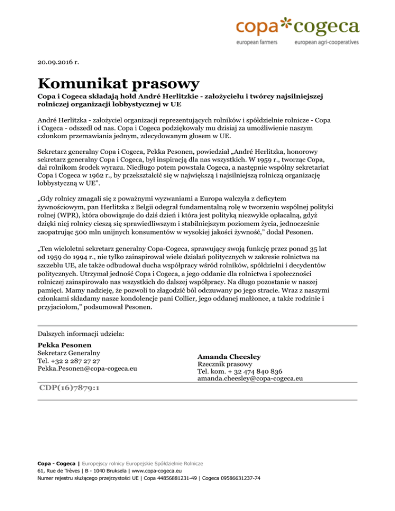 20.09.2016 r. Komunikat prasowy Copa i Cogeca składają hołd André Herlitzkie - założycielu i twórcy najsilniejszej rolniczej organizacji lobbystycznej w UE André Herlitzka - założyciel organizacji reprezentujących rolników i spółdzielnie rolnicze - Copa i Cogeca - odszedł od nas. Copa i Cogeca podziękowały mu dzisiaj za umożliwienie naszym członkom przemawiania jednym, zdecydowanym głosem w UE. Sekretarz generalny Copa i Cogeca, Pekka Pesonen, powiedział „André Herlitzka, honorowy sekretarz generalny Copa i Cogeca, był inspiracją dla nas wszystkich. W 1959 r., tworząc Copa, dał rolnikom środek wyrazu. Niedługo potem powstała Cogeca, a następnie wspólny sekretariat Copa i Cogeca w 1962 r., by przekształcić się w największą i najsilniejszą rolniczą organizację lobbystyczną w UE”. „Gdy rolnicy zmagali się z poważnymi wyzwaniami a Europa walczyła z deficytem żywnościowym, pan Herlitzka z Belgii odegrał fundamentalną rolę w tworzeniu wspólnej polityki rolnej (WPR), która obowiązuje do dziś dzień i która jest polityką niezwykle opłacalną, gdyż dzięki niej rolnicy cieszą się sprawiedliwszym i stabilniejszym poziomem życia, jednocześnie zaopatrując 500 mln unijnych konsumentów w wysokiej jakości żywność,” dodał Pesonen. „Ten wieloletni sekretarz generalny Copa-Cogeca, sprawujący swoją funkcję przez ponad 35 lat od 1959 do 1994 r., nie tylko zainspirował wiele działań politycznych w zakresie rolnictwa na szczeblu UE, ale także odbudował ducha współpracy wśród rolników, spółdzielni i decydentów politycznych. Utrzymał jedność Copa i Cogeca, a jego oddanie dla rolnictwa i społeczności rolniczej zainspirowało nas wszystkich do dalszej współpracy. Na długo pozostanie w naszej pamięci. Mamy nadzieję, że pozwoli to złagodzić ból odczuwany po jego stracie. Wraz z naszymi członkami składamy nasze kondolencje pani Collier, jego oddanej małżonce, a także rodzinie i przyjaciołom,” podsumował Pesonen. Dalszych informacji udziela: Pekka Pesonen Sekretarz Generalny Tel. +32 2 287 27 27 [email protected] Amanda Cheesley Rzecznik prasowy Tel. kom. + 32 474 840 836 [email protected] CDP(16)7879:1 Copa - Cogeca | Europejscy rolnicy Europejskie Spółdzielnie Rolnicze 61, Rue de Trèves | B - 1040 Bruksela | www.copa-cogeca.eu Numer rejestru służącego przejrzystości UE | Copa 44856881231-49 | Cogeca 09586631237-74