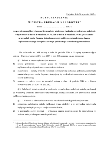 Projekt z dnia 30 stycznia 2017 r. ROZPORZĄDZENIE M I N I S T R A E D U K A C J I N A R O D O W E J 1) z dnia …………………………. 2017 r. w sprawie szczegółowych zasad i warunków udzielania i cofania zezwolenia na założenie odpowiednio z dniem 1 września 2017 r. lub z dniem 1 września 2018 r. przez osobę prawną lub osobę fizyczną dotychczasowego publicznego trzyletniego liceum ogólnokształcącego i dotychczasowego publicznego czteroletniego technikum Na podstawie art. 366 ustawy z dnia 14 grudnia 2016 r. Przepisy wprowadzające ustawę – Prawo oświatowe (Dz. U. z 2017 r. poz. 60) zarządza się, co następuje: § 1. Ilekroć w rozporządzeniu jest mowa o: 1) szkole publicznej — należy przez to rozumieć publiczne trzyletnie liceum ogólnokształcące i publiczne czteroletnie technikum; 2) założycielu — należy przez to rozumieć osobę prawną niebędącą jednostką samorządu terytorialnego oraz osobę fizyczną, ubiegającą się o udzielenie zezwolenia na założenie szkoły publicznej; 3) ustawie — należy przez to rozumieć ustawę z dnia 14 grudnia 2016 r. – Prawo oświatowe (Dz. U. z 2017 r. poz. 59). § 2. Założyciel składa wniosek o udzielenie zezwolenia na założenie szkoły publicznej do właściwej jednostki samorządu terytorialnego, której zadaniem jest prowadzenie szkół publicznych danego typu. § 3. 1. Wniosek o udzielenie zezwolenia na założenie szkoły publicznej zawiera: 1) oznaczenie założyciela szkoły publicznej i jego siedziby, a w przypadku założyciela będącego osobą fizyczną — miejsca zamieszkania; 2) w przypadku osoby prawnej — wskazanie organu uprawnionego do prowadzenia w imieniu założyciela spraw szkoły publicznej; 1) Minister Edukacji Narodowej kieruje działem administracji rządowej – oświata i wychowanie, na podstawie § 1 ust. 2 rozporządzenia Prezesa Rady Ministrów z dnia 17 listopada 2015 r. w sprawie szczegółowego zakresu działania Ministra Edukacji Narodowej (Dz. U. poz. 1903). –2– 3) określenie typu szkoły publicznej, daty rozpoczęcia jej działalności, przewidywanej liczby uczniów (słuchaczy) oraz: a) w przypadku dotychczasowego czteroletniego technikum – zawodu lub zawodów, w jakich technikum będzie kształcić, b) w przypadku dotychczasowego trzyletniego liceum ogólnokształcącego specjalnego lub dotychczasowego czteroletniego technikum specjalnego — rodzaju niepełnosprawności uczniów, dla których tworzy się szkołę; 4) wskazanie miejsca prowadzenia szkoły publicznej, wraz z informacją o jej warunkach lokalowych oraz wyposażeniu w pomoce dydaktyczne i sprzęt niezbędny do realizacji zadań statutowych. 2. Do wniosku o udzielenie zezwolenia na założenie szkoły publicznej dołącza się: 1) aktualny odpis z Krajowego Rejestru Sądowego i kopię statutu lub innego dokumentu stanowiącego podstawę funkcjonowania osoby prawnej, a w przypadku osoby fizycznej — wypis z dowodu osobistego potwierdzający imię i nazwisko oraz miejsce zamieszkania; 2) projekt aktu założycielskiego szkoły publicznej; 3) projekt statutu szkoły publicznej; 4) opinie właściwego miejscowo komendanta powiatowego (miejskiego) Państwowej Straży Pożarnej i państwowego powiatowego inspektora sanitarnego o warunkach bezpieczeństwa i higieny w budynku, w którym będzie się mieścić szkoła publiczna, i najbliższym jego otoczeniu; 5) wykaz nauczycieli przewidzianych do zatrudnienia w szkole publicznej, wraz z informacją o ich kwalifikacjach; 6) zobowiązanie do zapewnienia warunków działania szkoły publicznej, w tym bezpiecznych i higienicznych warunków nauki, wychowania i opieki, oraz zobowiązanie do przestrzegania przepisów dotyczących szkół publicznych. 3. Dokument stanowiący podstawę funkcjonowania osoby prawnej mającej siedzibę za granica, o którym mowa w ust. 2 pkt 1, wymaga poświadczenia przez właściwą ze względu na siedzibę założyciela polską placówkę dyplomatyczną. Jeżeli dokument taki został sporządzony w języku obcym, należy go przedstawić wraz z uwierzytelnionym tłumaczeniem na język polski. § 4. Zezwolenie na założenie szkoły publicznej jest udzielane, jeżeli: –3– 1) statut lub inny dokument stanowiący podstawę funkcjonowania osoby prawnej będącej założycielem przewiduje prowadzenie przez nią działalności oświatowej; 2) projekt aktu założycielskiego i projekt statutu szkoły publicznej są zgodne z przepisami ustawy i aktów prawnych wydanych na jej podstawie; 3) warunki lokalowe oraz wyposażenie szkoły publicznej w pomoce dydaktyczne i sprzęt zapewniają realizację statutowych zadań szkoły publicznej, w tym bezpieczne i higieniczne warunki nauki, wychowania i opieki; 4) nauczyciele posiadają kwalifikacje wymagane do zatrudnienia w szkole publicznej danego typu i rodzaju; 5) utworzenie szkoły w miejscowości wskazanej przez założyciela stanowi korzystne uzupełnienie sieci szkół publicznych w tej miejscowości, gminie, powiecie, województwie lub regionie; 6) w przypadku dotychczasowego czteroletniego technikum — proponowany zawód lub zawody są zgodne z klasyfikacją zawodów szkolnictwa zawodowego. § 5. 1. Zezwolenie na założenie szkoły publicznej określa założyciela i jego siedzibę lub miejsce zamieszkania, typ szkoły, jej nazwę, adres i termin rozpoczęcia działalności oraz: 1) w przypadku dotychczasowego czteroletniego technikum — zawód lub zawody, w jakich kształci technikum; 2) w przypadku dotychczasowego trzyletniego liceum ogólnokształcącego specjalnego lub dotychczasowego czteroletniego technikum specjalnego — rodzaj niepełnosprawności uczniów, dla których tworzy się szkołę. 2. Zezwolenie na założenie szkoły publicznej wydaje się na czas nieokreślony. § 6. 1. Udzielenie i odmowa udzielenia zezwolenia na założenie szkoły publicznej następuje w drodze decyzji administracyjnej. 2. Jednostka samorządu terytorialnego prowadzi rejestr wydany