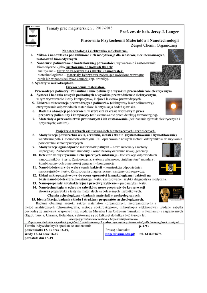 MATERIALS 2017-2018 Tematy prac magisterskich 2012/2013 Prof. zw. dr hab. Jerzy J. Langer Prof. UAM dr hab. Jerzy J. Langer nano TECHNOLOGY Pracownia Fizykochemii Materiałów i Nanotechnologii Zespół Chemii Organicznej Nanotechnologia i elektronika molekularna. Mikro- i nanowłókna polianilinowe i ich modyfikacje dla sensorów, sieci neuronowych, zastosowań biomedycznych. 2. Nanorurki polimerowe o kontrolowanej porowatości, wytwarzanie i zastosowania: biomedyczne - jako rusztowania do hodowli tkanek; analityczne - filtry do zagęszczania i detekcji nanocząstek; biotechnologiczne – materiały hybrydowe zwierające uwięzione wewnątrz rurek lub w nanosieci żywe komórki (np. drożdży). 3. Syntezy w mikrokroplach. Fizykochemia materiałów. Przewodzące polimery: Polianilina i inne polimery o wysokim przewodnictwie elektrycznym. 4. Synteza i badania nowych pochodnych o wysokim przewodnictwie elektrycznym, w tym wytwarzanie i testy kompozytów, klejów i lakierów przewodzących. 5. Elektroluminescencja przewodzących polimerów (elektryczny laser polimerowy), otrzymywanie odpowiednich materiałów. Kontynuacja badań zjawiska. 6. Badania absorpcji podczerwieni w szerokim zakresie widmowym przez preparaty polianiliny i kompozyty (cel: ekranowanie przed detekcją termowizyjną). 7. Materiały o przewodnictwie protonowym i ich zastosowania (cel: badania zjawisk elektrycznych i optycznych; kataliza). 1. Projekty o ważnych zastosowaniach biomedycznych i technicznych. Modyfikacja powierzchni szkła, ceramiki, metali i tkanin (hydrofobowanie i hydrofilowanie) warstwami poli- i monomolekularnymi. Cel: opracowanie nowych metod i odczynników do uzyskania powierzchni samoczyszczących. 9. Modyfikacje ognioodporne materiałów palnych – nowe materiały i metody impregnacji.Zastosowania: mundury i kombinezony ochronne nowej generacji. 10. Detektor do wykrywania niebezpiecznych substancji – konstrukcja odpowiednich nanoczujników i testy. Zastosowania: systemy alarmowe, „inteligentne” mundury i kombinezony ochronne nowej generacji - kontynuacja. 11. Nanobiodetektory do wykrywania bakterii – konstrukcja odpowiednich nanoczujników i testy. Zastosowania diagnostyczne i systemy ostrzegawcze. 12. Układ mikroprzepływowy do oceny oporności farmakologicznej bakterii na bazie nanobiodetektora, konstrukcja i testy. Zastosowanie: szybka diagnostyka medyczna. 13. Nano-preparaty antybakteryjne i przeciwgrzybiczne – preparatyka i testy. 14. Nanotechnologia w ochronie zabytków: nowe preparaty do konserwacji drewna preparatyka i testy na materiałach współczesnych i zabytkowych. Chemia acheologiczna - badania materiałów archeologicznych. 15. Identyfikacja, badania składu i struktury preparatów archeologicznych. Badania obejmują szeroki zakres materiałów (organicznych, nieorganicznych) i metod analitycznych (chromatografia, metody spektroskopowe, mikroskopia elektronowa). Badane zabytki pochodzą ze znalezisk krajowych (np. siedziba Mieszka I na Ostrowiu Tumskim w Poznaniu) i zagranicznych (Egipt, Turcja, Ukraina, Holandia), a datowane są od kilkuset do kilku (5-6) tysięcy lat. 8. Szczegóły przedstawione zostaną w bezpośredniej rozmowie. Zapraszam studentów wszystkich specjalności, zainteresowanych praktycznym wykorzystaniem wiedzy dla innowacyjnych rozwiązań Termin indywidualnych spotkań ze studentami: poniedziałki 12-13 oraz 16-19, środy 12-14 oraz 16-19 pozostałe dni 13-19 p. 4.93 Proszę o kontakt: [email protected]; tel. 61 8291676