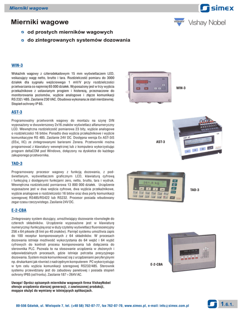Mierniki wagowe Mierniki wagowe od prostych mierników wagowych do zintegrowanych systemów dozowania WIN-3 WskaŸnik wagowy z czterodekadowym 15 mm wyœwietlaczem LED, wskazuj¹cy wagê netto, brutto i tara. Rozdzielczoœæ pomiaru do 3000 dzia³ek dla sygna³u wejœciowego 1 mV/V przy rozdzielczoœci przetwarzania co najmniej 65 000 dzia³ek. Wyposa¿ony jest w trzy wyjœcia przekaŸnikowe z ustawianym progiem i histerez¹, przeznaczone do monitorowania poziomów, wyjœcie analogowe i z³¹cze komunikacji RS 232 / 485. Zasilanie 230 VAC. Obudowa wykonana ze stali nierdzewnej. Stopieñ ochrony IP 65. WIN-3 AST-3 Programowalny przetwornik wagowy do monta¿u na szynê DIN wyposa¿ony w dwuwierszowy 2x16 znaków wyœwietlacz alfanumeryczny LCD. Wewnêtrzna rozdzielczoœæ pomiarowa 23 bity, wyjœcie analogowe o rozdzielczoœci 16 bitów. Ponadto dwa wyjœcia przekaŸnikowe i wyjœcie komunikacyjne RS 485. Zasilanie 24V DC. Dostêpna wersja Ex AST-3iS (EExia IIC) ze zintegrowanymi barierami Zenera. Przetworniki mo¿na programowaæ z klawiatury wewnêtrznej lub z komputera wykorzystuj¹c program deltaCOM pod Windows, do³¹czony na dyskietce do ka¿dego zakupionego przetwornika. AST-3 TAD-3 Programowany procesor wagowy z funkcj¹ dozowania, z podœwietlanym, wyœwietlaczem graficznym LCD, klawiatur¹ cyfrow¹ i funkcyjn¹ z dostêpnymi funkcjami zero, netto, brutto, tara i wydruk. Wewnêtrzna rozdzielczoœæ pomiarowa 13 800 000 dzia³ek. Urz¹dzenie wyposa¿one jest w dwa wejœcia cyfrowe, dwa wyjœcia przekaŸnikowe, wyjœcie analogowe o rozdzielczoœci 16 bitów oraz dwa porty komunikacji szeregowej RS485/RS422 lub RS232. Procesor posiada wbudowany zegar czasu rzeczywistego. Zasilanie 24V DC. TAD-3 E-2-CBA Zintegrowany system dozuj¹cy, umo¿liwiaj¹cy dozowanie równoleg³e do czterech sk³adników. Urz¹dzenie wyposa¿one jest w klawiaturê numeryczn¹ i funkcyjn¹ oraz w du¿y czytelny wyœwietlacz fluoroscencyjny 256 x 64 piksele (8 linii po 40 znaków). Pamiêæ systemu umo¿liwia zapis do 100 receptur komponowanych z 64 sk³adników. W procesach dozowania istnieje mo¿liwoœæ wykorzystania do 64 wejœæ i 64 wyjœæ cyfrowych do kontroli procesu komponowania lub do³¹czenia do sterownika PLC. Pozwala to na stosowanie urz¹dzenia w z³o¿onych i odpowiedzialnych procesach, gdzie istnieje potrzeba precyzyjnego dozowania. System mo¿e komunikowaæ siê z urz¹dzeniami peryferyjnymi np. drukarkami jak równie¿ z nadrzêdnym komputerem PC wykorzystuj¹c w tym celu wyjœcia komunikacji szeregowej RS232/485. Sterownik systemu przewidziany jest do zabudowy panelowej i posiada stopieñ ochrony IP65 (od frontu). Zasilanie 187 ÷ 264V AC. E-2-CBA Uwaga! Oprócz opisanych mierników wagowych firma VishayNobel oferuje urz¹dzenia starszej generacji, z zawieszonej produkcji, mog¹ce s³u¿yæ do wymiany w istniej¹cych aplikacjach. 80-556 Gdañsk, ul. Wielopole 7, tel. (+48 58) 762-07-77, fax 762-07-70, www.simex.pl, e-mail: [email protected] 1.6.1.