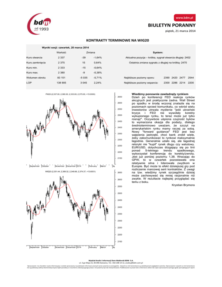 BIULETYN PORANNY piątek, 21 marca 2014 KONTRAKTY TERMINOWE NA WIG20 Wyniki sesji: czwartek, 20 marca 2014 Wartość Zmiana System: Kurs otwarcia 2 337 -39 -1,64% Aktualna pozycja – krótka, sygnał otwarcia długiej- 2402 Kurs zamknięcia 2 375 15 0,64% Ostatnia zmiana sygnału z długiej na krótką- 2470 Kurs min. 2 333 -15 -0,64% Kurs max. 2 380 -9 -0,38% Wolumen obrotu 83 151 -5 035 -5,71% LOP 138 905 3 045 2,24% Najbliższe poziomy oporu: 2390 2420 2477 2544 Najbliższe poziomy wsparcia: 2300 2286 2214 2200 FW20 (2,337.00, 2,380.00, 2,333.00, 2,375.00, +15.0000) 2650 2600 2550 2500 2450 2400 2350 2300 2250 2200 2150 September October November December 2014 February March Ap WIG20 (2,351.44, 2,389.32, 2,348.66, 2,374.37, +13.6001) 2650 2600 2550 Wiedźmy ponownie zawładnęły rynkiem Dzień po konferencji FED reakcja rynków akcyjnych jest praktycznie żadna. Wall Street po spadku w środę wczoraj znalazła się na poziomach sprzed komunikatu, co wśród wielu inwestorów utrwala myślenie "jeśli ukraiński kryzys i FED nie wywołały korekty wykupionego rynku, to teraz może już tylko rosnąć". Oczywiście uśpiona czujność byków to wymarzona okazja dla podaży, dlatego średnioterminowo uważam, że szczyt na amerykańskim rynku mamy raczej za sobą. Nowy "forward guidance" FED jest bez wątpienia jastrzębi, choć bank zrobił wiele, żeby zakomunikować to rynkowi maksymalnie łagodnie. Generalnie udało się, ale łagodnej retoryki nie "kupił" rynek długu czy walutowy. EUR/USD, dotychczas ślizgający się po linii ponad 5-letniego trendu spadkowego, wykorzystał konferencję do korekty/zwrotu. Jest już poniżej poziomu 1,38. Wracając do GPW, to w czwartek pozostawała ona relatywnie silna i liderowała zwyżkom w Europie. Być może to efekt dzisiejszej gry pod rozliczenie marcowej serii kontraktów. Z uwagi na tzw. wiedźmy rynek szczególnie dzisiaj może zachowywać się mniej racjonalnie niż zwykle. W rezultacie najlepiej przyglądać się temu z boku. Krystian Brymora 2500 2450 2400 2350 2300 2250 2200 2150 September October November December 2014 February March Ap Wydział Analiz i Informacji Dom Maklerski BDM S.A. ul. 3‐go Maja 23, 40‐096 Katowice, Tel.: 032 208 14 12, [email protected] Opracowanie ma charakter czysto informacyjny i zostało opracowany na podstawie informacji uznanych przez autorów za wiarygodne . Zawarte w nim komentarze są subiektywnymi poglądami autorów. Opracowanie i zawarte w nim komentarze nie są podstawą żadnej rekomendacji kupna bądź sprzedaży w rozumieniu obowiązującego prawa i nie powinny być tak interpretowane. Publikowanie w prasie lub w Internecie całości lub części opracowania wymaga zgody sporządzających raport. BIULETYN PORANNY piątek, 21 marca 2014 RYNEK AKCJI Wyniki sesji: czwartek, 20 marca 2014 52 tygodnie Indeks Kurs otwarcia Kurs zamknięcia Zmiana [%] Kurs min. Kurs max. Zakres wahań Wartość obrotów [mln PLN] Kurs max. Kurs min. WIG20 2 625,8 2 150,8 2 351,44 2 374,37 0,58% 2 348,66 2 389,32 40,7 1120 WIG30 2 764,4 2 416,9 2 497,43 2 521,58 0,60% 2 495,19 2 532,97 37,8 1170 sWIG80 15 156,8 10 183,5 13 256,22 13 321,98 0,36% 13 243,25 13 321,98 78,7 33 mWIG40 3 599,3 2 453,4 3 349,08 3 378,66 0,70% 3 348,79 3 380,83 32,0 92 WIG-PL 56 438,7 43 438,1 51 656,55 51 854,87 0,58% 51 656,55 51 854,87 198,3 WIG 55 384,8 42 842,1 50 208,37 50 627,71 0,53% 50 187,95 50 796,79 608,8 Spółka Cena [PLN] Mkt Cap [mln PLN] ALIOR BANK 87,50 ASSECOPOL AZOTY TARNÓW zmiana % 1280 zmiana % względem WIG30 dzienna 1M 3M 6M dzienna 1M 3M 6M 6 120 0,3% -4,9% 8,6% -1,7% -0,3% -0,4% 9,1% -0,2% 47,50 3 943 -1,0% 1,2% 4,9% 0,6% -1,6% 5,7% 5,4% 2,1% 56,20 5 575 0,9% 5,8% -5,5% -27,7% 0,3% 10,3% -5,0% -26,2% BANK HANDLOWY 107,20 14 007 -0,6% -1,9% 5,5% -0,2% -1,2% 2,6% 6,0% 1,2% BOGDANKA 120,00 4 082 5,4% -4,4% -5,5% 8,1% 4,8% 0,1% -5,0% 9,5% BORYSZEW 0,47 1 034 0,0% -14,5% -9,6% -16,1% -0,6% -10,0% -9,1% -14,6% BRE 508,00 21 425 0,5% -4,7% 3,0% 17,2% -0,1% -0,2% 3,5% 18,6% BZ WBK 402,25 37 629 0,1% -2,1% 5,9% 21,5% -0,5% 2,4% 6,4% 23,0% CCC 126,70 4 865 1,4% -2,5% 12,2% 12,1% 0,8% 2,0% 12,7% 13,6% CYFROWY POLSAT 20,88 7 274 1,6% 2,2% 7,7% -3,3% 1,0% 6,7% 8,2% -1,9% ENEA 14,80 6 533 0,0% -0,9% 7,2% 3,9% -0,6% 3,6% 7,7% 5,3% EUROCASH 39,82 5 513 2,1% -10,6% -14,1% -21,9% 1,5% -6,1% -13,6% -20,5% GTC 7,05 2 477 4,6% -1,3% -6,4% -2,1% 4,0% 3,2% -5,9% -0,7% ING BSK 132,00 17 173 1,5% -0,4% 15,0% 25,4% 0,9% 4,1% 15,5% 26,8% JSW 43,60 5 119 -1,2% -17,0% -19,3% -46,2% -1,8% -12,5% -18,8% -44,7% KERNEL 28,40 2 263 3,6% -20,4% -25,4% -45,1% 3,0% -15,9% -24,9% -43,7% KGHM 99,90 19 980 -0,6% -13,1% -12,4% -21,0% -1,2% -8,6% -11,9% -19,6% LOTOS 36,35 4 721 -1,1% -7,5% 2,6% -1,8% -1,7% -3,0% 3,1% -0,4% 8 600,00 15 748 1,2% -11,9% -1,1% 4,9% 0,6% -7,4% -0,6% 6,3% NETIA 5,03 1 750 1,2% 0,2% 0,6% 2,4% 0,6% 4,7% 1,1% 3,9% PEKAO 187,50 49 213 0,5% -2,0% 5,2% 5,9% -0,1% 2,5% 5,7% 7,4% PGE 18,70 34 965 1,1% 1,2% 8,3% 6,2% 0,5% 5,7% 8,8% 7,7% PGNIG 4,34 25 606 -0,9% -13,9% -18,0% -30,0% -1,5% -9,4% -17,5% -28,6% PKNORLEN 40,70 17 408 -0,7% -5,7% 0,5% -9,3% -1,3% -1,2% 1,0% -7,9% PKOBP 41,01 51 263 0,8% -5,0% 2,0% 13,6% 0,2% -0,5% 2,5% 15,0% PZU LPP 413,60 35 715 1,1% -3,9% -8,9% -6,0% 0,5% 0,6% -8,4% -4,6% SYNTHOS 5,02 6 643 0,2% -3,3% -7,9% -2,5% -0,4% 1,2% -7,4% -1,1% TAURON 5,07 8 885 0,4% 4,8% 10,7% 5,2% -0,2% 9,3% 11,2% 6,6% TPSA 10,75 14 108 2,3% 4,2% 10,6% 37,8% 1,7% 8,7% 11,1% 39,2% TVN 16,20 5 633 -1,2% -0,6% 12,5% 15,7% -1,8% 3,9% 13,0% 17,1% Wydział Analiz i Informacji Dom Maklerski BDM S.A. ul. 3‐go Maja 23, 40‐096 Katowice, Tel.: 032 208 14 12, [email protected] Opracowanie ma charakter czysto informacyjny i zostało opracowany na podstawie informacji uznanych przez autorów za wiarygodne . Zawarte w nim komentarze są subiektywnymi poglądami autorów. Opracowanie i zawarte w nim komentarze nie są podstawą żadnej rekomendacji kupna bądź sprzedaży w rozumieniu obowiązującego prawa i nie powinny być tak interpr