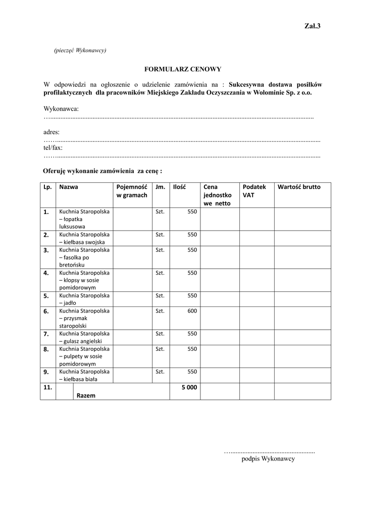 Zał.3 (pieczęć Wykonawcy) FORMULARZ CENOWY W odpowiedzi na ogłoszenie o udzielenie zamówienia na : Sukcesywna dostawa posiłków profilaktycznych dla pracowników Miejskiego Zakładu Oczyszczania w Wołominie Sp. z o.o. Wykonawca: …............................................................................................................................................................ adres: ……............................................................................................................................................................ tel/fax: ……............................................................................................................................................................ Oferuję wykonanie zamówienia za cenę : Lp. Nazwa 1. Kuchnia Staropolska – łopatka luksusowa Kuchnia Staropolska – kiełbasa swojska Kuchnia Staropolska – fasolka po bretońsku Kuchnia Staropolska – klopsy w sosie pomidorowym Kuchnia Staropolska – jadło Kuchnia Staropolska – przysmak staropolski Kuchnia Staropolska – gulasz angielski Kuchnia Staropolska – pulpety w sosie pomidorowym Kuchnia Staropolska – kiełbasa biała 2. 3. 4. 5. 6. 7. 8. 9. 11. Pojemność w gramach Jm. Ilość Cena jednostko we netto Szt. 550 Szt. 550 Szt. 550 Szt. 550 Szt. 550 Szt. 600 Szt. 550 Szt. 550 Szt. 550 Podatek VAT Wartość brutto 5 000 Razem ….................................................. podpis Wykonawcy