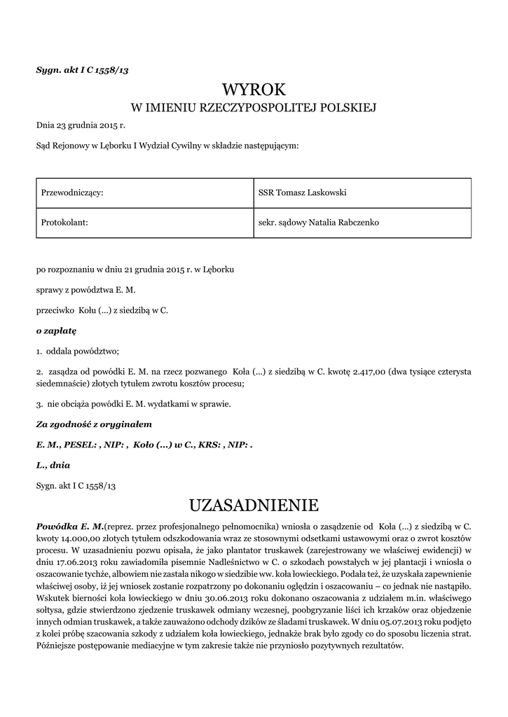 Sygn. akt I C 1558/13 WYROK W IMIENIU RZECZYPOSPOLITEJ POLSKIEJ Dnia 23 grudnia 2015 r. Sąd Rejonowy w Lęborku I Wydział Cywilny w składzie następującym: Przewodniczący: SSR Tomasz Laskowski Protokolant: sekr. sądowy Natalia Rabczenko po rozpoznaniu w dniu 21 grudnia 2015 r. w Lęborku sprawy z powództwa E. M. przeciwko Kołu (...) z siedzibą w C. o zapłatę 1. oddala powództwo; 2. zasądza od powódki E. M. na rzecz pozwanego Koła (...) z siedzibą w C. kwotę 2.417,00 (dwa tysiące czterysta siedemnaście) złotych tytułem zwrotu kosztów procesu; 3. nie obciąża powódki E. M. wydatkami w sprawie. Za zgodność z oryginałem E. M., PESEL: , NIP: , Koło (...) w C., KRS: , NIP: . L., dnia Sygn. akt I C 1558/13 UZASADNIENIE Powódka E. M.(reprez. przez profesjonalnego pełnomocnika) wniosła o zasądzenie od Koła (...) z siedzibą w C. kwoty 14.000,00 złotych tytułem odszkodowania wraz ze stosownymi odsetkami ustawowymi oraz o zwrot kosztów procesu. W uzasadnieniu pozwu opisała, że jako plantator truskawek (zarejestrowany we właściwej ewidencji) w dniu 17.06.2013 roku zawiadomiła pisemnie Nadleśnictwo w C. o szkodach powstałych w jej plantacji i wniosła o oszacowanie tychże, albowiem nie zastała nikogo w siedzibie ww. koła łowieckiego. Podała też, że uzyskała zapewnienie właściwej osoby, iż jej wniosek zostanie rozpatrzony po dokonaniu oględzin i oszacowaniu – co jednak nie nastąpiło. Wskutek bierności koła łowieckiego w dniu 30.06.2013 roku dokonano oszacowania z udziałem m.in. właściwego sołtysa, gdzie stwierdzono zjedzenie truskawek odmiany wczesnej, poobgryzanie liści ich krzaków oraz objedzenie innych odmian truskawek, a także zauważono odchody dzików ze śladami truskawek. W dniu 05.07.2013 roku podjęto z kolei próbę szacowania szkody z udziałem koła łowieckiego, jednakże brak było zgody co do sposobu liczenia strat. Późniejsze postępowanie mediacyjne w tym zakresie także nie przyniosło pozytywnych rezultatów. Pozwany Koło (...) z siedzibą w C. (reprez. przez profesjonalnego pełnomocnika) w odpowiedzi na pozew wniósł o oddalenie powództwa w całości i zasądzenie stosownych kosztów procesu. Wskazywano, że żądanie pozwu pozostaje nieudowodnione, a nadto zaprzeczono, aby kołu łowieckiemu kiedykolwiek złożony został bezpośrednio wniosek o oszacowanie szkody w opisanej w pozwie plantacji czy też informacja o oględzinach. Opisano również, że w szacowaniu z dnia 05.07.2013 roku uczestniczyła E. M., która jednak ostatecznie nie dopuściła przedstawicieli koła do wymaganych i koniecznych czynności, ograniczając się do żądania zapłaty. Z możliwych ustaleń wynikało natomiast, że szkody - pomimo stwierdzenia śladów zwierzyny łownej - były znikome i nie kwalifikowały się do wypłaty odszkodowania, a nadto uprawa truskawek była zachwaszczona i słabej jakości. Dodatkowo koło łowieckie należycie zabezpieczało plantację za pomocą środków odstraszania - pomimo sprzeciwu plantatora co do budowy ambony myśliwskiej /vide: k. 20-29/. Sąd ustalił następujący stan faktyczny: W czerwcu 2013 roku E. M. (plantator truskawek zarejestrowany w stosownej ewidencji – vide: k. 7) złożyła na ręce pracownika Nadleśnictwa C. M. M. (1) – a z pominięciem oficjalnego urzędowego obiegu - pismo zawierające informację o zniszczeniach i szkodach powstałych w jej plantacji położonej w K. /vide: zeznania świadka M. M. na k. 115-115v/. W dniu 30.06.2013 roku doszło do samodzielnego opisu zniszczeń upraw w obrębie ww. plantacji truskawek z udziałem m.in. E. M. oraz właściwego sołtysa, gdzie stwierdzono m.in.: ślady zwierzyny leśnej różnych rozmiarów, zjedzenie truskawek odmiany wczesnej, poobgryzanie liści ich krzaków, objedzenie innych odmian truskawek oraz odchody dzikiej zwierzyny zawierające ziarenka truskawek /vide: k. 8/. W dniu 05.07.2013 roku – po złożeniu przez E. M. w Urzędzie Gminy w C. pisma z dn. 03.07.2013 roku, przekazanego następnie Kołu (...) z siedzibą w C. /vide: k.: 9, 47 i 98/ - podjęto próbę szacowania szkody już z udziałem wymienionego koła łowieckiego, jednakże brak było zgody co do sposobu liczenia strat /vide: k. 32/. Późniejsze postępowanie mediacyjne w tym zakresie nie przyniosło pozytywnych rezultatów /vide: k.: 12, 45 i 47/. Na gruntach przeznaczonych pod opisaną wyżej plantację od 2006 roku brak było sprawnej i dostępnej dla myśliwych ambony myśliwskiej (wskutek wywrócenia się tego urządzenia łowieckiego – vide: zeznania świadków na k. 75v), zaś na posadowienie nowej E. M. (do 2011 roku dzierżawca gruntów, a następnie ich właściciel) nie wyraziła dotychczas zgody /vide: k. 45-46/. Przyjmowano jedynie od ww. koła łowieckiego i okresowo stosowano środki odstraszające dziki. / częściowo bezsporne, dowód: dokumentacja na k.: 7-14, 32-44, częściowo na k. 69-71, zeznania świadków: W. M. (1) k. 74-74v, J. K. k. 74v-75, T. P. k. 75v, A. P. k. 75v-76, M. M. (1) k. 115-115v i A. W. k. 115v-116, częściowo zeznania świadków: B. S. k. 72v, J. G. k. 76-76v, W. M. (2) k. 76v-77v, B. P. k. 77v-78, M. P. k. 78, J. D. k. 78v-79, P. M. k. 79, D. P. k. 79-79v, E. G. k. 79v, F. C. k. 154-154v i T. M. k. 167-167v, a także częściowo przesłuchanie Powódki k. 116-117v oraz przesłuchanie Pozwanego (poprzez członków zarządu) na k.: 117v-118 i 154-156; vide także: dokumentacja na k. 94-106/ W obrębie ww. plantacji truskawek doszło w miesiącu czerwcu 2013 roku do powstania nieokreślonych co do rozmiarów i materialnych skutków zniszczeń/ubytków uprawianego owocu (krzaków truskawki). Geneza i bezpośredni powód opisanych zniszczeń pozostają nieznane. / dowód: opinia biegłego sądowego k. 228-235 wraz z ustnymi wyjaśnieniami do tejże k. 294v-296/ Sąd zważył, co następuje: Powództwo nie zasługiwało na uwzględnienie (jako nieudowodnione). Na wstępie niniejszych rozważań wskazać