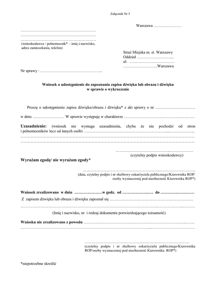 Załącznik Nr 5 Warszawa ………………… ………………………………………………… ………………………………………………… ………………………………………………… (wnioskodawca / pełnomocnik* – imię i nazwisko, adres zamieszkania, telefon) Straż Miejska m. st. Warszawy Oddział …………….……….... ul. ……………….…………… ……………………..Warszawa Nr sprawy : ……………………………………….. Wniosek o udostępnienie do zapoznania zapisu dźwięku lub obrazu i dźwięku w sprawie o wykroczenie Proszę o udostępnienie zapisu dźwięku/obrazu i dźwięku* z akt sprawy o nr ………………………… w dniu …………………… W sprawie występuję w charakterze ……………………….…………….….…… (wniosek nie wymaga uzasadnienia, chyba że nie pochodzi od stron i pełnomocników lecz od innych osób) …………………………………………………...……………... Uzasadnienie: ………………………………………………………………………………………………………… ………………………………………………………………………………………………………… …………………………………..……………… (czytelny podpis wnioskodawcy) Wyrażam zgodę/ nie wyrażam zgody* ……………………………………………..……………………. (data, czytelny podpis i nr służbowy oskarżyciela publicznego/Kierownika ROP/ osoby wyznaczonej pod nieobecność Kierownika ROP*) Wniosek zrealizowano w dniu …………………w godz. od ………………..…. do ………….…….…… Z zapisem dźwięku lub obrazu i dźwięku zapoznał się ……………………………………………………… ………………………………………………………………………………………….………………..……… (Imię i nazwisko, nr i rodzaj dokumentu potwierdzającego tożsamość) Wniosku nie zrealizowano z powodu …………………………………………………………………..……. ……………………………………………………………………………………...…………………………… …………………………………….……………………………… (czytelny podpis i nr służbowy oskarżyciela publicznego/Kierownika ROP/osoby wyznaczonej pod nieobecność Kierownika ROP*) *niepotrzebne skreślić