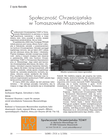 Z życia Kościała Społeczność Chrześcijańska w Tomaszowie Mazowieckim S fot. PROeM połeczność Chrześcijańska TOMY w Tomaszowie Mazowieckim to pierwszy w naszej wspólnocie kościelnej i chyba w kraju lokalny zbór, który powstał w wyniku działań organizacji parakościelnej. Ale po kolei... W październiku 2000 roku Fundacja PROeM (wtedy jeszcze pod nazwą „Słowo Życia”) zakupiła w Zakościelu ośrodek, z przeznaczeniem na Centrum Chrześcijańskie. Ośrodek wymagał kapitalnego remontu, ale już latem 2001 odbyły się tam pierwsze obozy dla dzieci i młodzieży. Prężnie działający ośrodek rozwijał swą działalność. Jedną z nowych inicjatyw było otwarcie w październiku 2003 roku Centrum Chrześcijańskiego TOMY w Tomaszowie Mazowieckim przy ul. Głowackiego. Jego celem jest tworzenie chrześcijańskiej alternatywy dla dzieci, młodzieży i dorosłych poprzez kawiarnię internetową, zajęcia dla dzieci, treningi koszykówki, piłki nożnej i baseballa, szkołę języka angielskiego Speak Up, warsztaty artystyczne, koncerty, wystawy, wieczory poezji, spotkania dla kobiet. Przy współpracy z Bankiem Żywności oraz lokalnymi organizacjami społecznymi TOMY udziela regularnej pomocy żywnościowej. W marcu 2004 roku odbyło się tam pierwsze nabożeństwo. – Od samego początku marzyliśmy, aby to miejsce w ciągu kilku lat zamieniło się w chrześcijański Aktualne wynajmowane miejsce zgromadzeń Kościół. Nie mieliśmy pojęcia, jak przyjmą nas ludzie, władze miasta, okoliczne kościoły. Ale zaryzykowaliśmy, z pokorą, ale jednocześnie z pełną determinacją – wspomina John Crozier, kierownik TOMY. Nabożeństwa odbywają się w każdą niedzielę o godz. 10.00. Uczestniczą w nich również mieszkańcy Tomaszowa. Średnia frekwencja – 40 osób. 1 lutego 2006 roku – na mocy uchwały Rady MOTTO Krajowej – Społeczność Chrześcijańska TOMY Zachwyceni Bogiem. Zatroskani o ludzi. w Tomaszowie Mazowieckim stała się samodzielnym zborem naszego Kościoła. Pełniącym WIZJA obowiązki pastora przełożonego jest Rafał Poznawać Chrystusa i czynić Go znanym Piekarski, a Radę Starszych Zboru tworzą: John wśród mieszkańców Tomaszowa Mazowieckiego. Crozier, Hubert Sajda i Daniel Wawrzyniak. Planują już podjęcie działań ewangelizacyjnych CEL w pobliskim Opocznie. Zabiegają też o własną Budować w Tomaszowie Mazowieckim wspólnotę ludzi siedzibę. Jeśli Bóg pozwoli, będzie nią byłe kino zbawionych z Łaski, żyjących Wiarą, znanych z Miłości, Mazowsze na ul. Jerozolimskiej. Mają wspaniałą opowiadających o Nadziei, którą jest Chrystus (Ef 2:8; 1 Tes 1:3). wizję zagospodarowania tego obiektu... (red.) Społeczność Chrześcijańska TOMY ul. Bartosza Głowackiego 23 97-200 Tomaszów Mazowiecki tel. 0-44 724 48 33 22 e-mail: [email protected] S£O WO i ¯ YCI E nr 3/2006