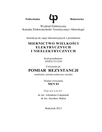 Białostocka Politechnika Wydział Elektryczny Katedra Elektrotechniki Teoretycznej i Metrologii Instrukcja do zajęć laboratoryjnych z przedmiotu MIERNICTWO WIELKOŚCI ELEKTRYCZNYCH I NIEELEKTRYCZNYCH Kod przedmiotu: ENS1C511254 Ćwiczenie pt. POMIAR REZYSTANCJI (multimetr, metoda techniczna, mostek) Numer ćwiczenia MEN 03 Opracował: dr inż. Arkadiusz Łukjaniuk dr inż. Jarosław Makal Białystok 2013 Wszystkie prawa zastrzeżone. Wszystkie nazwy handlowe i towarów występujące w niniejszej instrukcji są znakami towarowymi zastrzeżonymi lub nazwami zastrzeżonymi odpowiednich firm odnośnych właścicieli. Celem ćwiczenia jest nabycie umiejętności poprawnego wyboru metody pomiaru rezystancji w zależności od posiadanych przyrządów, jej wartości oraz wymaganej dokładności wyniku pomiaru 1. WSTĘP Pomiary rezystancji są zagadnieniami bardzo ważnymi zarówno w przemyśle jak i w życiu codziennym. Od poprawnego pomiaru tej wielkości zależy działanie wielu urządzeń, systemów zabezpieczeń, szybkie przeprowadzenie napraw urządzeń, itp. Pomiar wartości rezystancji możemy wykonać za pomocą: multimetru cyfrowego (funkcja pomiaru rezystancji); mostka (technicznego lub laboratoryjnego; metody technicznej. Wybór metody pomiaru zależy od wielu czynników, np. jaki rząd wielkości reprezentuje badana rezystancja, potrzebna dokładność, z jaką chcemy ją zmierzyć, czy też posiadany do dyspozycji sprzęt pomiarowy. 2. CYFROWY POMIAR REZYSTANCJI Cyfrowy pomiar rezystancji polega na przetworzeniu jej na napięcie stałe. Na mierzonej rezystancji wywoływany jest spadek napięcia przez prąd pochodzący z wbudowanego w multimetrze źródła prądowego. Sposób podłączenia przewodów do multimetru podczas pomiaru rezystancji pokazany jest na rys.1. Przełącznik funkcyjny powinien znajdować się w pozycji oznaczonej symbolem „Ω”. Przed rozpoczęciem pomiarów sprawdzamy działanie przyrządu poprzez: zwarcie przewodów podłączeniowych (wtedy na wyświetlaczu powinna pokazać się wartość „0.000” lub „0.001” Ω – rys.1) oraz Laboratorium Miernictwa wielkości elektrycznych … 2 Ćwiczenie MEN 03: Pomiar rezystancji rozwarcie przewodów (na wyświetlaczu powinna pokazać się wartość „0.L” i wartość jednostki MΩ). Rys. 1. Widok multimetru BM 202 przygotowanego do pomiaru rezystancji Pomiar rezystancji, tak jak i innych wielkości mierzonych multimetrem, obarczony jest pewnym błędem. Użytkownik powinien umieć (na podstawie parametrów metrologicznych przyrządu) określić przedział niepewności zmierzonej rezystancji. W tabeli 1 przedstawione zostały (podane przez producenta) parametry metrologiczne przy pomiarze rezystancji multimetrem BM 202. Przykład 1 ilustruje sposób określenia przedziału niepewności mierzonej rezystancji. Tabela 1 BM202 Zakres 250Ω 2,5kΩ 25kΩ,250kΩ, 2,5MΩ 25 MΩ Laboratorium Miernictwa wielkości elektrycznych … 3 Dokładność ±(0,6%w.m.+8c) ±(0,4% w.m.+5c) ±(0,4% wm+2c) ±(1% wm+4c) Ćwiczenie MEN 03: Pomiar rezystancji Przykład 1: Obliczyć względny błąd maksymalny (graniczny), z jakim zmierzono multimetrem BM202 rezystancję RX = 380Ω na zakresie pomiarowym Rn =2,5kΩ. Rozwiązanie: Dla BM 202 producent podaje (tabela 1): ΔRX = ± (%wart. odczytu + ilość cyfr). W naszym przypadku wartość odczytu= 380Ω, wartość jednej cyfry na zakresie 2,500kΩ wynosi 0,001kΩ, czyli 1Ω, stąd: ΔRX= ± (0,4%·380Ω+5·1Ω)= ±6,52Ω≈7Ω. ±(0,004·380Ω+5Ω)= ±(1,52Ω+5Ω)= Założono tu skrajnie niekorzystny przypadek, gdy oba składniki błędu mają ten sam znak. Znajomość tego błędu pozwala na określenie przedziału, w którym z wysoką ufnością (p = 0,9973) zawiera się wartość rzeczywista mierzonej rezystancji: 380Ω – 7Ω ≤ Rx ≤ 380Ω + 7Ω stąd: 373Ω ≤ Rx ≤ 387Ω. Ostatecznie wynik pomiaru rezystancji powinien być zapisany w postaci: Rx=(380±7) Ω Przy pomiarze „małych” rezystancji stosowana jest metoda czteropunktowa pomiaru. Polega ona na zasileniu mierzonego rezystora z oddzielnego źródła prądowego (wbudowanego do multimetru lub zewnętrznego), np. o prądzie znamionowym 10 mA i pomiarze wywołanego tym prądem spadku napięcia woltomierzem (np. na zakresie pomiarowym 100 mV). To dodatkowe źródło prądowe „generuje” prąd o natężeniu 100 razy większym niż źródło wykorzystywane przy pomiarze dużych rezystancji. Zaciski wyjściowe tego źródła (wbudowanego do multimetru) znajdują się na tylnej ściance przyrządu. W tej metodzie wymagane jest użycie czterech przewodów łączących. Dwa z nich doprowadzają do rezystora prąd ze źródła prądowego, dwa pozostałe doprowadzają zaś powstały spadek napięcia do zacisków woltomierza (rys.2). Laboratorium Miernictwa wielkości elektrycznych … 4 Ćwiczenie MEN 03: Pomiar rezystancji IP =10mA ZACISKI WYJŚCIOWE ŹRÓDŁA PRĄDOWEGO RX UX V560 ZACISKI WEJŚCIOWE WOLTOMIERZA UN = 100 mV Rys. 2. Schemat układu do pomiaru rezystancji metodą czteropunktową (multimetr V560). 3. METODY ZEROWE (MOSTKI) Pomiar rezystancji mostkami zalicza się do metod zerowych. Cechą metod zerowych jest eliminacja wpływu elektrycznych przyrządów zarówno wskazówkowych jak i cyfrowych na wartość błędu pomiaru rezystancji. Mostki do pomiaru rezystancji dzielą się na: Wheatstone’a (pomiar z wysoką dokładnością rezystancji z przedziału od ok. 1 Ω do ok. 10 MΩ); Thomsona (Kelvina) - pozwala na pomiar rezystancji w zakresie 0,000001 Ω – 10 Ω. Wymienione mostki mogą być laboratoryjne lub techniczne. Na rys. 3 przedstawiony jest schemat ideowy mostka Wheatstone’a. Oprócz rezystora mierzonego Rx występują w nim trzy rezystory wewnętrzne: R2, R3, R4 o regulowanych wartościach. W przekątnej pionowej A-B mostka znajduje się detektor zera (galwanometr magnetoelektryczny G). Zadaniem galwanometru jest wskazywanie stanu równowagi mostka, to znaczy stanu, w którym różnica poten