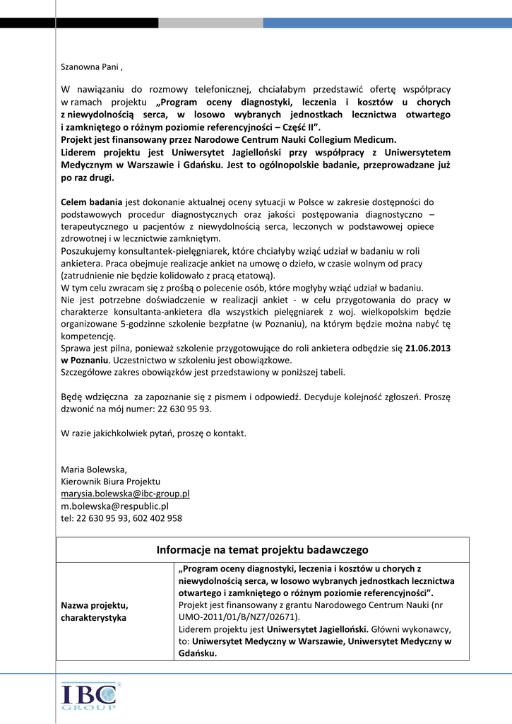 Szanowna Pani , W nawiązaniu do rozmowy telefonicznej, chciałabym przedstawić ofertę współpracy w ramach projektu „Program oceny diagnostyki, leczenia i kosztów u chorych z niewydolnością serca, w losowo wybranych jednostkach lecznictwa otwartego i zamkniętego o różnym poziomie referencyjności – Część II”. Projekt jest finansowany przez Narodowe Centrum Nauki Collegium Medicum. Liderem projektu jest Uniwersytet Jagielloński przy współpracy z Uniwersytetem Medycznym w Warszawie i Gdańsku. Jest to ogólnopolskie badanie, przeprowadzane już po raz drugi. Celem badania jest dokonanie aktualnej oceny sytuacji w Polsce w zakresie dostępności do podstawowych procedur diagnostycznych oraz jakości postępowania diagnostyczno – terapeutycznego u pacjentów z niewydolnością serca, leczonych w podstawowej opiece zdrowotnej i w lecznictwie zamkniętym. Poszukujemy konsultantek-pielęgniarek, które chciałyby wziąć udział w badaniu w roli ankietera. Praca obejmuje realizacje ankiet na umowę o dzieło, w czasie wolnym od pracy (zatrudnienie nie będzie kolidowało z pracą etatową). W tym celu zwracam się z prośbą o polecenie osób, które mogłyby wziąć udział w badaniu. Nie jest potrzebne doświadczenie w realizacji ankiet - w celu przygotowania do pracy w charakterze konsultanta-ankietera dla wszystkich pielęgniarek z woj. wielkopolskim będzie organizowane 5-godzinne szkolenie bezpłatne (w Poznaniu), na którym będzie można nabyć tę kompetencję. Sprawa jest pilna, ponieważ szkolenie przygotowujące do roli ankietera odbędzie się 21.06.2013 w Poznaniu. Uczestnictwo w szkoleniu jest obowiązkowe. Szczegółowe zakres obowiązków jest przedstawiony w poniższej tabeli. Będę wdzięczna za zapoznanie się z pismem i odpowiedź. Decyduje kolejność zgłoszeń. Proszę dzwonić na mój numer: 22 630 95 93. W razie jakichkolwiek pytań, proszę o kontakt. Maria Bolewska, Kierownik Biura Projektu [email protected] [email protected] tel: 22 630 95 93, 602 402 958 Informacje na temat projektu badawczego Nazwa projektu, charakterystyka „Program oceny diagnostyki, leczenia i kosztów u chorych z niewydolnością serca, w losowo wybranych jednostkach lecznictwa otwartego i zamkniętego o różnym poziomie referencyjności”. Projekt jest finansowany z grantu Narodowego Centrum Nauki (nr UMO-2011/01/B/NZ7/02671). Liderem projektu jest Uniwersytet Jagielloński. Główni wykonawcy, to: Uniwersytet Medyczny w Warszawie, Uniwersytet Medyczny w Gdańsku. Celem badania jest dokonanie aktualnej oceny sytuacji w Polsce w zakresie dostępności do podstawowych procedur diagnostycznych oraz jakości postępowania diagnostyczno – terapeutycznego u pacjentów z niewydolnością serca, leczonych w podstawowej opiece zdrowotnej i w lecznictwie zamkniętym. Zakres i zasięg projektu: Projekt ogólnopolski, realizowany w 660 ośrodkach lecznictwa (400 ośrodków lecznictwa otwartego oraz 260 ośrodków lecznictwa zamkniętego). Badanie ankietowe metodą wywiadu bezpośredniego przy użyciu Technika badania kwestionariusza papierowego. 1. Udział w (bezpłatnym) szkoleniu dla osób przeprowadzających badania. Szkolenie prowadzone przez doświadczonych trenerów odbędzie się w kilkuosobowej grupie ankieterów z całego województwa. 2. Zrealizowanie ankiet. Biuro projektu pozyskuje wcześniej zgody placówek oraz lekarzy na udział w badaniu. Będzie to polegało na dotarciu do kilku placówek lecznictwa zamkniętego i otwartego i tam: przekazanie lekarzowi do wypełnienia: o 5 ankiet postępowania diagnostyczno-terapeutycznego o 1 ankiety – kwestionariusza wywiadu dla jednostki Zadania pielęgniarekzdrowia konsultantek/ankieterek odebranie powyższych ankiet w umówionym terminie pozyskanie od lekarza kontaktu do 1-3 pacjentów z niewydolnością serca i przeprowadzeniu wywiadu kwestionariuszowego z 1 pacjentem (5 str.) odesłanie ankiet w kopercie zwrotnej do biura projektu w Warszawie (na koszt biura projektu) Szkolenie dla pielęgniarek Wyjaśnienie: 6 ankiet wypełnionych przez lekarza + 1 ankieta z pacjentem wypełniona przez pielęgniarkę = 1 zrealizowana jednostka 1. Termin: 21.06.2013 (piątek) 2. Godziny: 11:00 – 16:00 3. Miejsce szkolenia – miasto główne: Poznań: Centrum Szkoleniowe Sala 29, ul. Święty Marcin 29/8 61-806 Poznań Zwrot kosztów dojazdu – osobom spoza głównych miast zostaną zwrócone koszty dojazdu na szkolenie (w obie strony). Za zrealizowanie 1 jednostki – 70,00 zł netto Wynagrodzenia dla pielęgniarek ankieterek-konsultantek będą takie same we wszystkich województwach na terenie całego kraju. Liczba jednostek otrzymanych do realizacji zależy od wyniku losowania ośrodków lecznictwa w danym obszarze geograficznym. Aby obliczyć kwotę swojego wynagrodzenia należy przemnożyć liczbę jednostek przez 70,00 netto. Wynagrodzenia będą kształtowały się następująco: Zrealizowanie 4 jednostek – 280,00 zł Zrealizowanie 5 jednostek – 350,00 zł Zrealizowanie 6 jednostek – 420,00 zł Zrealizowanie 7 jednostek – 490,00 zł Zrealizowanie 8 jednostek – 560,00 zł Zrealizowanie 9 jednostek – 630,00 zł Wynagrodzenie za realizację Korzyści dla uczestników projektu Zostaną zwrócone koszty dojazdów do miejscowości poza miejscem zamieszkania, gdzie będą realizowane ankiety: 1. 20 zł w przypadku, gdy jednostka badania znajduje się w odległości do 15 km od miejsca zamieszkania Wykonawcy 2. 40 zł w przypadku, gdy jednostka badania znajduje się w odległości do 30 km od miejsca zamieszkania Wykonawcy 3. 60 zł w przypadku, gdy jednostka badania znajduje się w odległości do 45 km od miejsca zamieszkania Wykonawcy 4. 80 zł w przypadku, gdy jednostka badania znajduje się w odległości do 60 km od miejsca zamieszkania Wykonawcy 1. Udział w bezpłatnym szkoleniu przygotowującym do pracy w charakterze ankietera-konsultanta i zdobycie doświadczenia zawodowego 2. Możliwość znalezienia się w