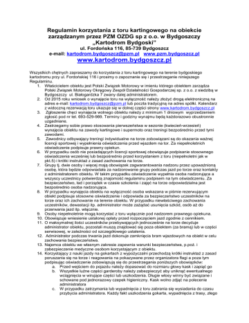 Regulamin korzystania z toru kartingowego na obiekcie zarządzanym przez PZM OZDG sp z o.o. w Bydgoszczy „Kartodrom Bydgoski” ul. Fordońska 116, 85-739 Bydgoszcz e-mail: [email protected] www.pzm.bydgoszcz.pl www.kartodrom.bydgoszcz.pl Wszystkich chętnych zapraszamy do korzystania z toru kartingowego na terenie bydgoskiego kartodromu przy ul. Fordońskiej 116 i prosimy o zapoznanie się i przestrzeganie niniejszego Regulaminu. 1. Właścicielem obiektu jest Polski Związek Motorowy w imieniu którego obiektem zarządza Polski Związek Motorowy Okręgowy Zespół Działalności Gospodarczej sp. z o.o. z siedzibą w Bydgoszczy ul. Białogardzka 7 zwany dalej administratorem. 2. Od 2015 roku wniosek o wynajęcie toru na wyłączność należy złożyć drogą elektroniczną na adres e-mail: [email protected] lub poczta tradycyjną na adres spółki. Kalendarz z widoczną rezerwacją toru ukazuje się w dolnej części strony www.kartodrom.bydgoszcz.pl 3. Zgłoszenie chęci wynajęcia wolnego obiektu należy z minimum 1 dniowym wyprzedzeniem zgłosić pod nr tel. 693-529-989. Terminy i godziny wynajmu będą każdorazowo obustronnie uzgadniane. 4. Zastrzegamy sobie prawo stosowania pierwszeństwa w sezonie (kwiecień-wrzesień) wynajęcia obiektu na zawody kartingowe i supermoto oraz treningi bezpośrednio przed tymi zawodami. 5. Zawodnicy odbywający treningi indywidualne na torze zobowiązani są do okazania ważnej licencji sportowej i wypełnienia oświadczenia przed wjazdem na tor. Za niepełnoletnich oświadczenie podpisuje prawny opiekun. 6. W przypadku osób nie posiadających licencji sportowej obowiązuje podpisanie stosownego oświadczenia wcześniej lub bezpośrednio przed korzystaniem z toru (niepełnoletni jak w pkt.5) i krótki instruktaż z zasad zachowania na torze. 7. Grupy tj. dwie osoby i więcej mają obowiązek zagwarantowania nadzoru przez upoważnioną osobę, która będzie odpowiadała za nadzorowanie grupy podczas jazd po torze oraz kontakty z administratorem obiektu. W takim przypadku oświadczenie wypełnia osoba nadzorująca a wszyscy uczestnicy potwierdzą znajomość regulaminu podpisem na tym oświadczeniu. Za bezpieczeństwo, ład i porządek w czasie szkolenia i zajęć na torze odpowiedzialna jest bezpośrednio osoba nadzorująca. 8. W przypadku wynajęcia obiektu na wyłączność osoba wskazana w piśmie rezerwującym obiekt podpisuje stosowne oświadczenie i odpowiada za bezpieczeństwo uczestników na torze oraz ich zachowanie na terenie obiektu. W przypadku niewłaściwego zachowania uczestników, dewastacji itp. administrator może zażądać usunięcia szkód, osób aż do przerwania jazd itp. włącznie. 9. Osoby niepełnoletnie mogą korzystać z toru wyłącznie pod nadzorem prawnego opiekuna. 10. Obowiązuje wniesienie ustalonej opłaty przed rozpoczęciem jazd zgodnie z cennikiem. 11. O maksymalnej ilości uczestników przebywających jednocześnie na torze decyduje administrator obiektu, pozostali muszą znajdować się poza obiektem (za bramą) lub w części serwisowej, w zależności od szczegółowego ustalenia. 12. Administrator podczas trwania jazd dokonuje zamknięcia bram wjazdowych na obiekt w celu zachowania bezpieczeństwa. 13. Najemca obiektu we własnym zakresie zapewnia warunki bezpieczeństwa, p.poż. i zabezpieczenie medyczne osobom korzystającym z obiektu. 14. Korzystający z nauki jazdy na gokartach z wypożyczalni przechodzą krótki instruktaż z zasad poruszania się na torze i reagowania na pokazywane przez organizatora flagi a poza tym podpisując oświadczenie zobowiązują się do przestrzegania poniższych obowiązków: a. Przed wejściem do pojazdu należy dopasować do rozmiaru głowy kask i zapiąć go b. Wszystkie luźne części garderoby należy zabezpieczyć aby uniknąć ewentualnego wciągnięcia w wirujące części lub uszkodzenia. Długie włosy winny być związane i schowane pod jednorazowy czepek higieniczny. Kask wolno zdjąć na polecenie administratora c. W przypadku zatrzymania lub wypadnięcia z toru zabrania się wysiadania do czasu przybycia administratora. Każdy fakt uszkodzenia gokarta, wypadnięcia z trasy, złego 15. 16. 17. 18. samopoczucia czy chęci zakończenia jazdy sygnalizujemy podniesieniem ręki i trzymaniem jej w górze do czasu przybycia administratora lub zjazdu z toru. d. Osoby w obuwiu typu laczki czy wysoki obcas nie będą dopuszczone do jazdy e. Zabrania się jednoczesnego dodawania gazu i hamowania (naciskania na dwa pedały naraz) f. Podczas wsiadania i wysiadania należy pamiętać, że tuż obok siedzenia znajduje się silnik z oprzyrządowaniem i jego przypadkowe dotknięcie grozi oparzeniem. Każda osoba korzystająca z toru zobowiązana jest poinformować administratora a wszelkich zauważonych nieprawidłowościach, awariach i uszkodzeniach. Korzystający z toru i gokartów ponoszą pełna odpowiedzialność cywilną i karną za powstałe szkody osobiste i majątkowe poczynione podczas użytkowania toru, gokarta. Administrator jako zarządzający torem nie bierze odpowiedzialności za skutki wypadków powstałych w wyniku nie stosowania się przez Korzystających z toru i gokartów do Regulaminu, nakazów, wskazówek i instruktażu udzielonego przez administratora. W przypadku uszkodzenia gokarta z wypożyczalni administrator nie ma obowiązku zwrotu pieniędzy ani podstawienia następnego gokarta. Integralną częścią niniejszego Regulaminu są: a. Oświadczenie 1 (tor dla gokartów) b. Oświadczenie 2 (tor dla samochodów i motocykli) c. Oświadczenie 3 (wynajęcie toru na wyłączność) d. Cennik zatwierdzony przez Zarząd na dany rok Postanowienia ogólne - na torze obowiązuje kierunek jazdy w lewo tj. odwrotnie do ruchu wskazówek zegara, - jazda pod "prąd" jest surowo wzbroniona, - osoba korzystająca z toru nie może być pod wpływem alkoholu lub środków odurzających, - na torze obowiązuje całkowity zakaz poruszania się pojazdami poza częś