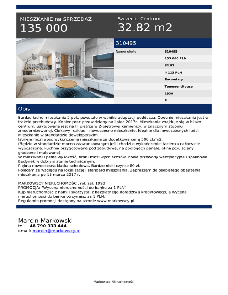 MIESZKANIE na SPRZEDAŻ 135 000 Szczecin, Centrum 32.82 m2 310495 Numer oferty 310495 135 000 PLN 32.82 4 113 PLN Secondary TenementHouse 1930 3 Opis Bardzo ładne mieszkanie 2 pok. powstałe w wyniku adaptacji poddasza. Obecnie mieszkanie jest w trakcie przebudowy. Koniec prac przewidziany na lipiec 2017r. Mieszkanie znajduje się w blisko centrum, usytuowane jest na III piętrze w 2-piętrowej kamienicy, w znacznym stopniu zmodernizowanej. Ciekawy rozkład - nowoczesne mieszkanie. Idealne dla nowoczesnych ludzi. Mieszkanie w standardzie deweloperskim. Istnieje możliwość wykończenia mieszkania za dodatkową cenę 500 zł./m2. (Będzie w standardzie mocno zaawansowanym jeśli chodzi o wykończenie: łazienka całkowicie wyposażona, kuchnia przygotowana pod zabudowę, na podłogach panele, okna pcv, ściany gładzone i malowane). W mieszkaniu pełna wysokość, brak uciążliwych skosów, nowe przewody wentylacyjne i spalinowe. Budynek w dobrym stanie technicznym. Piękna nowoczesna klatka schodowa. Bardzo niski czynsz 80 zł. Polecam ze względu na lokalizację i standard mieszkania. Zapraszam do osobistego obejrzenia mieszkania po 15 marca 2017 r. MARKOWSCY NIERUCHOMOŚCI, rok zał. 1993 PROMOCJA: "Wycena nieruchomości do banku za 1 PLN" Kup nieruchomość z nami i skorzystaj z bezpłatnego doradztwa kredytowego, a wycenę nieruchomości do banku otrzymasz za 1 PLN. Regulamin promocji dostępny na stronie www.markowscy.pl Marcin Markowski tel. +48 790 333 444 email: [email protected] Markowscy Nieruchomości Powered by TCPDF (www.tcpdf.org)