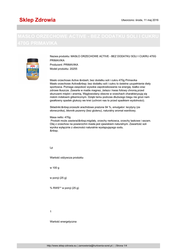 Sklep Zdrowia Utworzono: środa, 11 maj 2016 MASŁO ORZECHOWE ACTIVE - BEZ DODATKU SOLI I CUKRU 470G PRIMAVIKA Nazwa produktu: MASŁO ORZECHOWE ACTIVE - BEZ DODATKU SOLI I CUKRU 470G PRIMAVIKA Producent: PRIMAVIKA Model produktu: 20255 Masło orzechowe Active – bez dodatku soli i cukru 470g Primavika Masło orzechowe Active bez dodatku soli i cukru to świetne uzupełnienie diety sportowca. Pomaga zaspokoić wysokie zapotrzebowanie na energię, białko oraz zdrowe tłuszcze. Zawarte w maśle magnez, żelazo i kwas foliowy chronią przed skurczami mięśni i anemią. Węglowodany obecne w orzechach charakteryzują się niskim indeksem glikemicznym. Dzięki temu podczas dłuższego biegu nie grozi nam gwałtowny spadek glukozy we krwi (uchroni nas to przed spadkiem wydolności). Składniki: orzeszki arachidowe prażone 94 %, emulgator: lecytyny (ze słonecznika), błonnik pszenny (bez glutenu), naturalny aromat waniliowy. Masa netto: 470g Produkt może zawierać migdały, orzechy nerkowca, orzechy laskowe i sezam. Olej z orzechow na powierzchni masła jest zjawiskiem naturalnym. Zawartość soli wynika wyłącznie z obecności naturalnie występującego sodu. Lp Wartość odżywcza produktu w 100 g w porcji (25 g) % RWS** w porcji (25 g) 1 Wartość energetyczna http://www.sklep-zdrowia.eu | [email protected] | | Strona 1/4 Sklep Zdrowia Utworzono: środa, 11 maj 2016 MASŁO ORZECHOWE ACTIVE - BEZ DODATKU SOLI I CUKRU 470G PRIMAVIKA 2638 kJ / 636 kcal 660 kJ / 159 kcal 8% 2 Tłuszcz 52 g 13 g 19% 3 w tym kwasy tłuszczowe nasycone 7g 1,8 g 9% 4 Węglowodany 17 g http://www.sklep-zdrowia.eu | [email protected] | | Strona 2/4 Sklep Zdrowia Utworzono: środa, 11 maj 2016 MASŁO ORZECHOWE ACTIVE - BEZ DODATKU SOLI I CUKRU 470G PRIMAVIKA 4,3 g 2% 5 w tym cukry 3,8 g 1g 1% 6 Białko 25 g 6,3 g 13% 7 Sol 0,04 g 0,01 g http://www.sklep-zdrowia.eu | [email protected] | | Strona 3/4 Sklep Zdrowia Utworzono: środa, 11 maj 2016 MASŁO ORZECHOWE ACTIVE - BEZ DODATKU SOLI I CUKRU 470G PRIMAVIKA 0% Okres przydatności do spożycia od daty produkcji wynosi 9 miesięcy. Na wieczku podana jest data przydatności do spożycia, ktora rownocześnie jest numerem partii. Przechowywać w chłodnym i suchym miejscu. Producent: Primavika Sp. z o.o., ul. Akacjowa 27, 62-023 Gądki Cena: 12.53zł Dostępność: Ten produkt został dodany do sklepu w dniu czwartek, 05 maj 2016 http://www.sklep-zdrowia.eu | [email protected] | | Strona 4/4