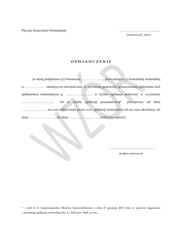 Pieczęć Kancelarii Notarialnej ………………………………. (miejscowość, data) OŚWIADCZENIE Ja niżej podpisana (y) Notariusz ……………….., prowadząca (y) kancelarię notarialną w ……………… niniejszym oświadczam, iż wyrażam gotowość sprawowania patronatu nad aplikantem notarialnym p. …………………… w trybie aplikacji etatowej* w wymiarze ……………………….. lub w trybie aplikacji pozaetatowej* począwszy od dnia ………………….. na czas odbywania przez ww. aplikacji notarialnej lub na czas określony od dnia …………………… do dnia ……………………….(właściwe wybrać). …………………………………… (podpis notariusza) * – vide § 3.1 rozporządzenia Ministra Sprawiedliwości z dnia 17 grudnia 2013 roku w sprawie organizacji i przebiegu aplikacji notarialnej (Dz. U. 2013 poz. 1668 ze zm.)