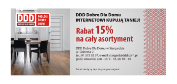 DDD Dobre Dla Domu INTERNETOWI KUPUJ¥ TANIEJ! Rabat 15% na ca³y asortyment DDD Dobre Dla Domu w Stargardzie ul. Gdañska 2 tel.: 91 573 92 97, e-mail: [email protected] godz. otwarcia: pon - pt: 9 - 18, sb: 10 - 14 Rabat nie ³¹czy siê z innymi promocjami.