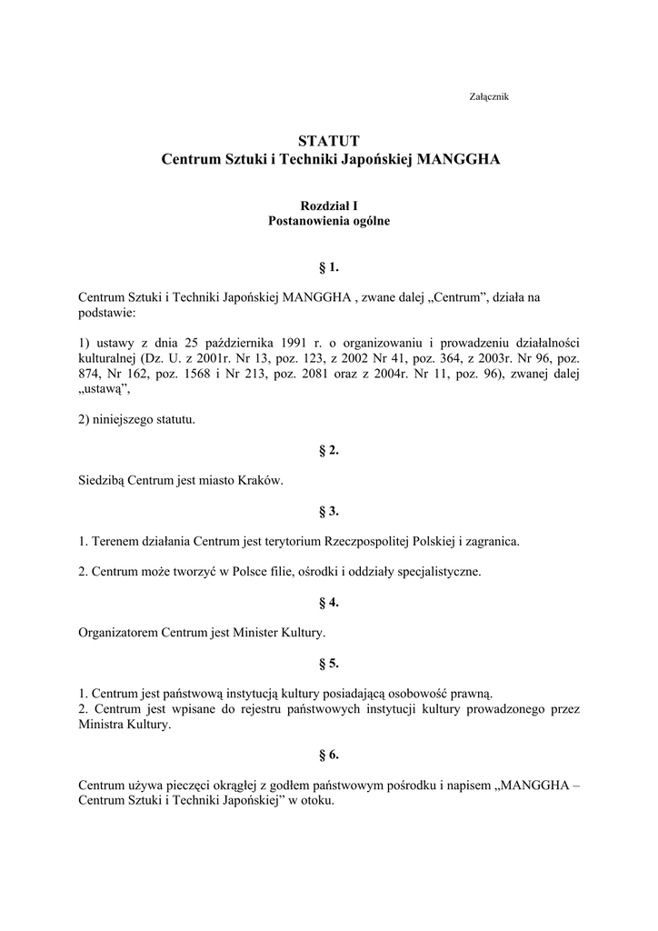 Załącznik STATUT Centrum Sztuki i Techniki Japońskiej MANGGHA Rozdział I Postanowienia ogólne § 1. Centrum Sztuki i Techniki Japońskiej MANGGHA , zwane dalej „Centrum”, działa na podstawie: 1) ustawy z dnia 25 października 1991 r. o organizowaniu i prowadzeniu działalności kulturalnej (Dz. U. z 2001r. Nr 13, poz. 123, z 2002 Nr 41, poz. 364, z 2003r. Nr 96, poz. 874, Nr 162, poz. 1568 i Nr 213, poz. 2081 oraz z 2004r. Nr 11, poz. 96), zwanej dalej „ustawą”, 2) niniejszego statutu. § 2. Siedzibą Centrum jest miasto Kraków. § 3. 1. Terenem działania Centrum jest terytorium Rzeczpospolitej Polskiej i zagranica. 2. Centrum może tworzyć w Polsce filie, ośrodki i oddziały specjalistyczne. § 4. Organizatorem Centrum jest Minister Kultury. § 5. 1. Centrum jest państwową instytucją kultury posiadającą osobowość prawną. 2. Centrum jest wpisane do rejestru państwowych instytucji kultury prowadzonego przez Ministra Kultury. § 6. Centrum używa pieczęci okrągłej z godłem państwowym pośrodku i napisem „MANGGHA – Centrum Sztuki i Techniki Japońskiej” w otoku. Rozdział II Cel i zakres działania §7. Celem działania Centrum jest propagowanie sztuki, kultury i techniki Japonii i Dalekiego Wschodu w Unii Europejskiej oraz poza jej granicami. §8. Centrum realizuje swoje cele w szczególności przez: 1) tworzenie i realizację projektów oraz programów promocji dawnej i współczesnej sztuki, kultury i techniki Dalekiego Wschodu; 2) prezentowanie i przechowywanie zbiorów sztuki Dalekiego Wschodu znajdujących się w Centrum i przekazanych mu w drodze depozytu przez Muzeum Narodowe w Krakowie; 3) prowadzenie działalności edukacyjnej i informacyjnej; 4) prezentowanie polskich zbiorów sztuki dalekiego Wschodu oraz kolekcji zagranicznych, organizację wystaw i ekspozycji; 5) użyczanie zbiorów własnych; 6) gromadzenie kolekcji, przyjmowanie depozytów i darowizn; 7) spotkania z twórcami i specjalistami sztuki, kultury i techniki Japonii i Dalekiego Wschodu; 8) zajęcia warsztatowe, szkolenia, seminaria, wykłady, konferencje, koncerty, promocje książek, widowiska teatralne, projekcje filmów z zakresu kultury, sztuki i techniki Dalekiego Wschodu; 9) promowanie literatury o tematyce Dalekiego Wschodu; 10) wspieranie działalności badawczej i naukowej w zakresie sztuki, kultury i techniki Dalekiego Wschodu; 11) tworzenie i obsługę internetowego systemu informacyjnego o kulturze Dalekiego Wschodu; 12) współdziałanie z polskimi i zagranicznymi podmiotami publicznymi i prywatnymi; 13) prowadzenie biblioteki i archiwum; 14) opracowywanie ekspertyz, opinii i ocen w zakresie swojej działalności; 15) opracowywanie i archiwizacja polskich kolekcji dawnej sztuki Dalekiego Wschodu. Rozdział III Organy zarządzające i doradcze § 9. Centrum zarządza i reprezentuje je na zewnątrz dyrektor. § 10. Dyrektora Centrum powołuje i odwołuje Minister Kultury. § 11. Do zadań dyrektora Centrum należy realizacja statutowych zadań, a w szczególności: 1) kierowanie całokształtem działalności Centrum, reprezentowanie go na zewnątrz; 2) opracowywanie wieloletnich planów i programów działania Centrum na podstawie wytyczonych przez Radę Programową kierunków działania; 3) opracowywanie rocznego budżetu Centrum, gwarantującego realizację planów statutowych; 4) sporządzanie rocznych sprawozdań finansowych, ich obligatoryjne badanie przez biegłego rewidenta i przedkładanie do zatwierdzenia Ministrowi Kultury; 5) koordynowanie współpracy Centrum z innymi jednostkami działającymi w obszarze celów statutowych, 6) czuwanie nad racjonalnym i efektywnym gospodarowaniem posiadanym mieniem zgodnie z zasadą gospodarności. § 12. 1. 2. 3. 4. 5. 6. 7. 8. Organem opiniodawczo - doradczym dyrektora w sprawach związanych z realizacją statutowego celu działania Centrum jest Rada Programowa zwana dalej "Radą". Członków Rady powołuje Minister Kultury na okres czterech lat. W skład Rady wchodzi dwóch przedstawicieli Fundacji Kyoto-Kraków, dwóch przedstawicieli Ministra Kultury oraz jeden członek niezależny wyznaczany przez Rektora Uniwersytetu Jagiellońskiego. Minister zwołuje, otwiera i przewodniczy pierwszemu posiedzeniu nowo wybranej Rady do chwili wyboru jej przewodniczącego spośród przedstawicieli Fundacji Kyoto-Kraków. Posiedzenia zwołuje co najmniej 1 raz w roku i przewodniczy im przewodniczący Rady bądź osoba przez niego wskazana. W posiedzeniach Rady ma prawo uczestniczyć dyrektor Centrum oraz osoby zaproszone przez przewodniczącego Rady. Z posiedzenia Rady sporządza się protokół, który podpisuje przewodniczący Rady oraz obecni na posiedzeniu członkowie Rady. Członkowie Rady nie pobierają wynagrodzenia z tytułu uczestniczenia w Radzie, mogą jednak otrzymywać zwrot kosztów podróży poniesionych w związku z udziałem w posiedzeniach. Rozdział IV Gospodarka finansowa § 13 1. Centrum prowadzi gospodarkę finansową na zasadach określonych w ustawie. 2. Podstawą gospodarki finansowej Centrum jest plan działalności zatwierdzony przez dyrektora. 3. Centrum może prowadzić działalność gospodarczą zbieżną z celami statutowymi. § 14 1. Przychodami Centrum są dotacje z budżetu, wpływy z prowadzonej działalności statutowej, w tym ze sprzedaży składników majątku ruchomego oraz z najmu i dzierżawy składników majątkowych, środki otrzymane od osób fizycznych i prawnych oraz z innych źródeł. 2. Przychodami Centrum są również wpływy z działalności gospodarczej. 3. Uzyskane przychody Centrum przeznacza na pokrycie kosztów działalności statutowej i zobowiązania. § 15. 1. Do dokonywania czynności prawnych w imieniu Centrum upoważnieni są: dyrektor oraz działający w granicach umocowania główny księgowy. 2. Do samodzielnego dokonywania czynności prawnych w imieniu Centrum upoważniony jest wyłącznie dyrektor. Rozdział V Przepisy końcowe § 16. Wszelkie zmiany statutu mog
