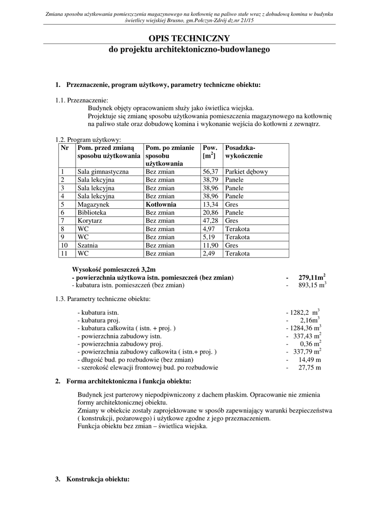 Zmiana sposobu u ytkowania pomieszczenia magazynowego na kotłowni na paliwo stałe wraz z dobudow komina w budynku wietlicy wiejskiej Brusno, gm.Połczyn-Zdrój dz.nr 21/15 OPIS TECHNICZNY do projektu architektoniczno-budowlanego 1. Przeznaczenie, program u ytkowy, parametry techniczne obiektu: 1.1. Przeznaczenie: Budynek obj ty opracowaniem słu y jako wietlica wiejska. Projektuje si zmian sposobu u ytkowania pomieszczenia magazynowego na kotłowni na paliwo stałe oraz dobudow komina i wykonanie wej cia do kotłowni z zewn trz. 1.2. Program u ytkowy: Nr Pom. przed zmian Pom. po zmianie sposobu u ytkowania sposobu u ytkowania 1 Sala gimnastyczna Bez zmian 2 Sala lekcyjna Bez zmian 3 Sala lekcyjna Bez zmian 4 Sala lekcyjna Bez zmian 5 Magazynek Kotłownia 6 Biblioteka Bez zmian 7 Korytarz Bez zmian 8 WC Bez zmian 9 WC Bez zmian 10 Szatnia Bez zmian 11 WC Bez zmian Pow. [m2] Posadzkawyko czenie 56,37 38,79 38,96 38,96 13,34 20,86 47,28 4,97 5,19 11,90 2,49 Parkiet d bowy Panele Panele Panele Gres Panele Gres Terakota Terakota Gres Terakota Wysoko pomieszcze 3,2m - powierzchnia u ytkowa istn. pomieszcze (bez zmian) - kubatura istn. pomieszcze (bez zmian) - 279,11m2 893,15 m3 1.3. Parametry techniczne obiektu: - kubatura istn. - kubatura proj. - kubatura całkowita ( istn. + proj. ) - powierzchnia zabudowy istn. - powierzchnia zabudowy proj. - powierzchnia zabudowy całkowita ( istn.+ proj. ) - długo bud. po rozbudowie (bez zmian) - szeroko elewacji frontowej bud. po rozbudowie - 1282,2 m3 2,16m3 - 1284,36 m3 - 337,43 m2 0,36 m2 - 337,79 m2 - 14,49 m - 27,75 m 2. Forma architektoniczna i funkcja obiektu: Budynek jest parterowy niepodpiwniczony z dachem płaskim. Opracowanie nie zmienia formy architektonicznej obiektu. Zmiany w obiekcie zostały zaprojektowane w sposób zapewniaj cy warunki bezpiecze stwa ( konstrukcji, po arowego) i u ytkowe zgodne z jego przeznaczeniem. Funkcja obiektu bez zmian – wietlica wiejska. 3. Konstrukcja obiektu: Zmiana sposobu u ytkowania pomieszczenia magazynowego na kotłowni na paliwo stałe wraz z dobudow komina w budynku wietlicy wiejskiej Brusno, gm.Połczyn-Zdrój dz.nr 21/15 3.1 Układ konstrukcyjny obiektu pozostaje bez zmian. 3.2 Zało enia przyj te do oblicze - Warunki gruntowo-wodne: Na podstawie odkrywek gruntu do poziomu istniej cych fundamentów i przeprowadzonych bada makroskopowych stwierdzono wyst powanie w poziomie posadowienia istniej cego budynku gruntów no nych w postaci piasków gliniastych. Nie stwierdzono wyst powania wód gruntowych w poziomie posadowienia istniej cych fundamentów. No no gruntu pod fundamentami istniej cymi okre lona na poziomie 200 kN/m2 pozwala na przeniesienie dodatkowych obci e powstałych na wskutek rozbudowy istniej cego obiektu o komin. - Obci enia: • nieg ( II strefa ) • wiatr ( I strefa ) 0,90 kN/m2 0,25 kN/m2 Obliczenia projektowe przeprowadzono z uwzgl dnieniem nast puj cych norm: PN-82/B-02000 – Obci enia budowli. Zasady ustalania warto ci. PN-82/B-02001 – Obci enia budowli. Obci enia stałe. PN-82/B-02003 – Obci enia budowli. Obci enia zmienne technologiczne. Podstawowe obci enia technologiczne i monta owe. PN-80/B-02010 – Obci enia w obliczeniach statycznych. Obci enie niegiem. PN-77/B-02011 – Obci enia w obliczeniach statycznych. Obci enie wiatrem. PN-81/B-03020 – Grunty budowlane. Posadowienie bezpo rednie budowli. Obliczenia statyczne i projektowanie. PN-B-03002:1999 – Konstrukcje murowe niezbrojone. Projektowanie i obliczanie. PN-84/B-03264:1999 – Konstrukcje betonowe, elbetowe i spr one. Obliczenia statyczne i projektowanie. 3.3 Warunki i sposób posadowienia istniej cych i projektowanych elementów obiektu: Obiekt istniej cy posadowiony bezpo rednio na ławach fundamentowych. Projektowan fundamentow i komin posadowi bezpo rednio na stopie fundamentowej. cian 3.4 Kategoria geotechniczna obiektu: Ze wzgl du na wyniki bada makroskopowych gruntu, brak wody gruntowej oraz bezpo redni sposób posadowienia zaliczono obiekt do I kategorii geotechnicznej. 3.5 Ocena stanu technicznego istniej cego budynku wietlicy: W wyniku przeprowadzonej wizji lokalnej stwierdza si , e istniej cy budynek wietlicy jest w dobrym stanie technicznym gruntownie wyremontowany ocieplony i pozwalaj cym na wykonanie projektowanej rozbudowy polegaj cej na dobudowaniu komina i schodów wej ciowych. Stropodach g sto- ebrowy typu DZ z prefabrykowanymi pustakami i belkami oraz monolityczn płyt , jest w stanie technicznym dobrym ,ocieplony i nie wymaga ingerencji w konstrukcj . ciany konstrukcyjne murowane ocieplone warstw 12cm styropianu bez sp ka i rozwarstwie spowodowanych nierównomiernym osiadaniem obiektu pozwalaj na wykonanie otworu wej ciowego do kotłowni z osadzeniem nadpro y prefabrykowanych. Ławy fundamentowe w dobrym stanie technicznym. Dotychczasowy okres u ytkowania obiektu wynosz cy około 25lat pozwala na stwierdzenie, e na wskutek osiadania grunt pod fundamentami budynku został zag szczony a jego no no wzrosła. Zmiana sposobu u ytkowania pomieszczenia magazynowego na kotłowni na paliwo stałe wraz z dobudow komina w budynku wietlicy wiejskiej Brusno, gm.Połczyn-Zdrój dz.nr 21/15 4. Rozwi zania budowlane konstrukcyjno-materiałowe: 4.1. Nadpro a: prefabrykowane typu L19 o dł. 1.2m – 2szt./otwór w cianie zewn trznej kotłowni 4.2. ciany zewn trzne: - nadziemne – gr. 38cm, murowane z cegły ceramicznej pełnej-wyburzenie otworu do kotłowni 4.3. ciany wewn trzne: Zamurowanie otworu bloczkami z gazobetonu (betonu komórkowego) o gr.12cm i 24cm odmiany 07 na zaprawie cem.-wap. marki M3 ( 3,0 MPa ),. 4.4. Trzony kominowe: Zaprojektowano przewód kominowy izolowany z przewietrzeniem np.: w systemie f-my „Schiedel” Rondo Plus 20. Aby przewietrzanie komina było skuteczne i działało w prawidłowy sposób, płyty izolacyjne nale y zako czy ok. 8 cm poni ej górnej kraw dzi pustaka. W przypadku wykonania płyty elbetowej przykrywaj cej na budowie nale y zastosowa stalowy szalunek tracony. 